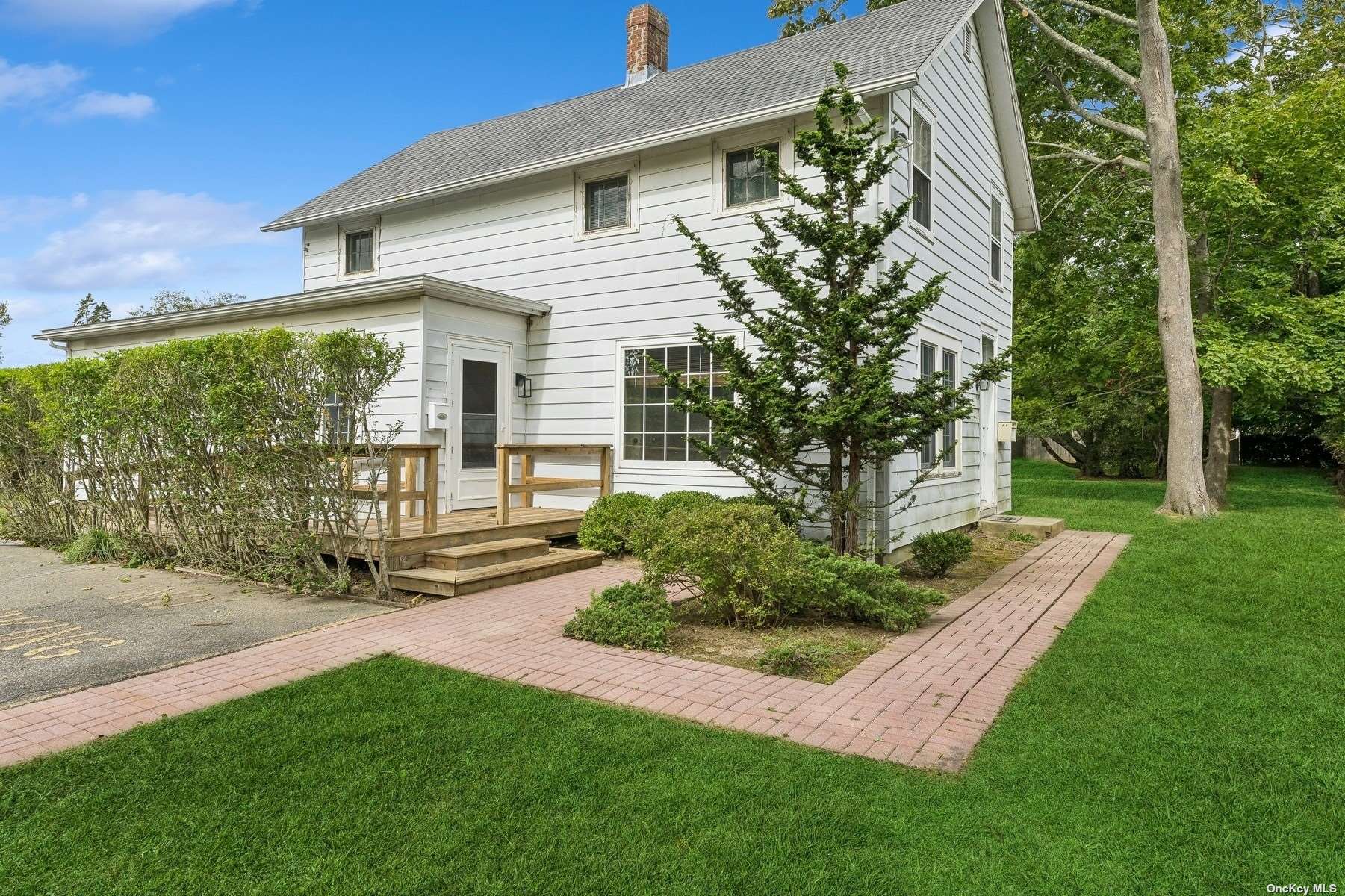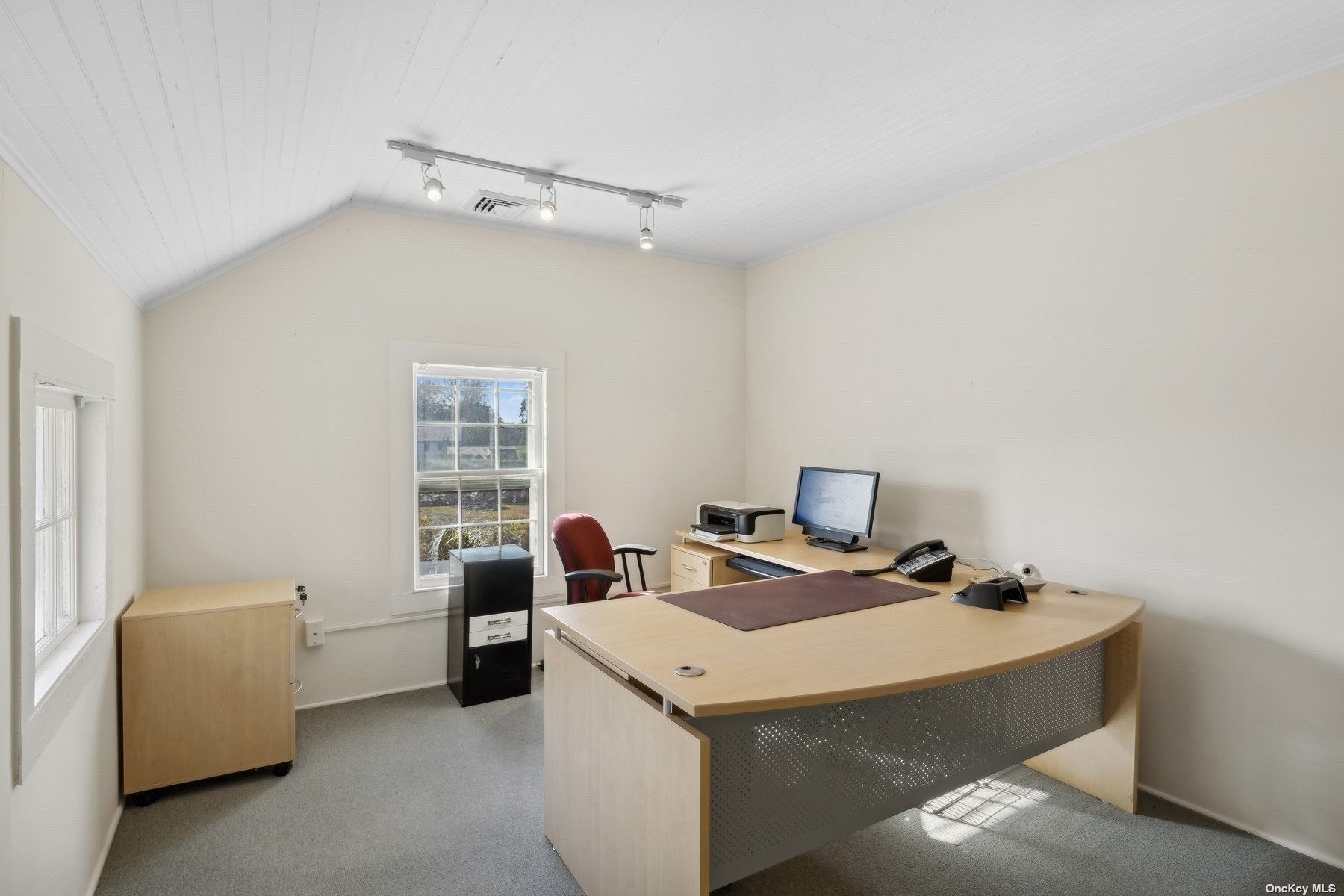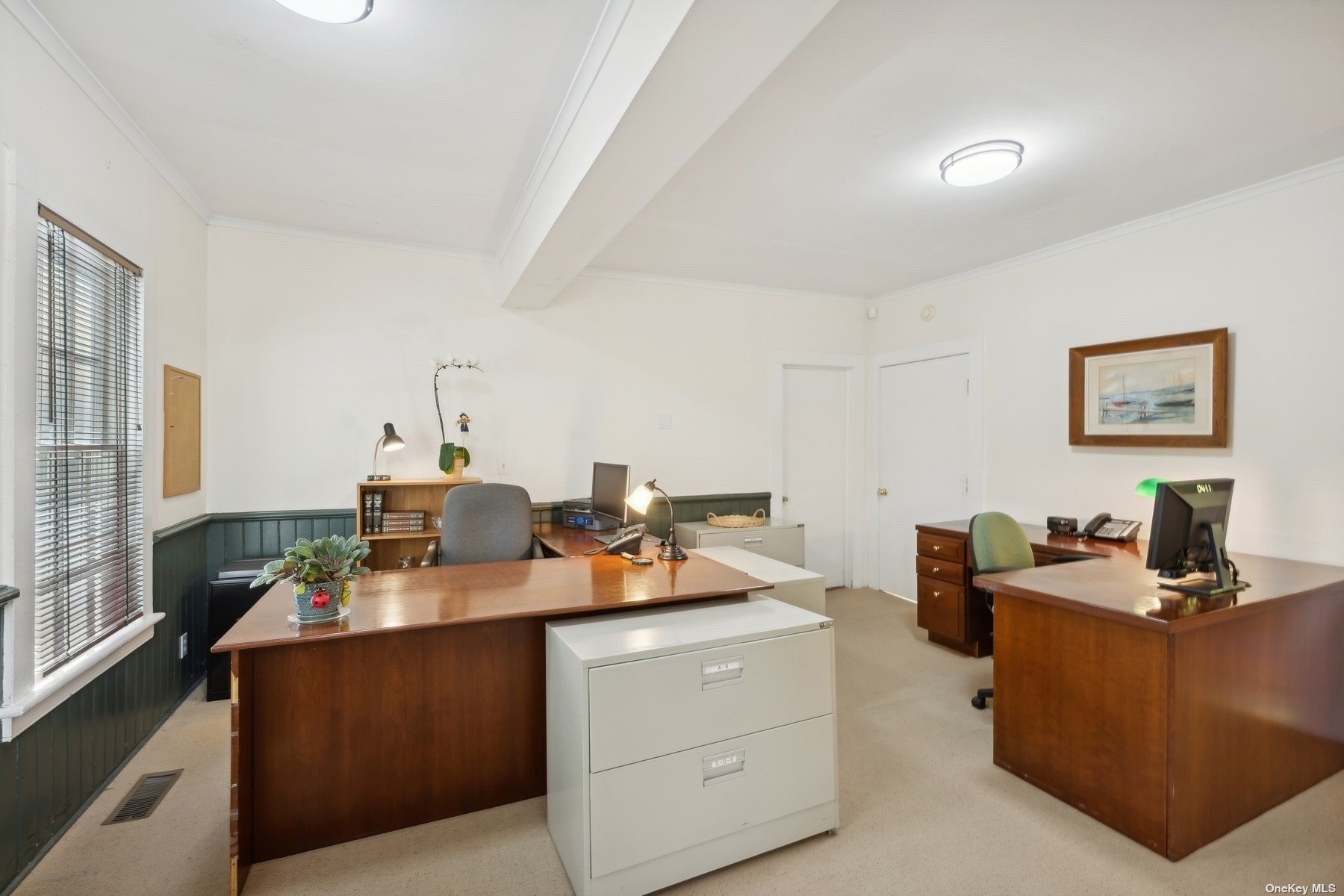 Two-story office building with basement and ample parking.