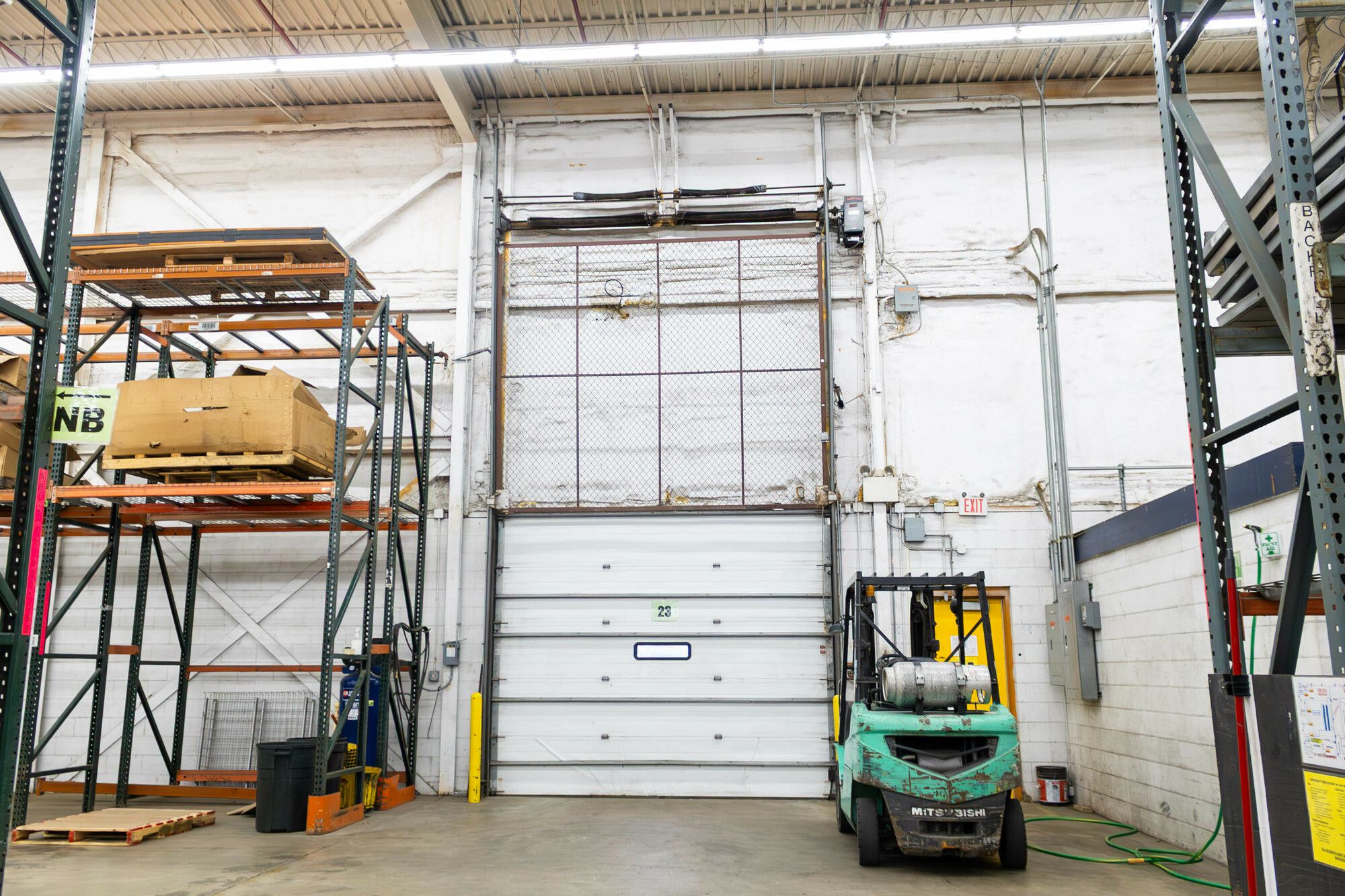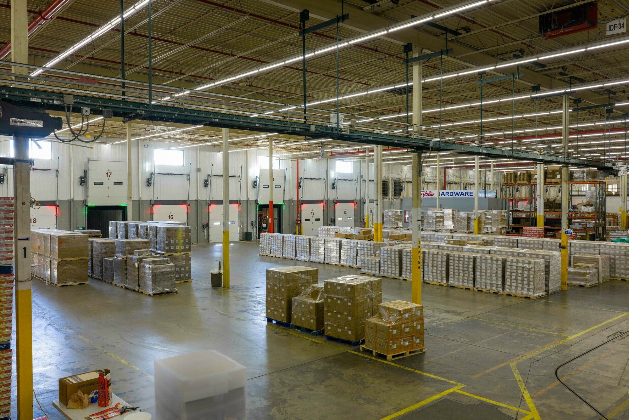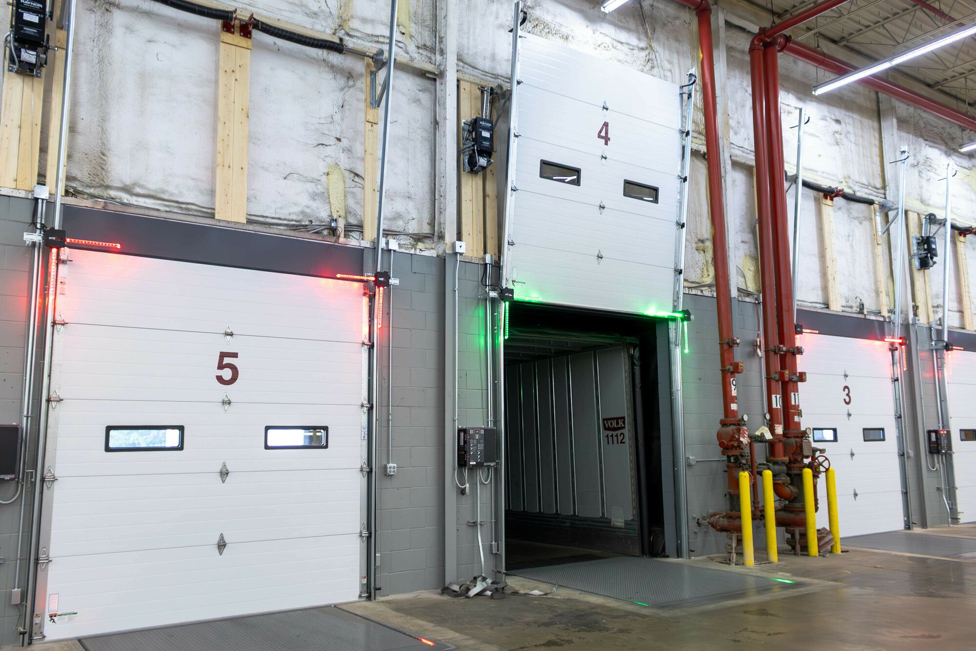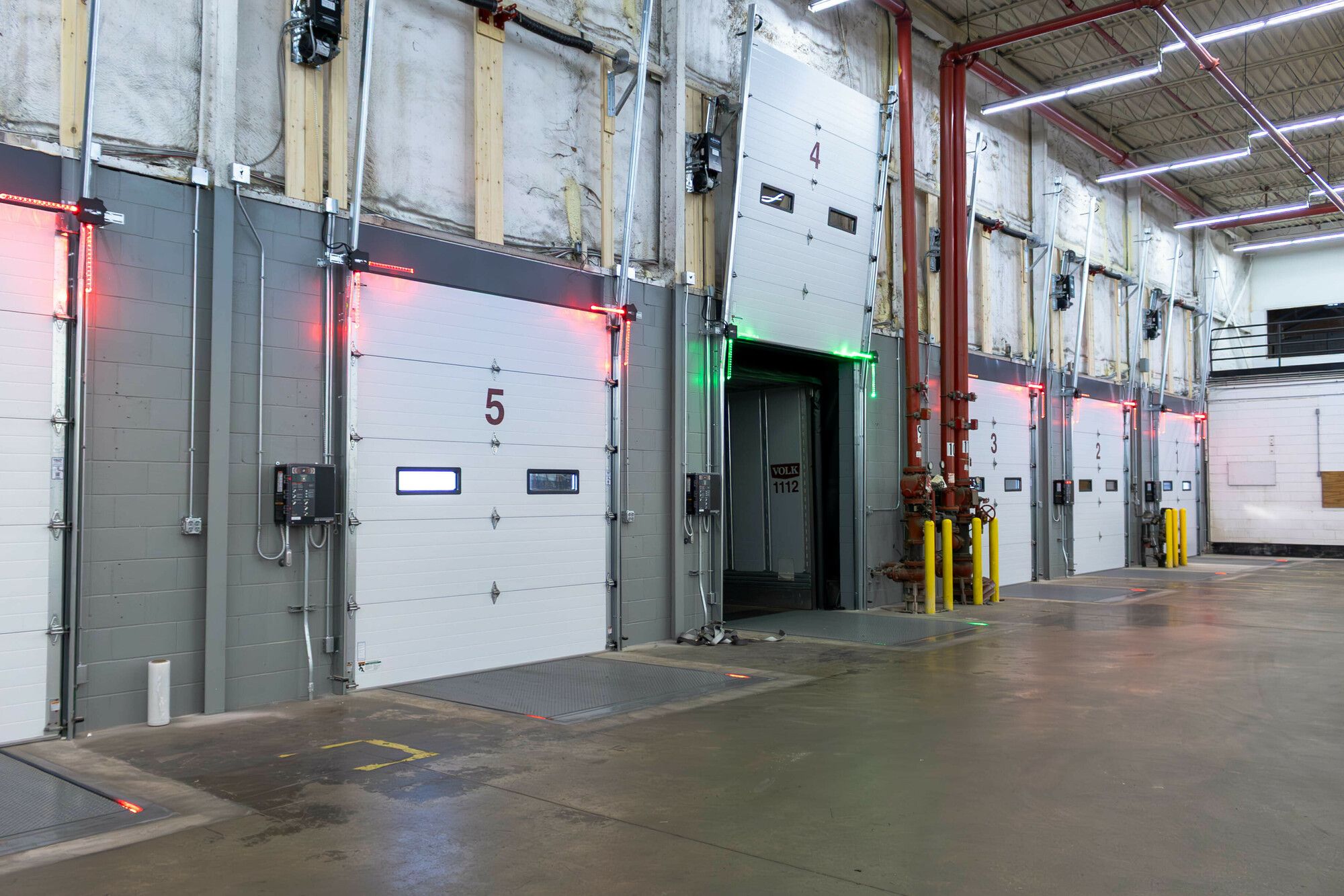 Industrial space with tall ceilings, multiple doors, and loading docks.