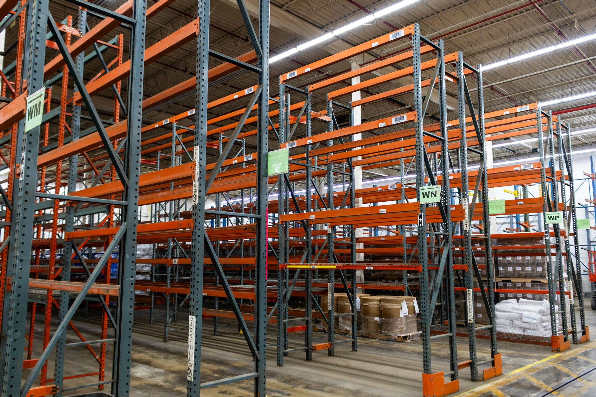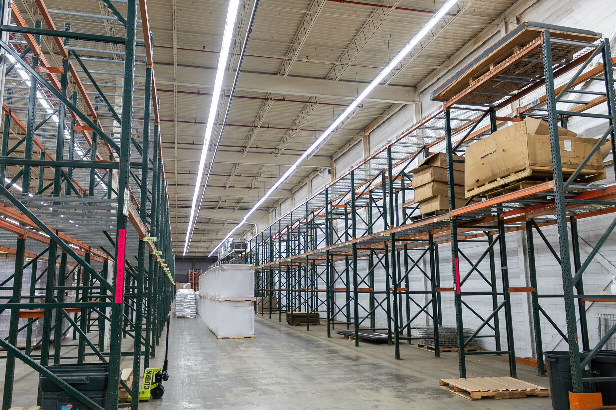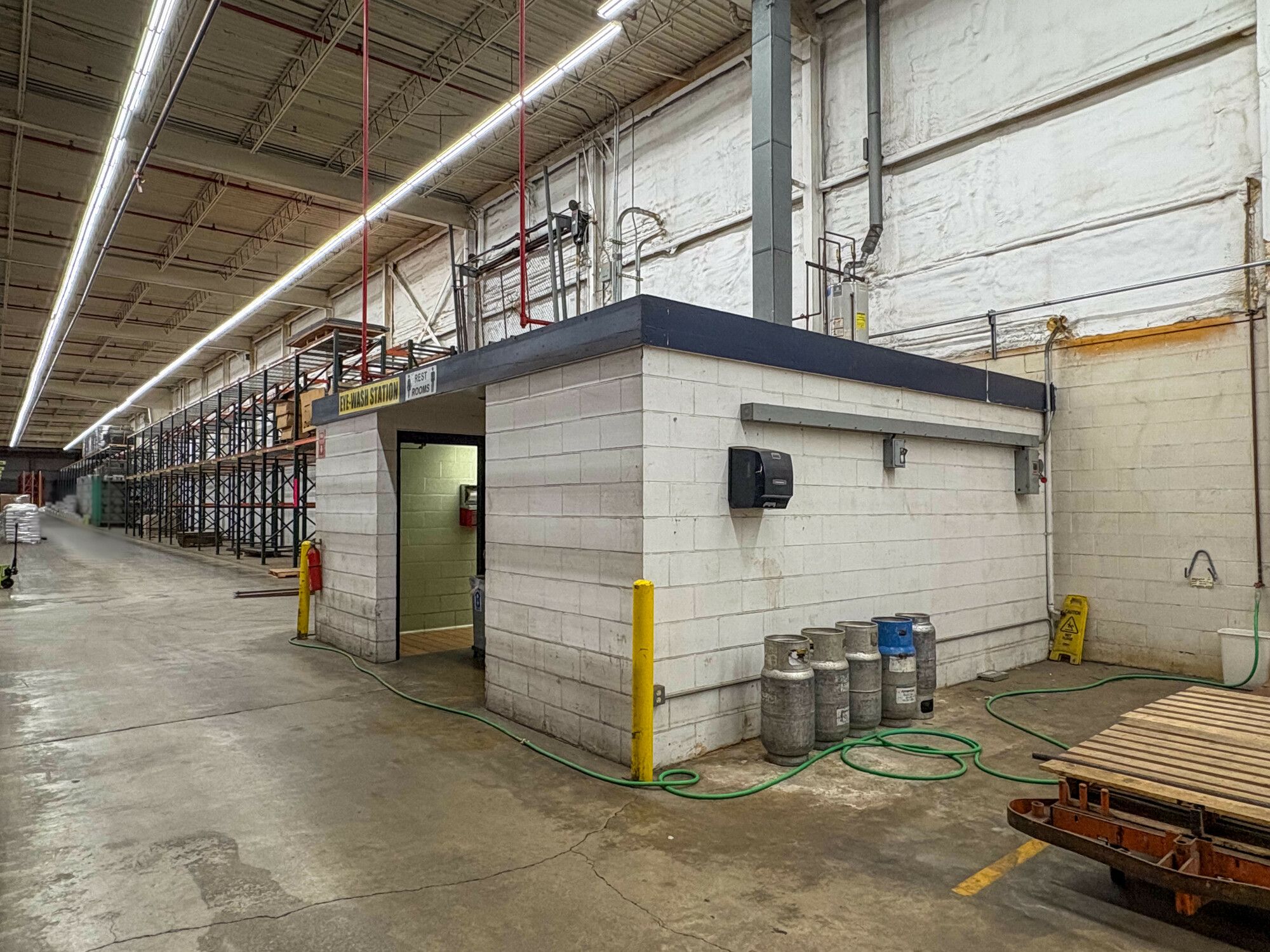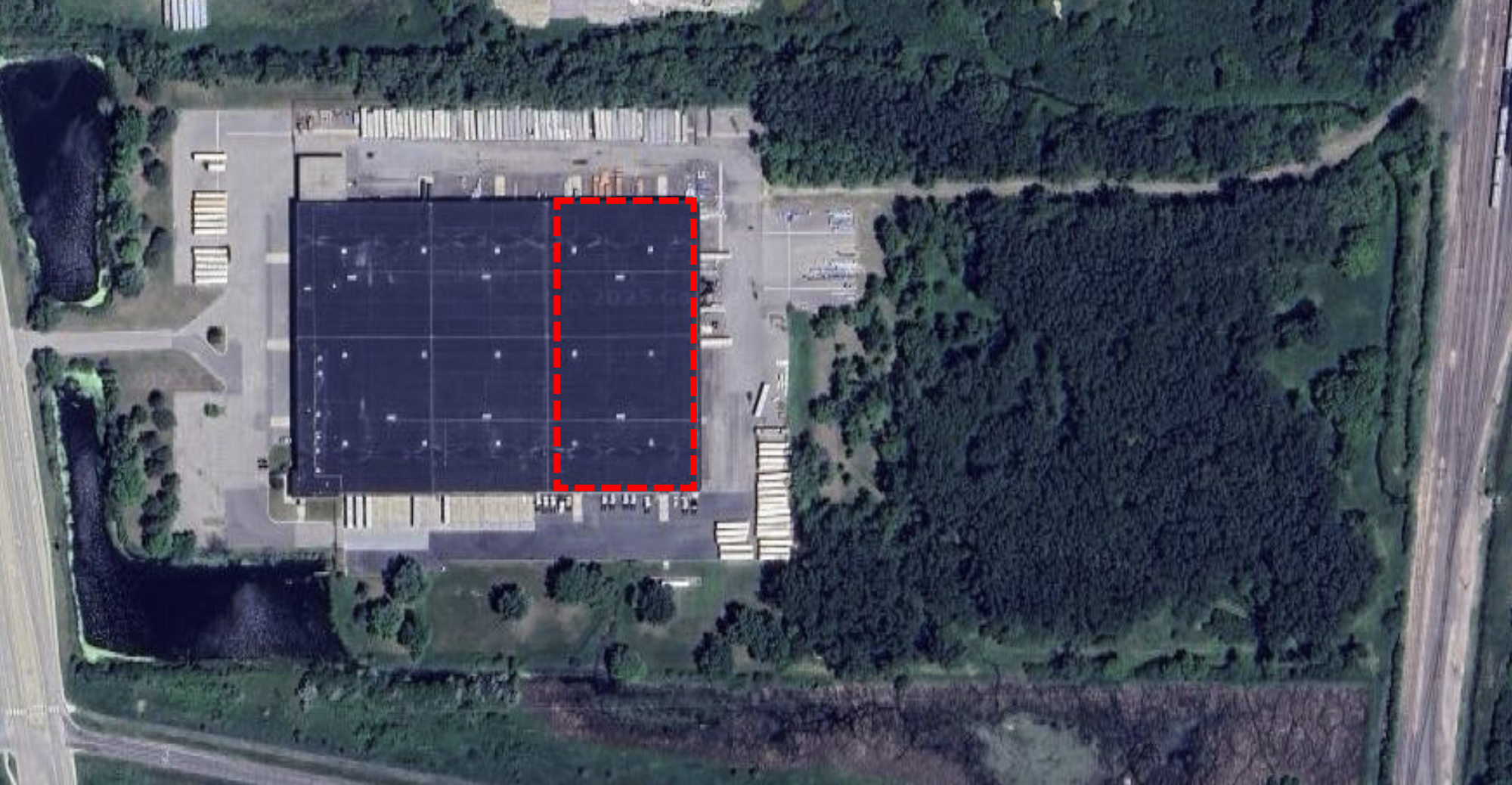 Industrial space with tall ceilings, multiple doors, and loading docks.