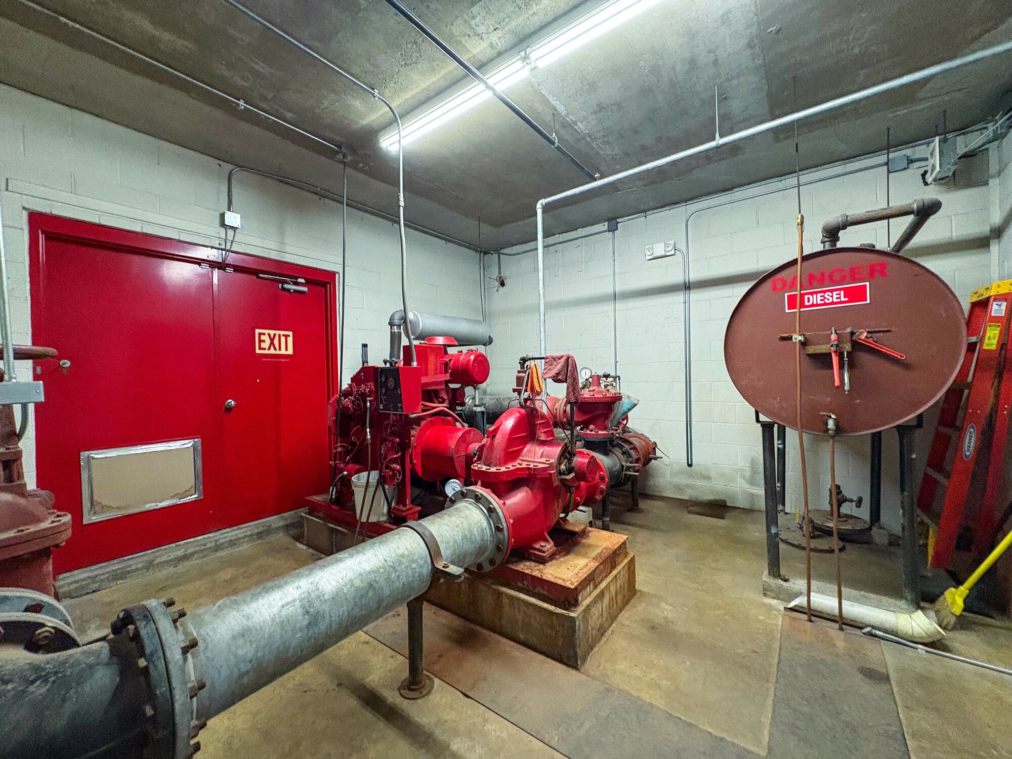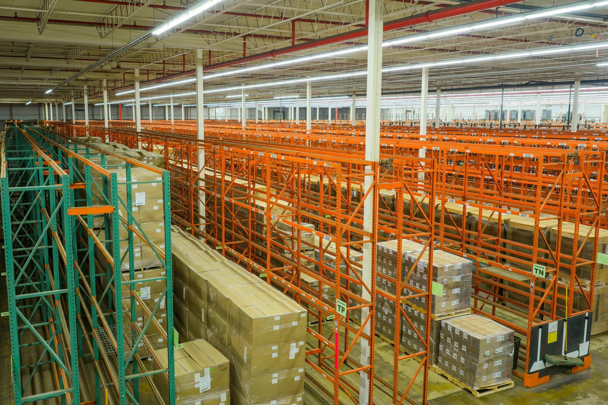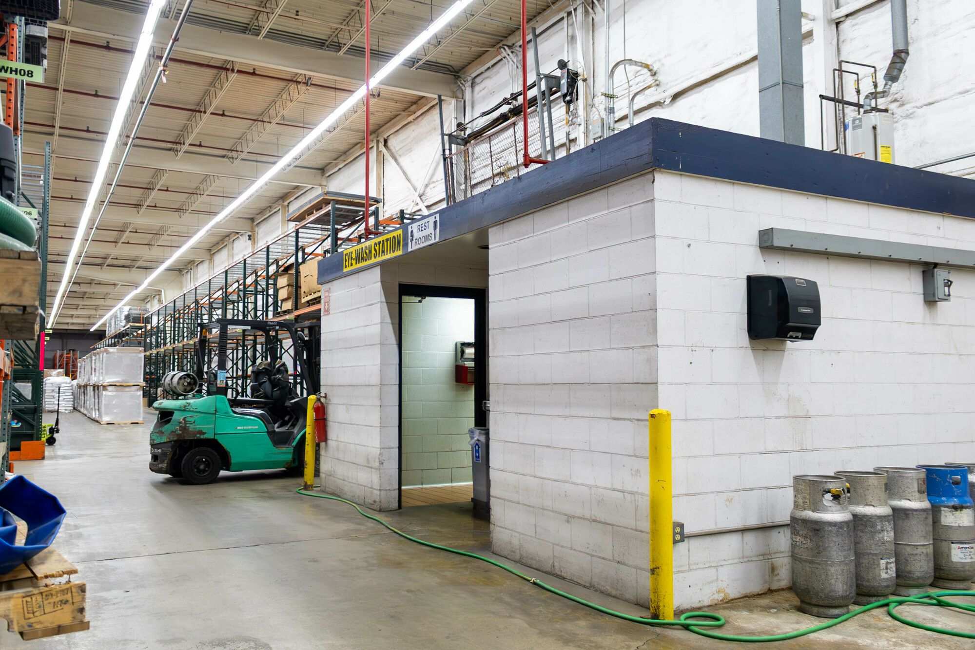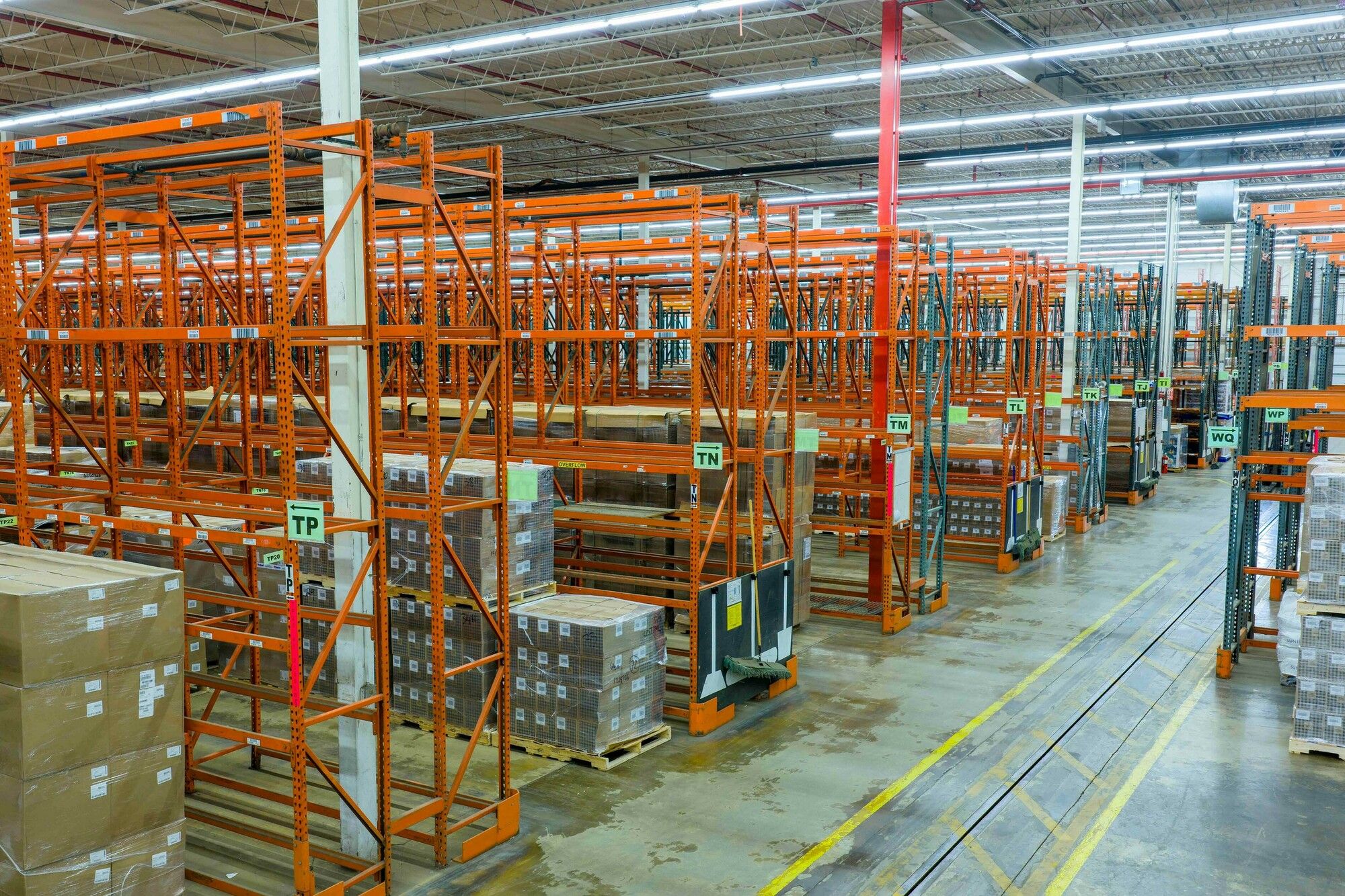 Industrial space with tall ceilings, multiple doors, and loading docks.