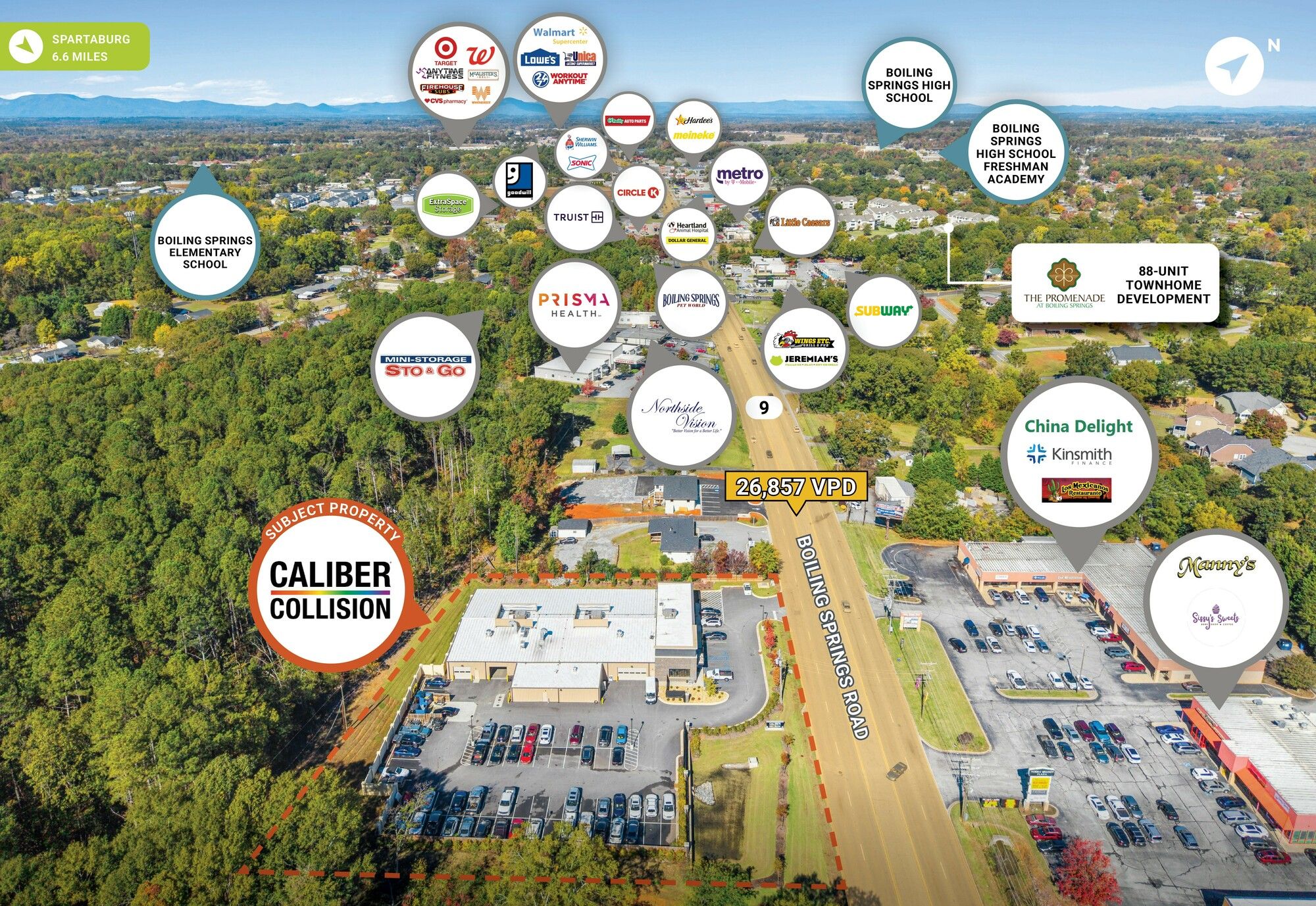 This new construction, build-to-suit property is for sale and features a corporate lease with the nation's largest collision repair provider. The property offers strong tenant credit and long-term income durability within a dynamic growth corridor of South Carolina. The location is Boiling Springs’ only Caliber Collision. The lease is a new 15-year corporate-guaranteed lease to the nation’s largest collision repair provider with an absolute NNN lease structure, meaning zero landlord maintenance, repair, or expense obligations. There are two, 5-year extension options with 10% rental increases every 5 years during the primary term and in each option period. The corporate guaranty is Wand NewCo 3, Inc. Boiling Springs Road is a major arterial connecting directly to Interstate 85, a key logistics corridor running from Atlanta, GA to Charlotte, NC, connecting six major metro areas: Atlanta, Greenville, Spartanburg, Charlotte, Greensboro, and Raleigh-Durham. The Spartanburg MSA is considered one of the fastest growing metros in the U.S. BMW’s largest manufacturing plant in the world is located in Spartanburg; BMW has invested over $10 billion to build this facility, which creates over $20 billion in annual economic impact.