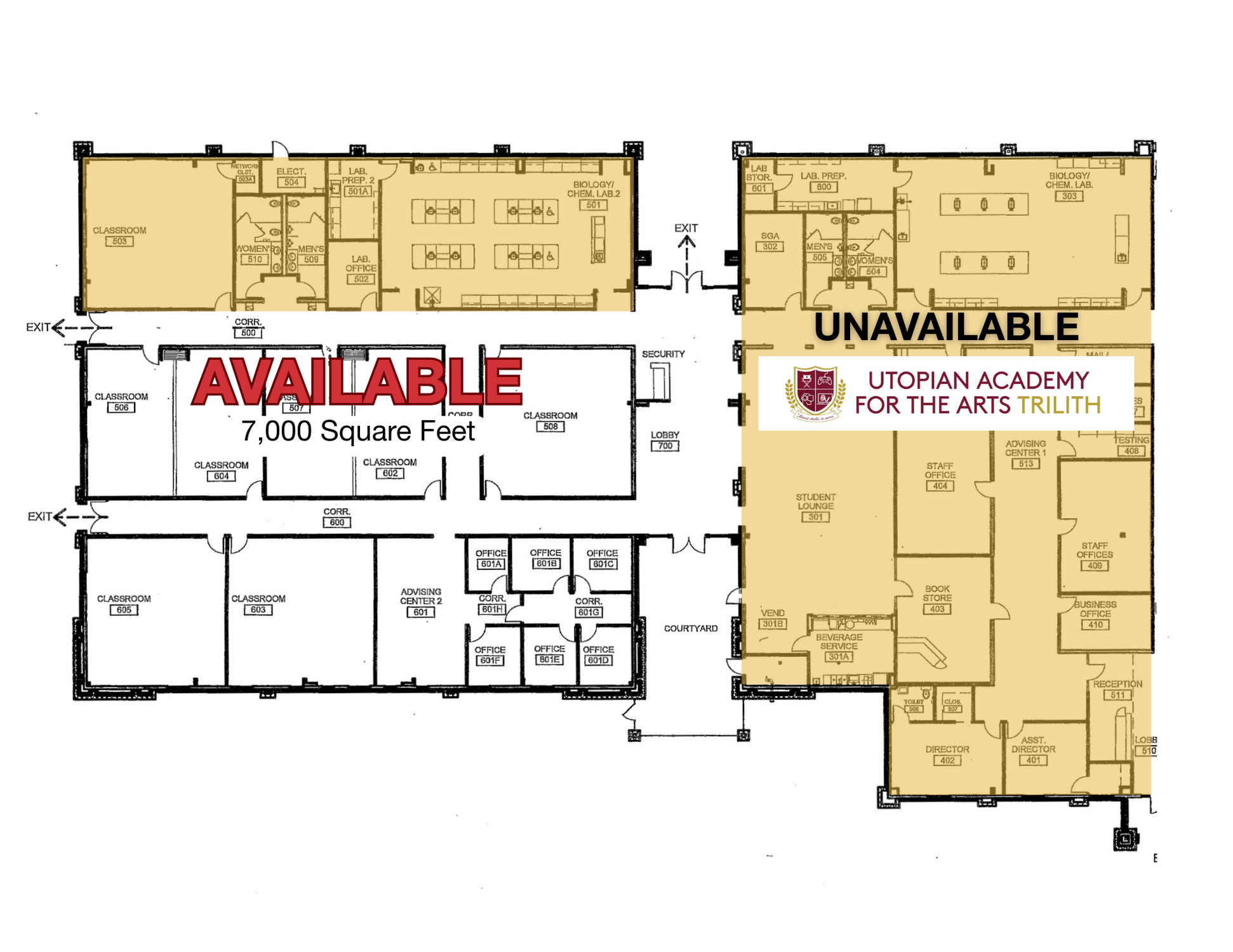 Versatile 7,000 SF space ideal for school or office use.