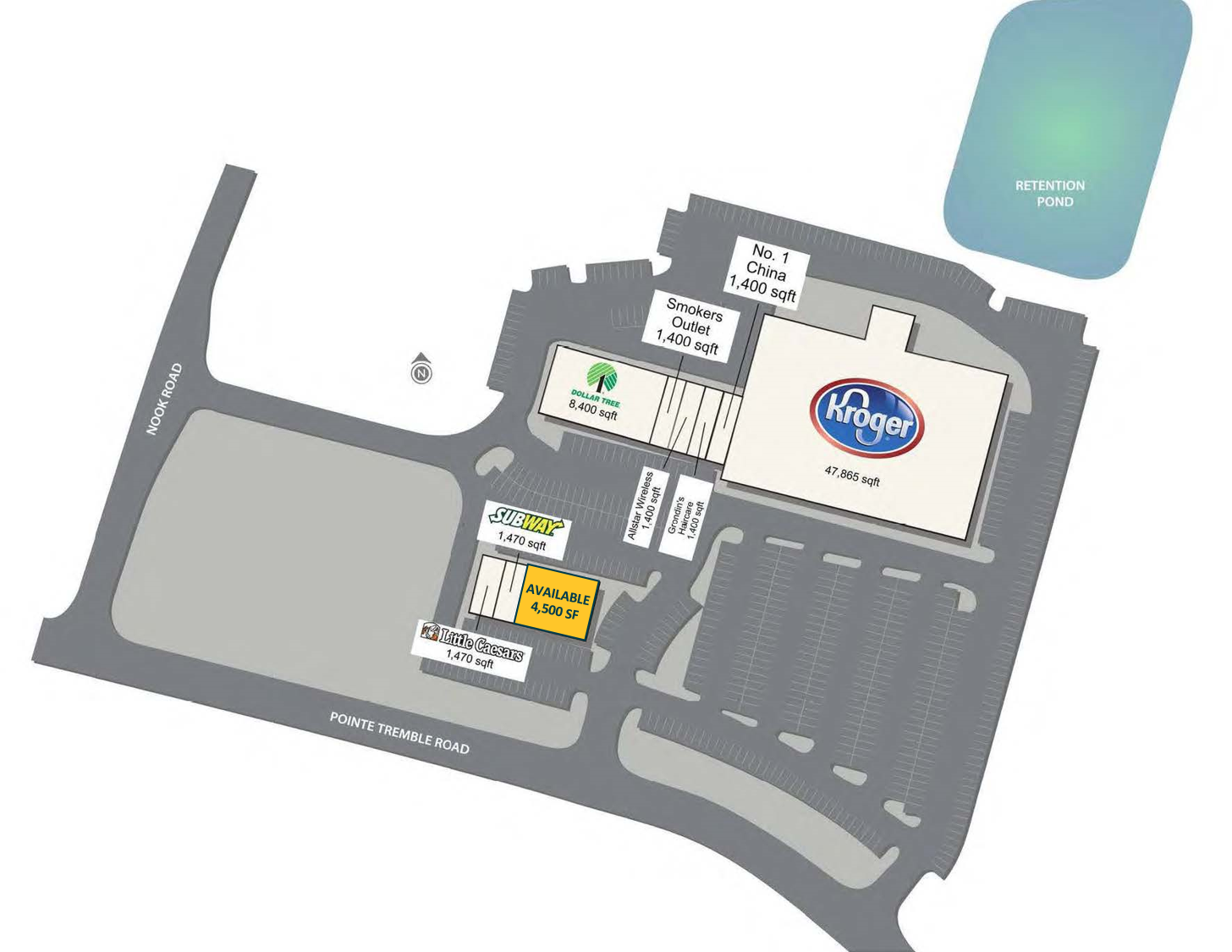 Neighborhood shopping center anchored by Kroger and Dollar Tree.