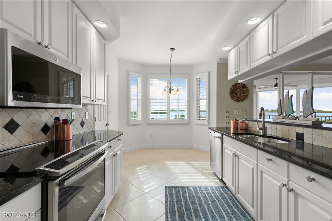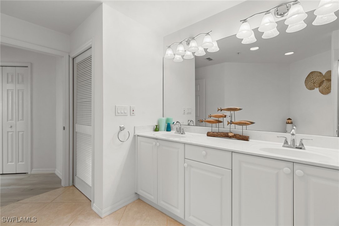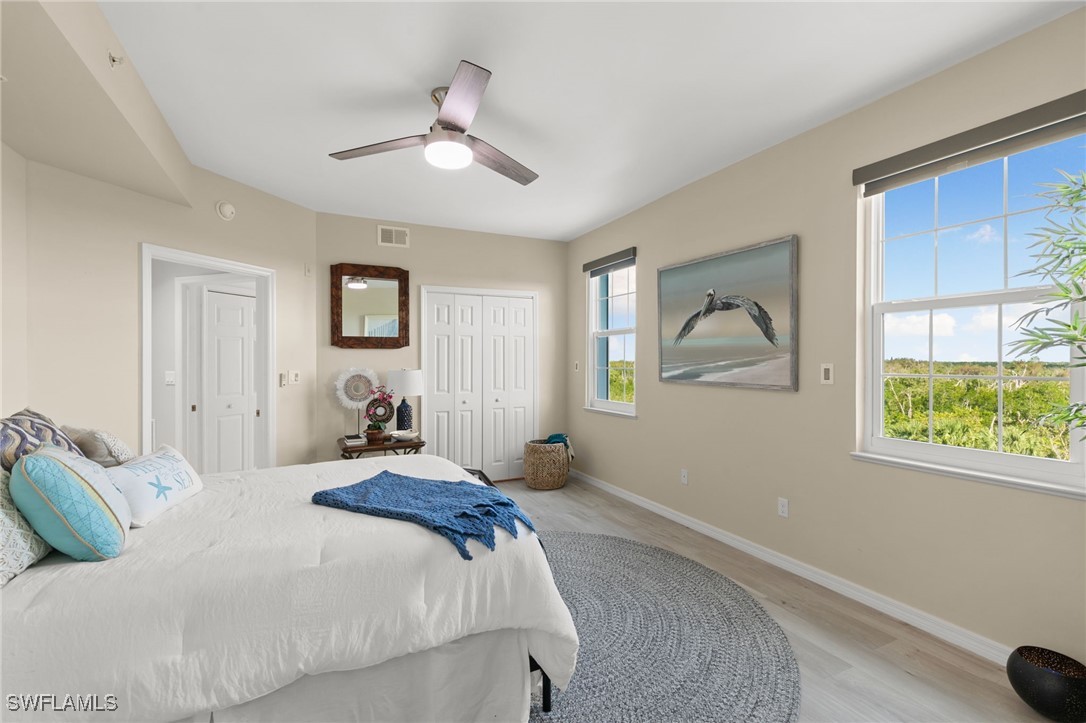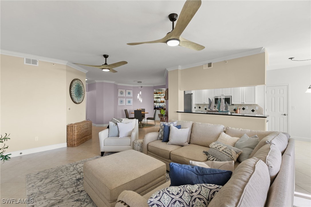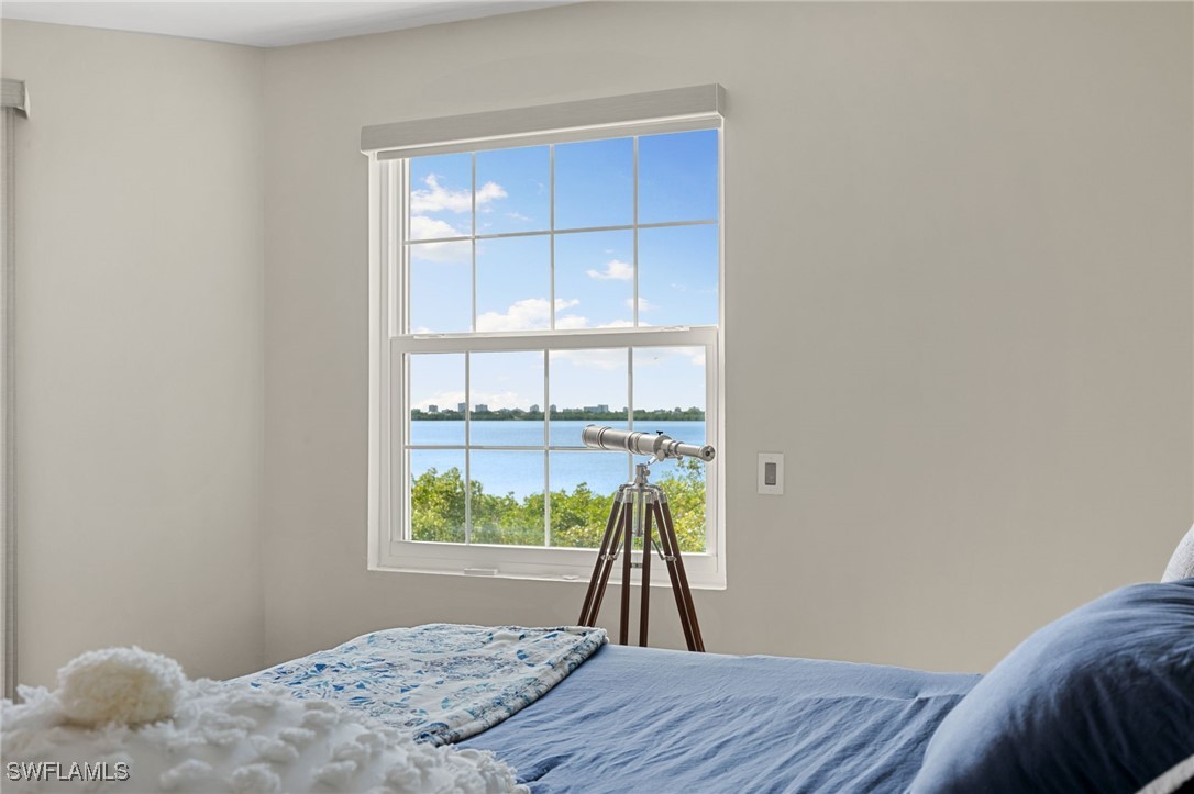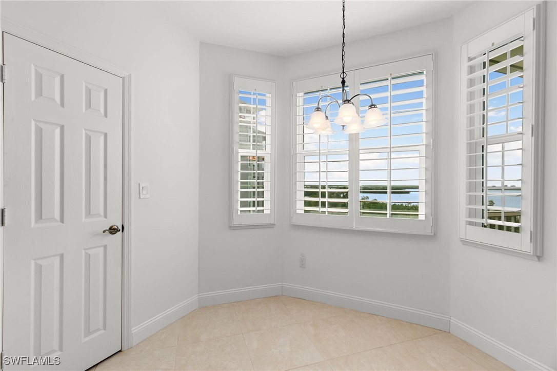Located in the gated Vintage Bay community, this 2,103 sqft condo offers views of Barfield Bay and the Marco Island skyline. Situated on the 4th floor, this end unit features 3 bedrooms and 2.5 bathrooms. The kitchen includes GE stainless appliances, granite countertops, white cabinetry, a large pantry, a breakfast room, and bar seating. The unit has been freshly painted and includes crown molding, new 6" base molding, and plantation shutters. The primary bedroom features his and her walk-in closets, an en-suite bathroom, and private lanai access. The guest bedrooms offer ample space with a large closet and Jack and Jill bath. Tile flooring is present throughout the main living areas, and electric shutters are installed on the lanai. Community amenities include a screen-enclosed pool and a nature boardwalk leading to a covered gazebo on Barfield Bay. The property is suitable for vacations, full-time living, or rental purposes.