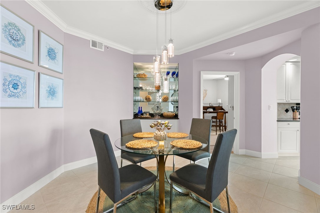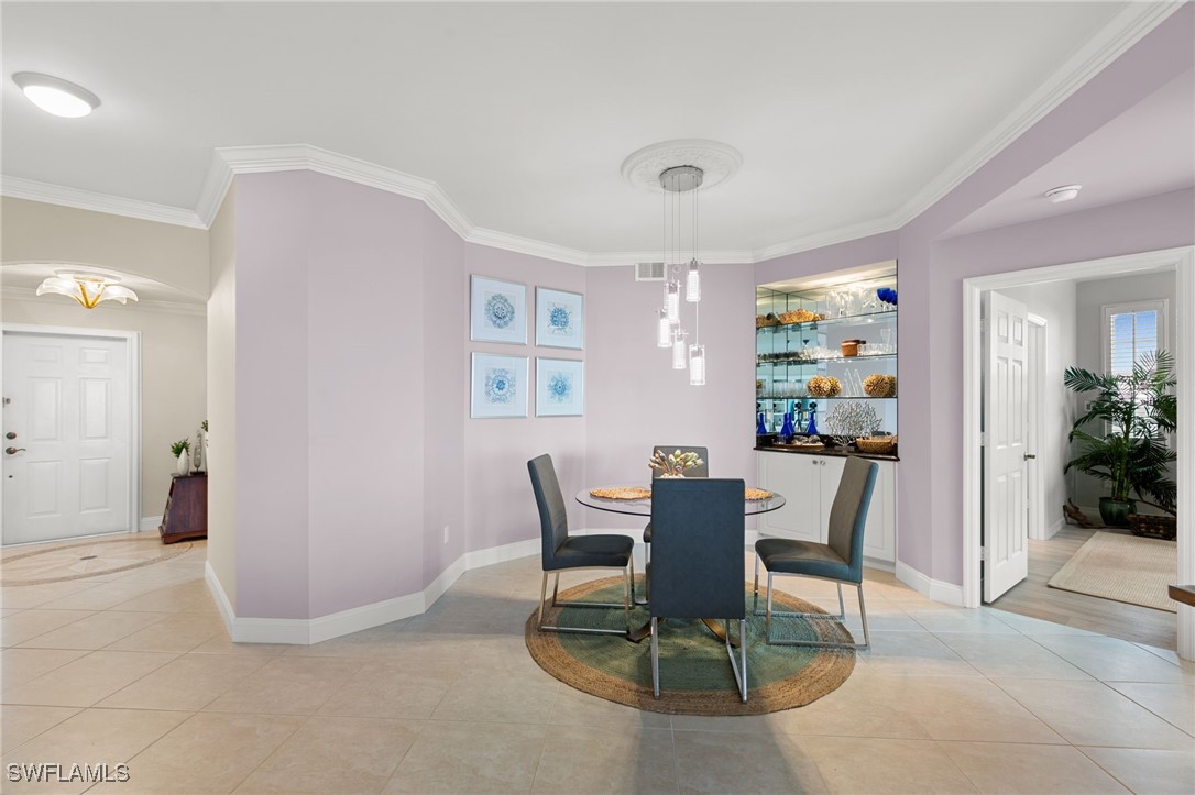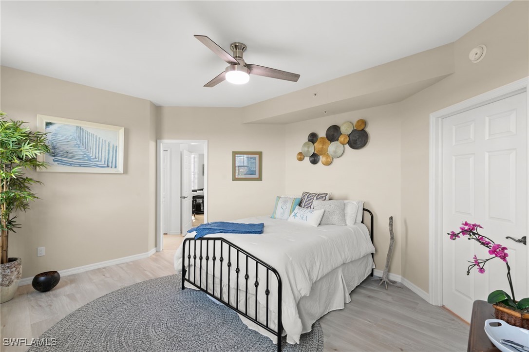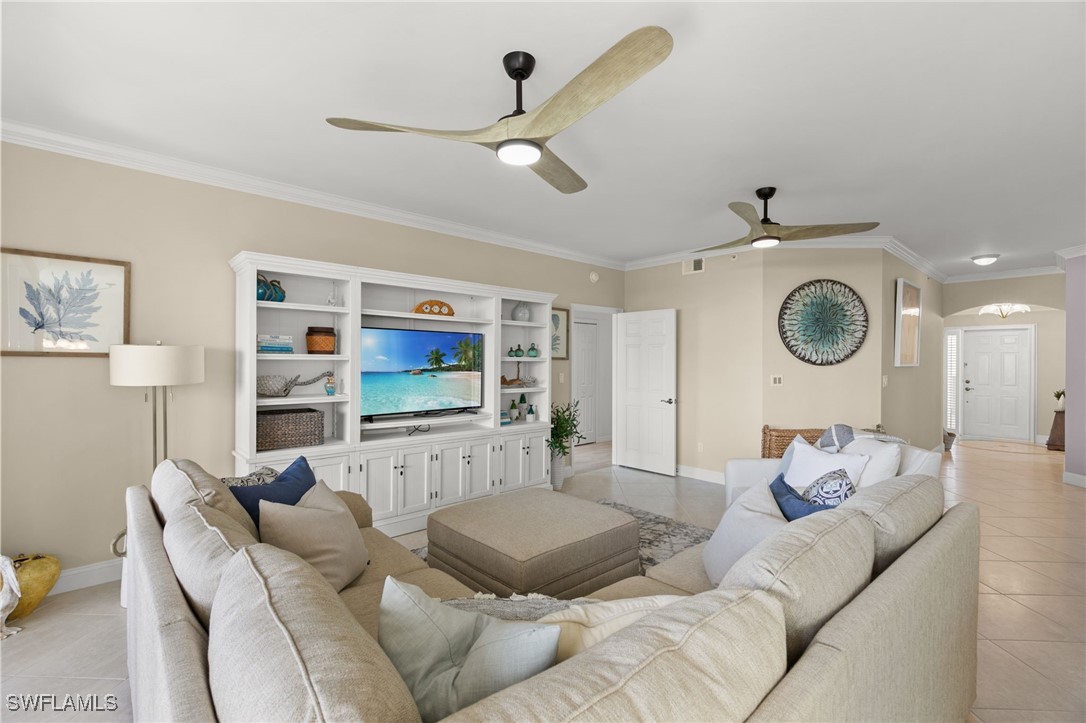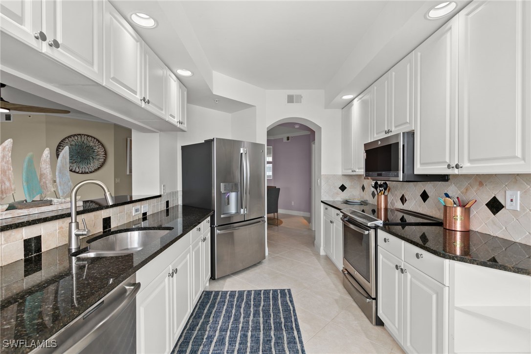 Located in the gated Vintage Bay community, this 2,103 sqft condo offers views of Barfield Bay and the Marco Island skyline. Situated on the 4th floor, this end unit features 3 bedrooms and 2.5 bathrooms. The kitchen includes GE stainless appliances, granite countertops, white cabinetry, a large pantry, a breakfast room, and bar seating. The unit has been freshly painted and includes crown molding, new 6" base molding, and plantation shutters. The primary bedroom features his and her walk-in closets, an en-suite bathroom, and private lanai access. The guest bedrooms offer ample space with a large closet and Jack and Jill bath. Tile flooring is present throughout the main living areas, and electric shutters are installed on the lanai. Community amenities include a screen-enclosed pool and a nature boardwalk leading to a covered gazebo on Barfield Bay. The property is suitable for vacations, full-time living, or rental purposes.