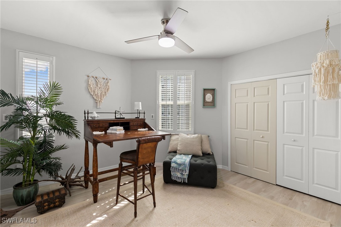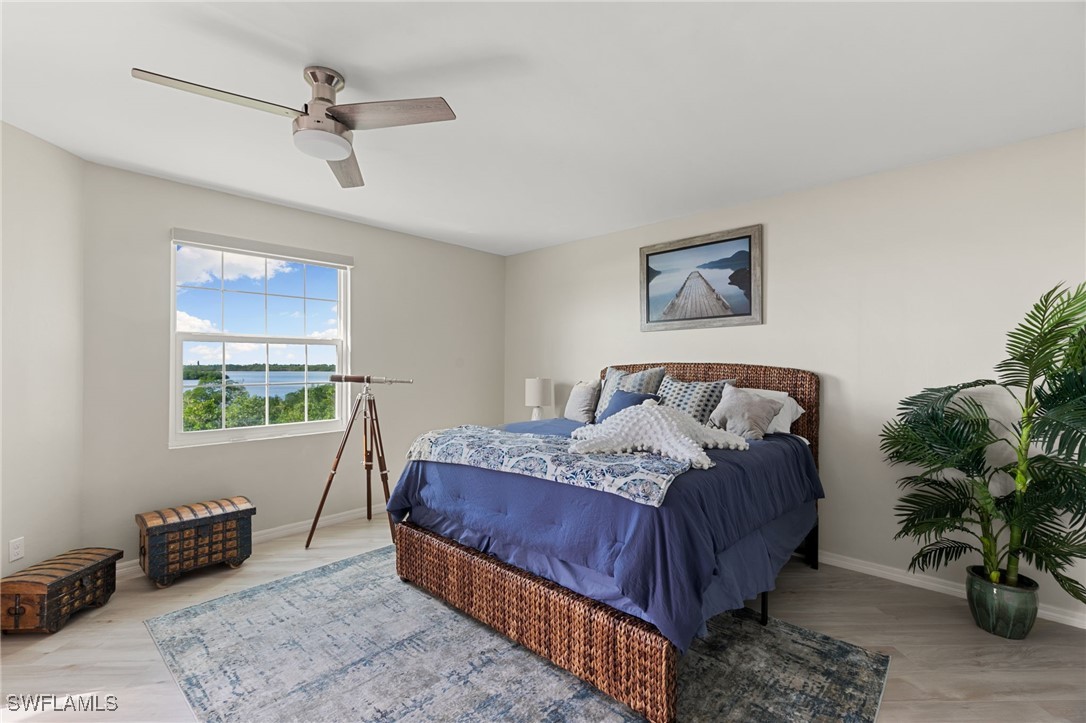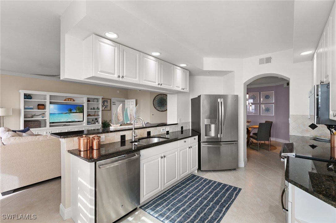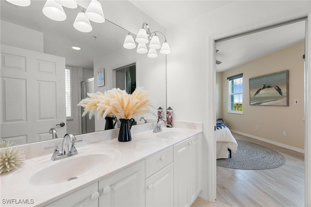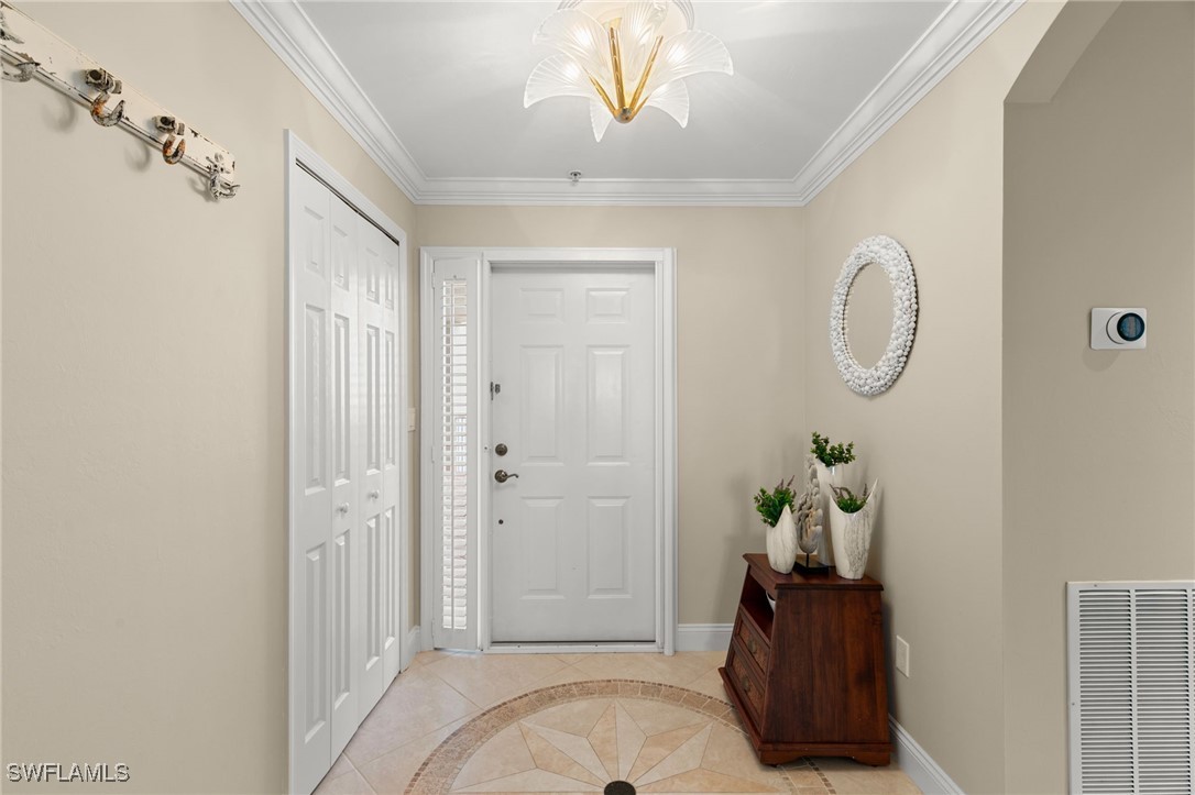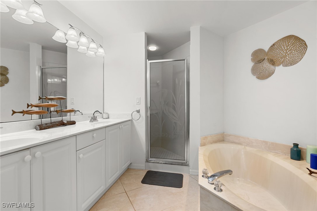 Located in the gated Vintage Bay community, this 2,103 sqft condo offers views of Barfield Bay and the Marco Island skyline. Situated on the 4th floor, this end unit features 3 bedrooms and 2.5 bathrooms. The kitchen includes GE stainless appliances, granite countertops, white cabinetry, a large pantry, a breakfast room, and bar seating. The unit has been freshly painted and includes crown molding, new 6" base molding, and plantation shutters. The primary bedroom features his and her walk-in closets, an en-suite bathroom, and private lanai access. The guest bedrooms offer ample space with a large closet and Jack and Jill bath. Tile flooring is present throughout the main living areas, and electric shutters are installed on the lanai. Community amenities include a screen-enclosed pool and a nature boardwalk leading to a covered gazebo on Barfield Bay. The property is suitable for vacations, full-time living, or rental purposes.