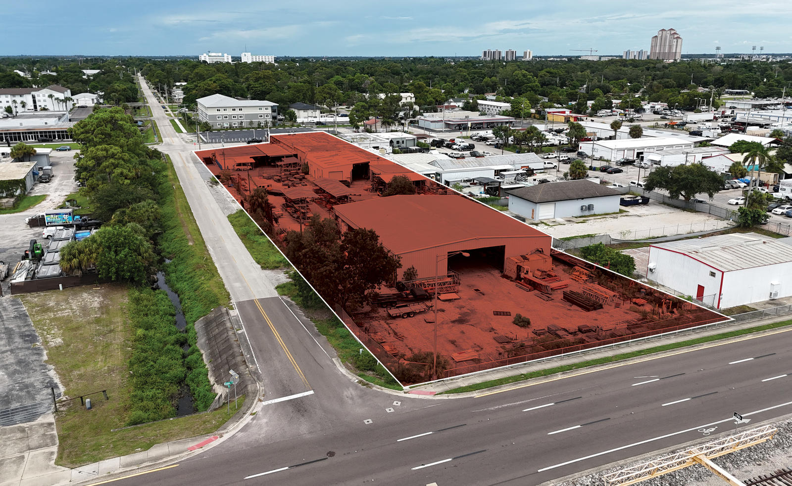 Versatile warehouse facility with ample outdoor storage on 1.8 acres.