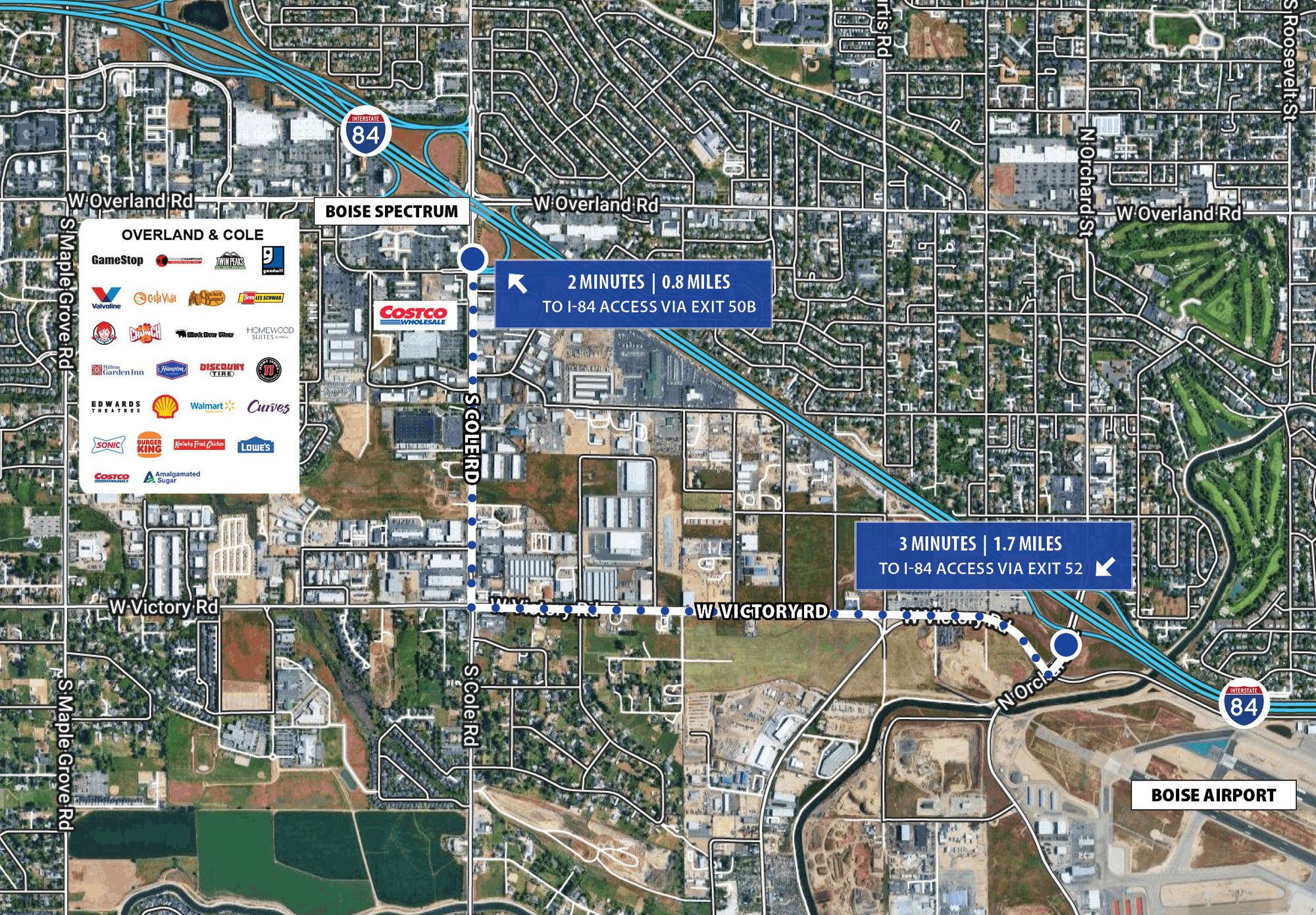 This property features: Prime industrial park location with South Cole Road frontage and available building and monument signage for maximum visibility.; Easy access to I‑84 via two nearby interchanges (Cole Road or Victory Road).; Proximity to Boise Airport and Micron (3 miles).