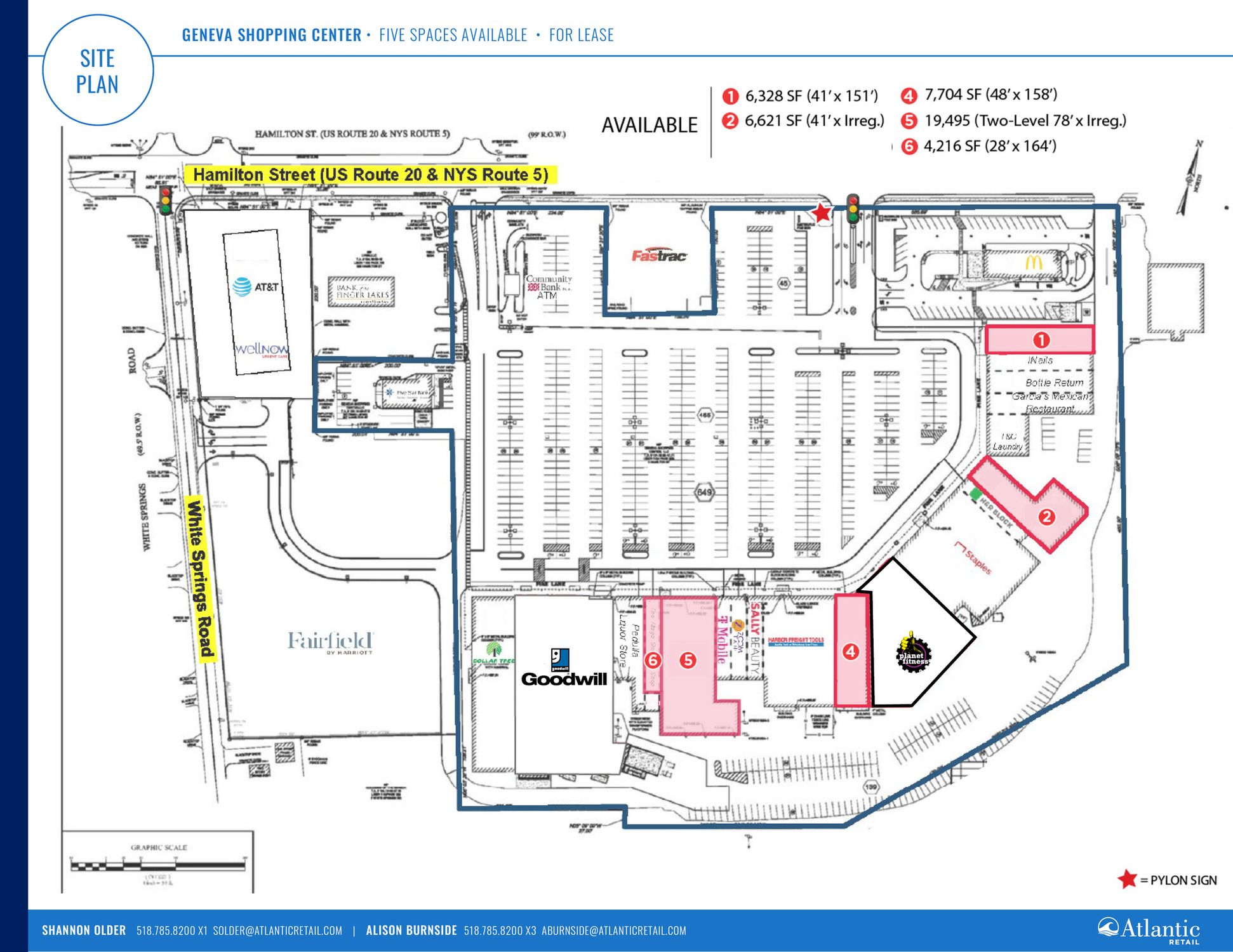 Retail spaces available in Geneva Shopping Center, ranging from 4,216-19,663 SF.