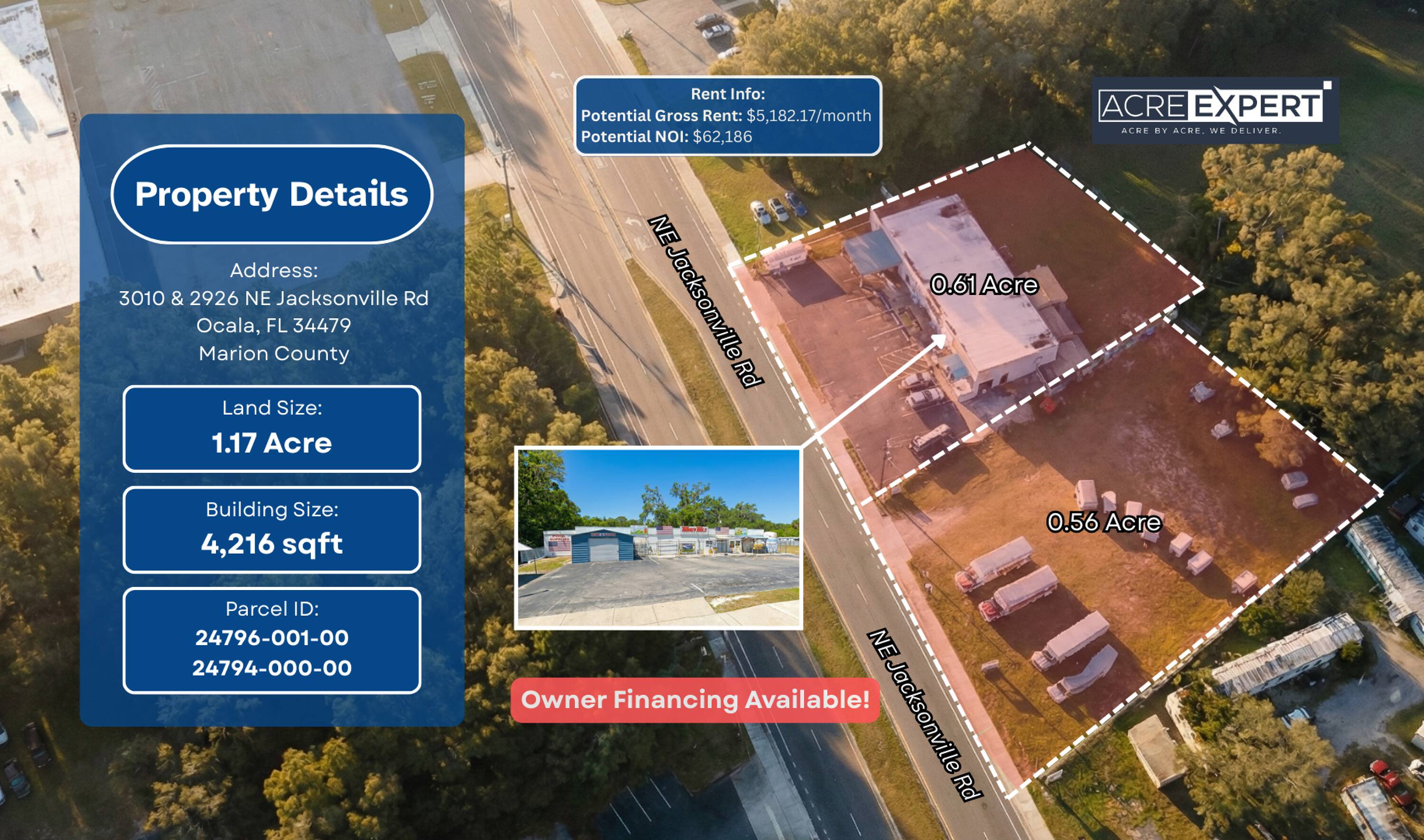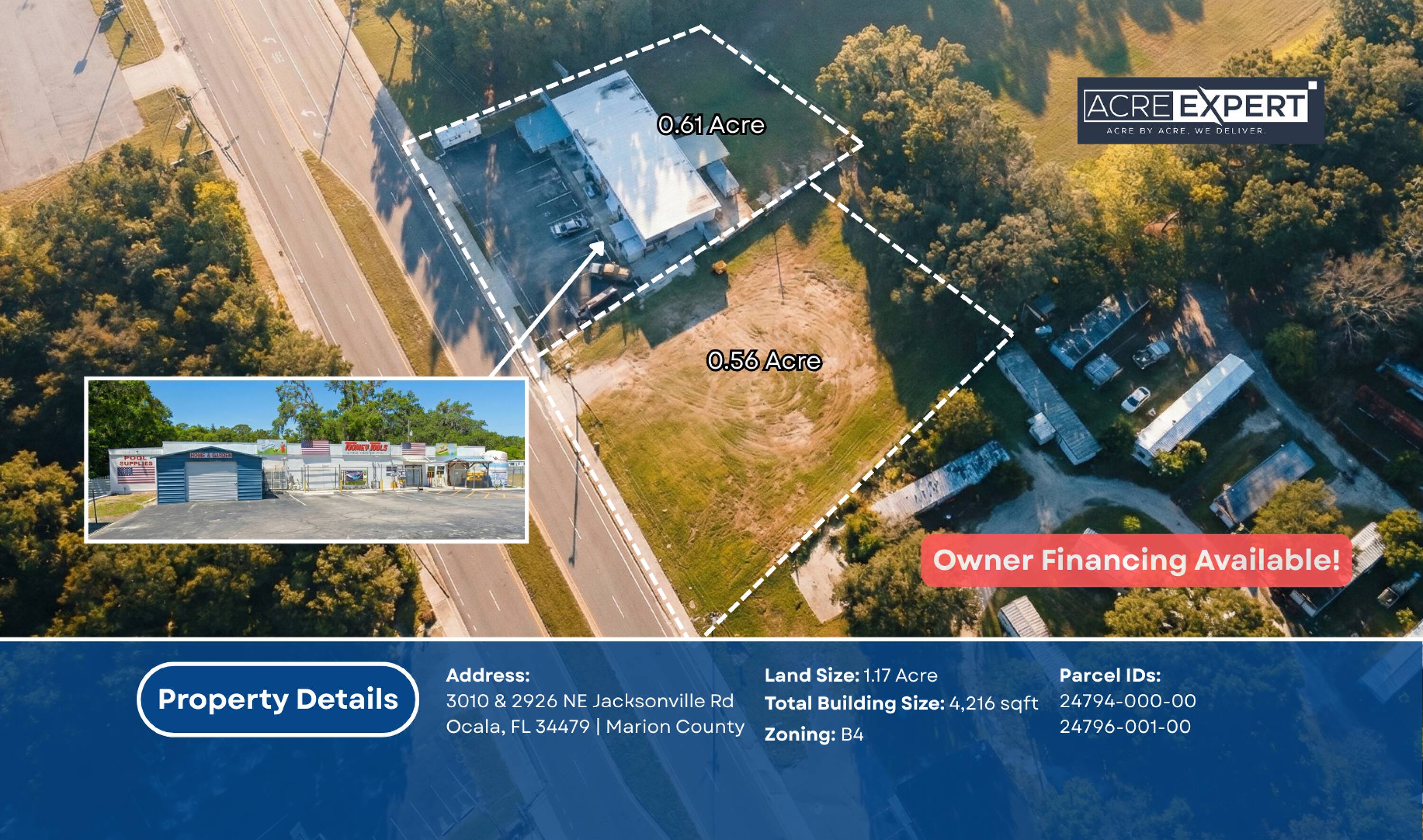 Retail building and vacant commercial land for sale.