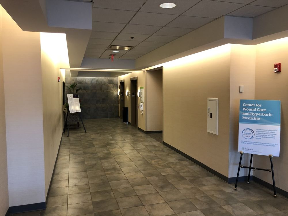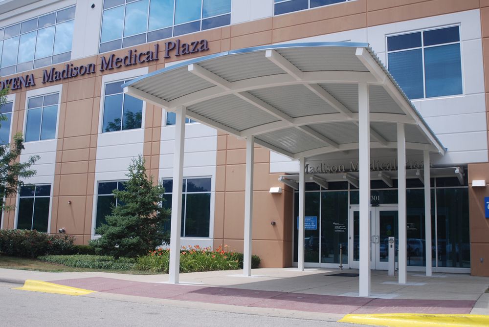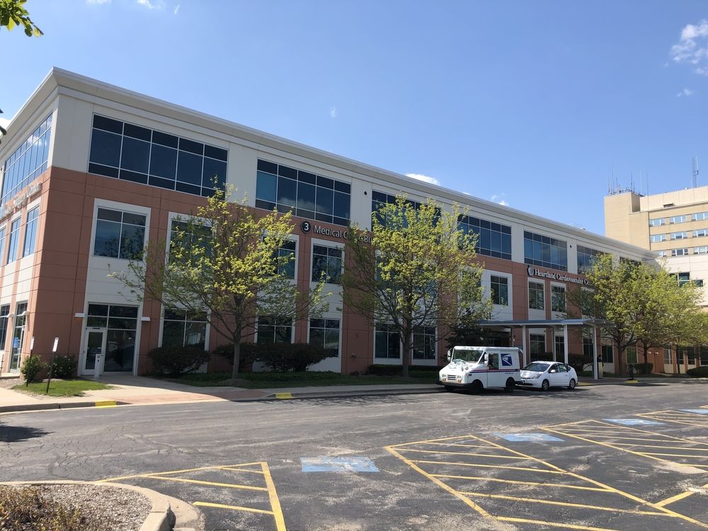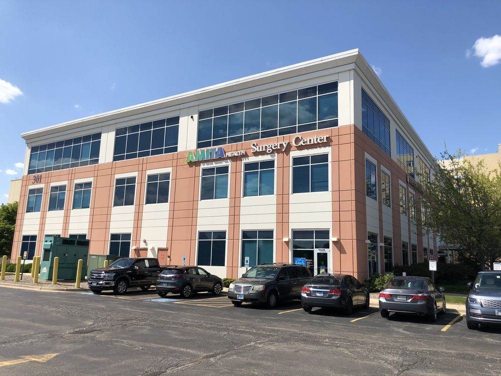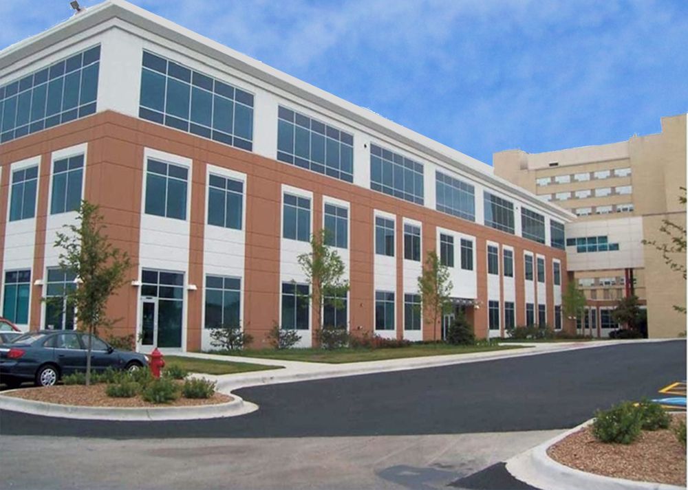 On-campus medical office with surgery center and parking garage.