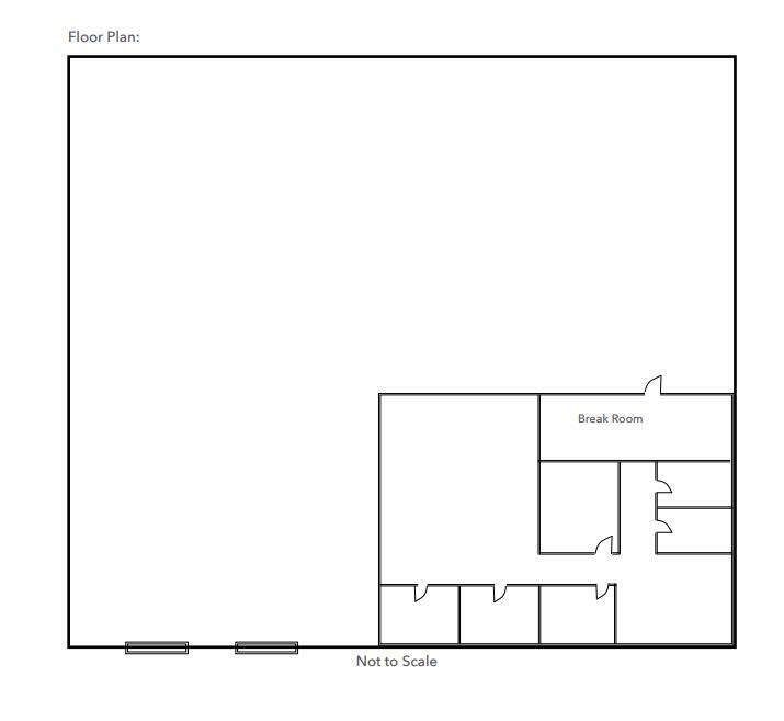 Warehouse space with office, dock doors, and security lighting.