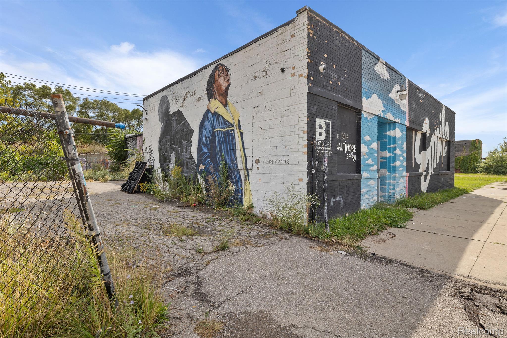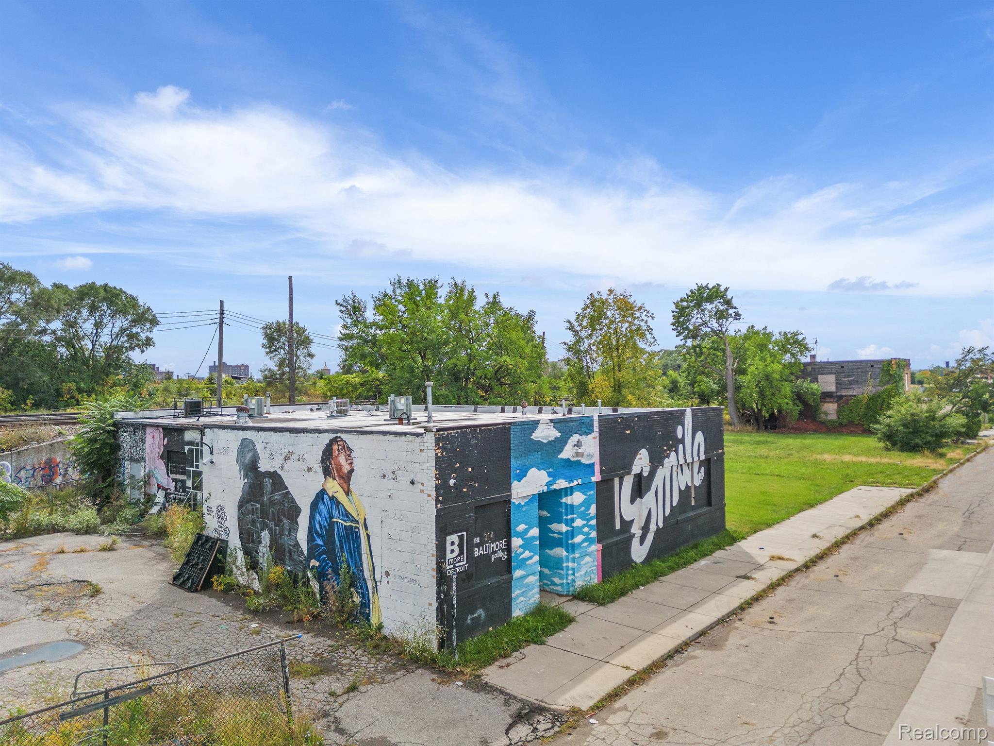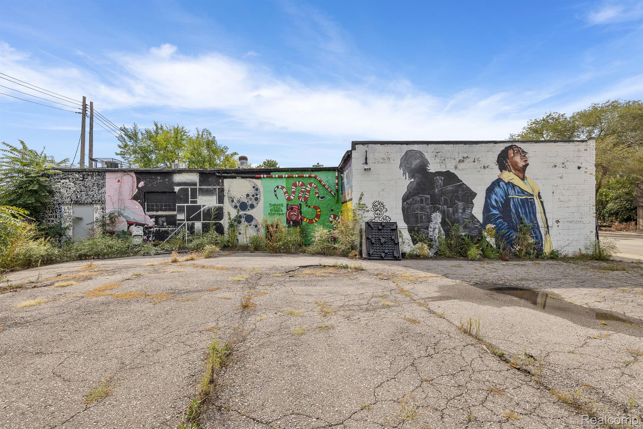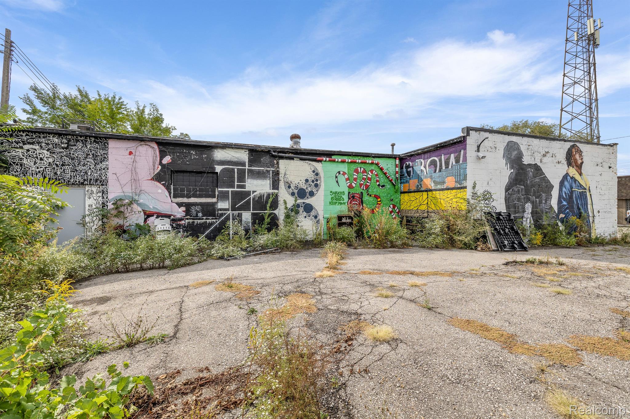 Unique industrial space with colorful murals in a trendy area.