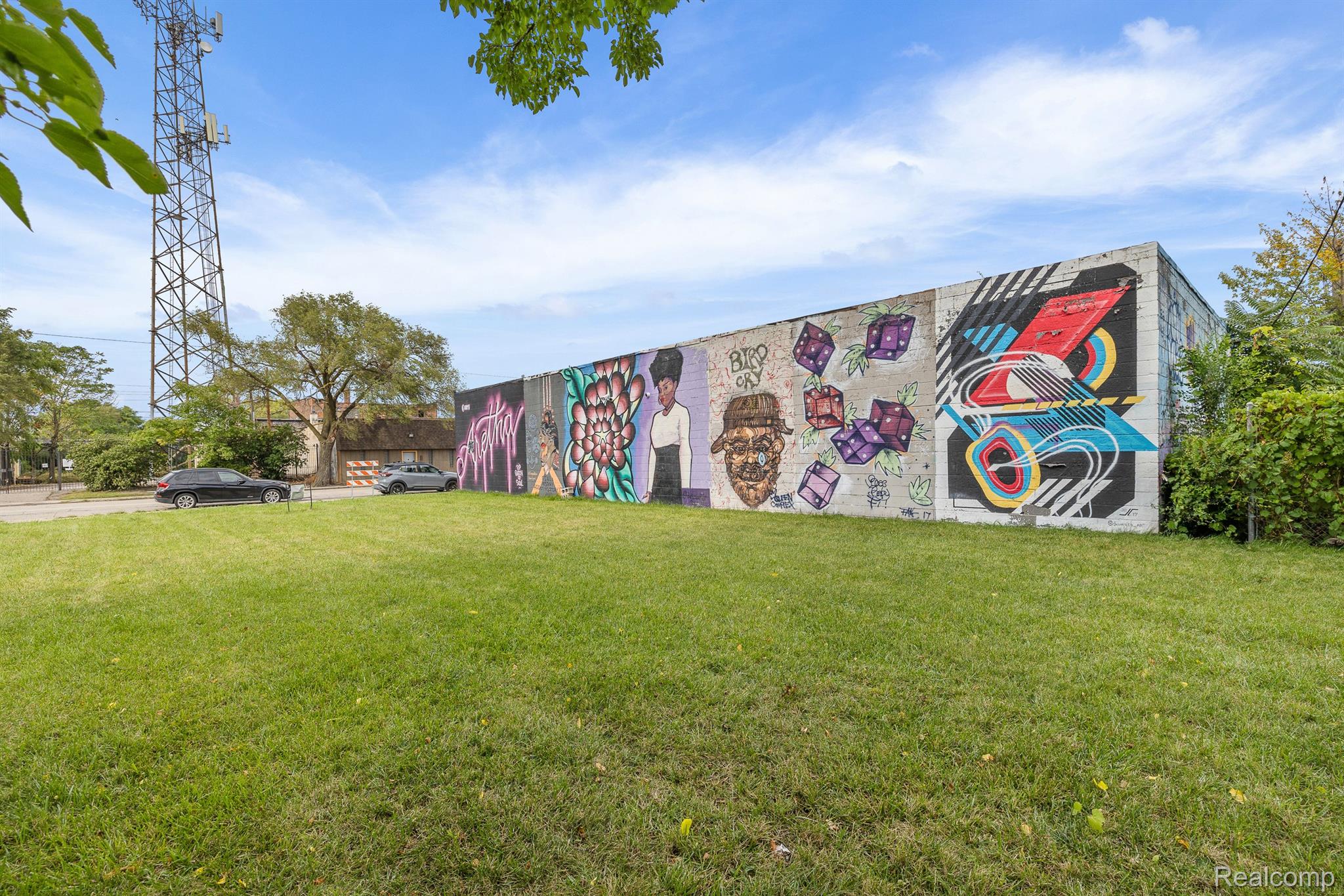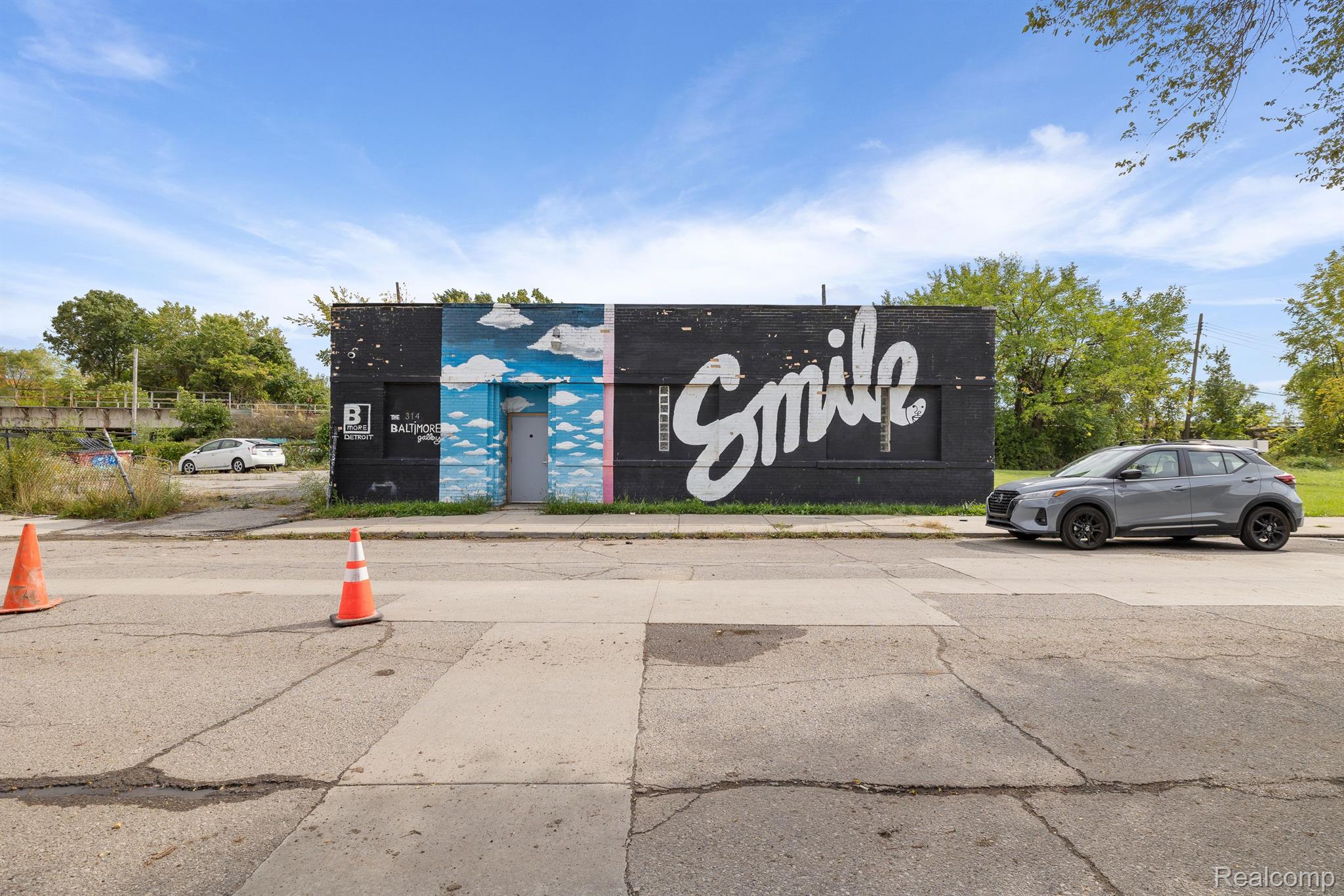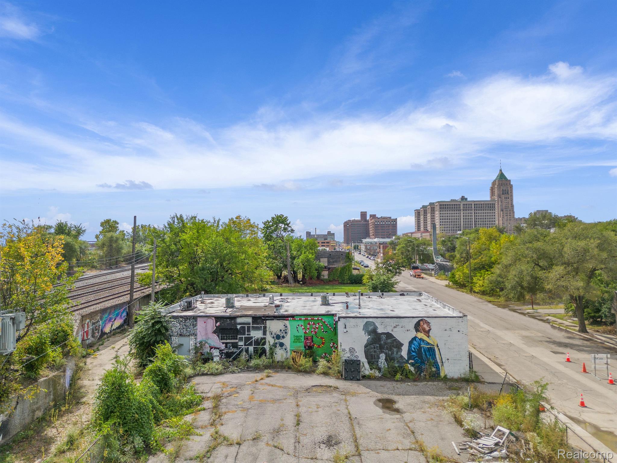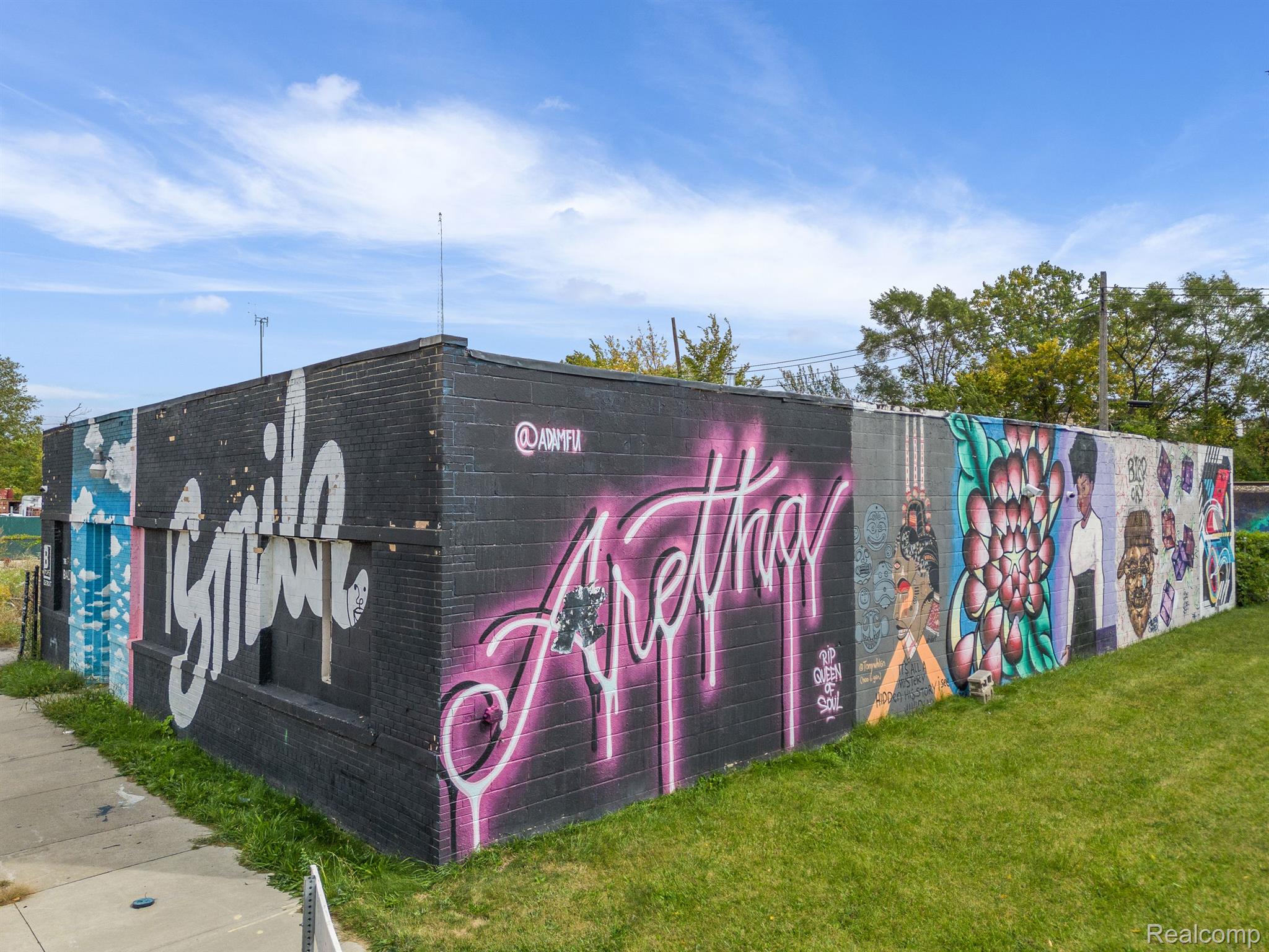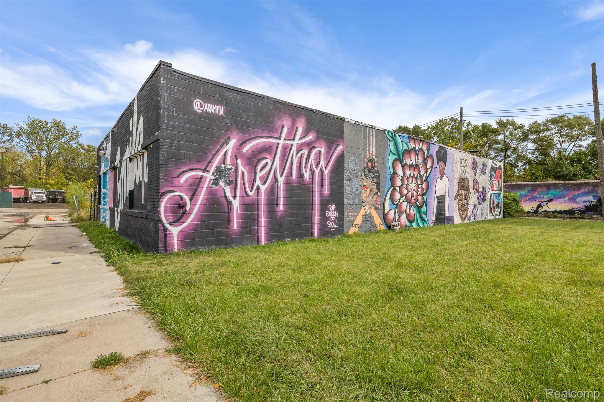 Unique industrial space with colorful murals in a trendy area.