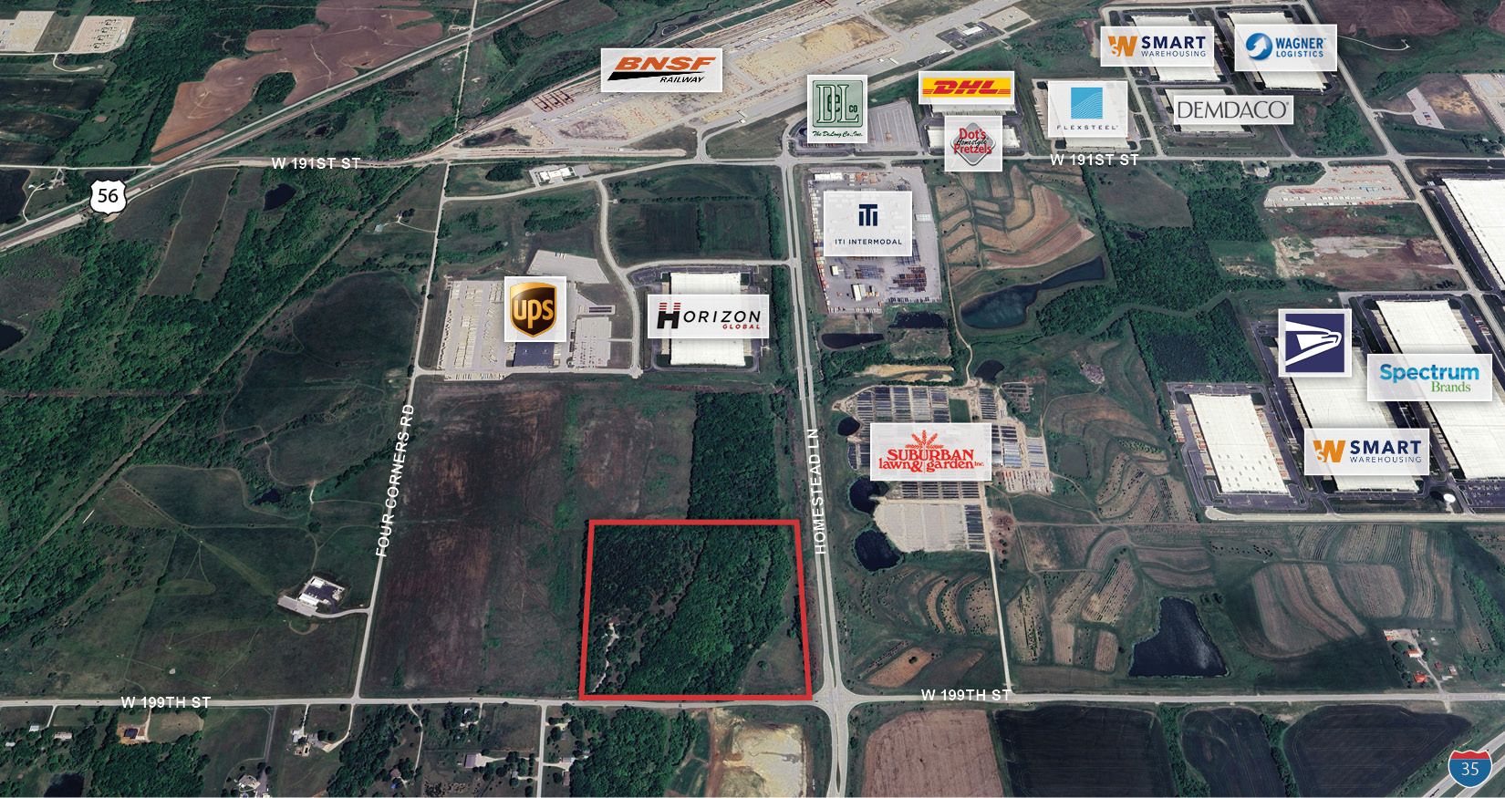 This property features approximately 37.74 acres available for sale. It is zoned L-P, C-2 and offers access right off I-35 and Homestead Ln. The property has outdoor storage potential, with the ability to stack up to 5 trailers high. It is located in close proximity to the BNSF Intermodal.