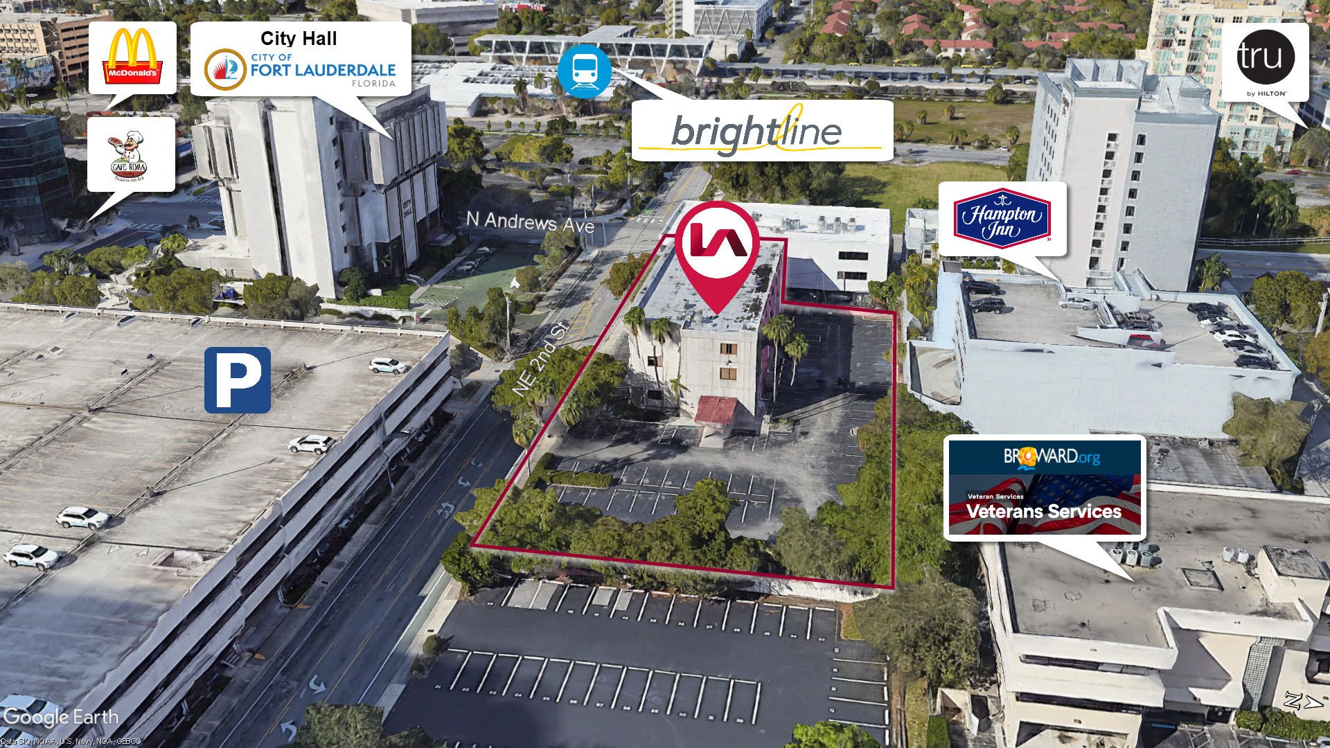 Vacant office building in downtown Fort Lauderdale with parking.