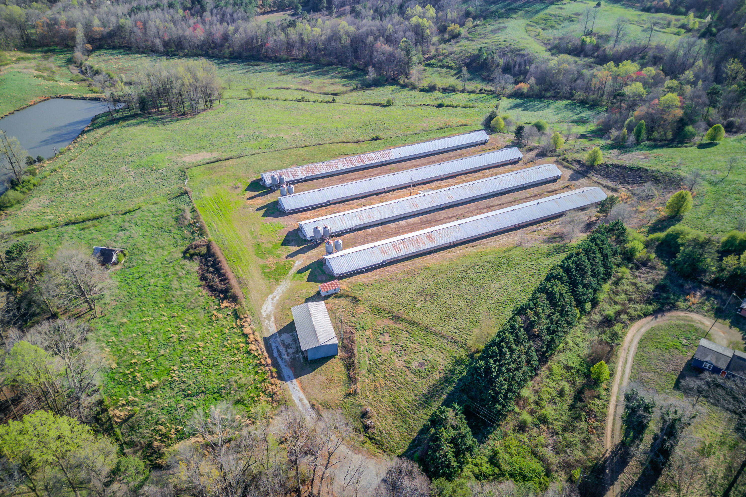 Agricultural property with four poultry houses and metal building.