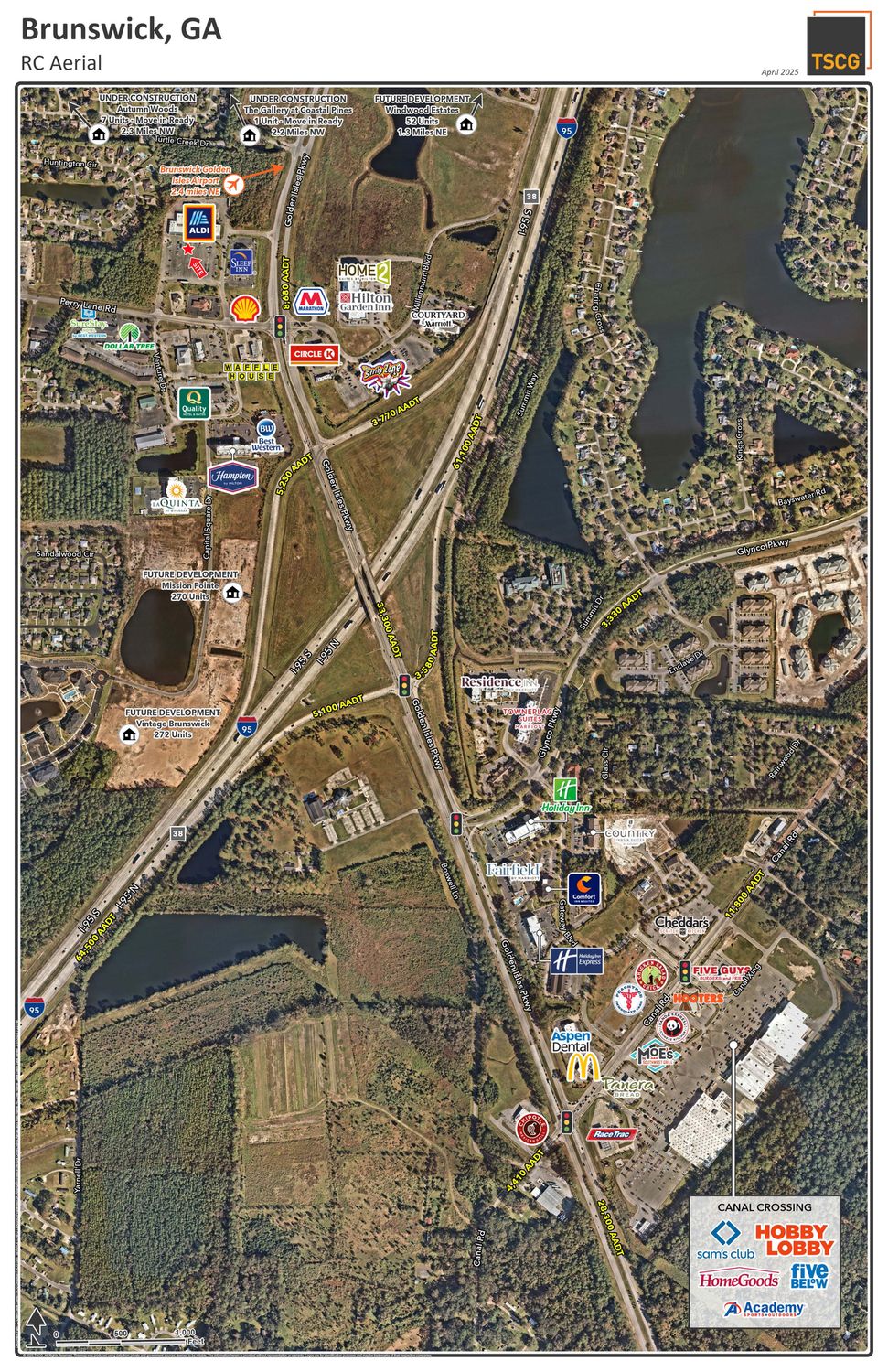 Located in Parkway Plaza, this 14,625 square-foot junior anchor box is available for sublease. The property features a recessed truck dock. Situated directly off Golden Isles Parkway and I-95 at exit 38, the location benefits from its position at the fully signalized intersection of Golden Isles Parkway and Perry Lane Road. The surrounding area is experiencing significant residential growth and includes hotels and retailers such as Hilton Garden Inn, Best Western, Dollar Tree, and Ace Hardware. Traffic counts in the area show 10,681 AADT on Golden Isles Parkway and 64,500 AADT on I-95.