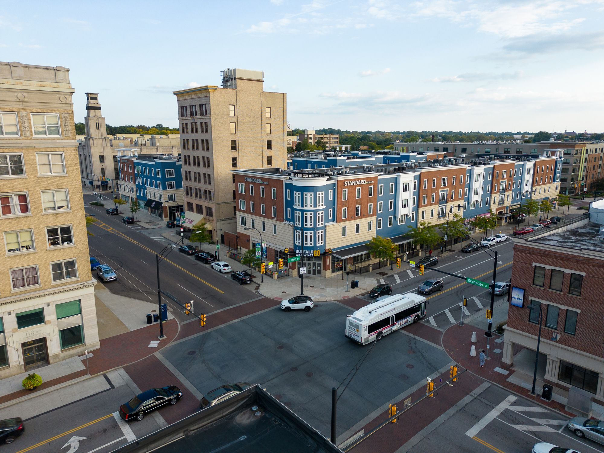 High-visibility retail in downtown Akron's historic Main-Exchange District.