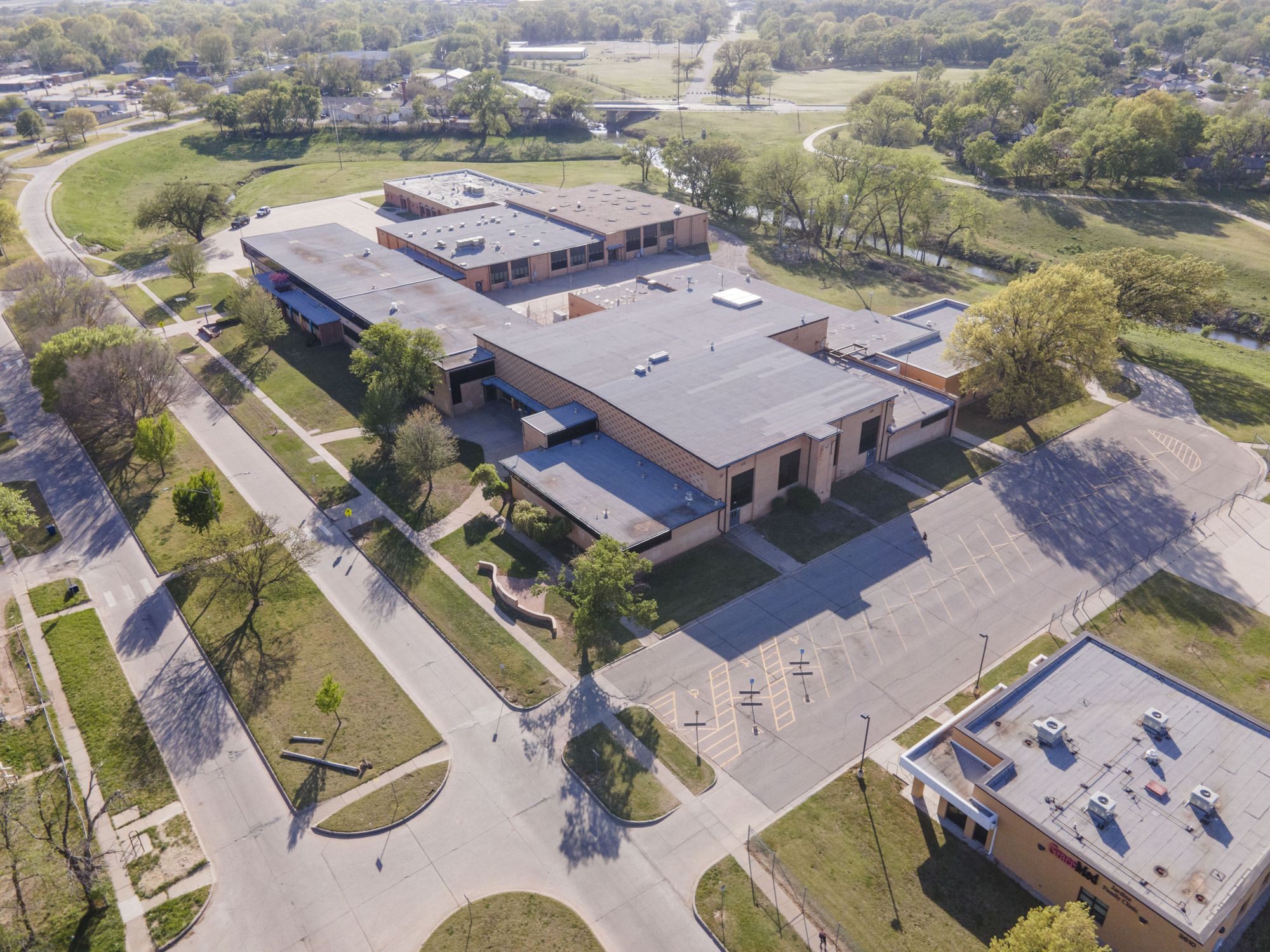 Large building near highways, interstates, and McConnell Air Force Base.