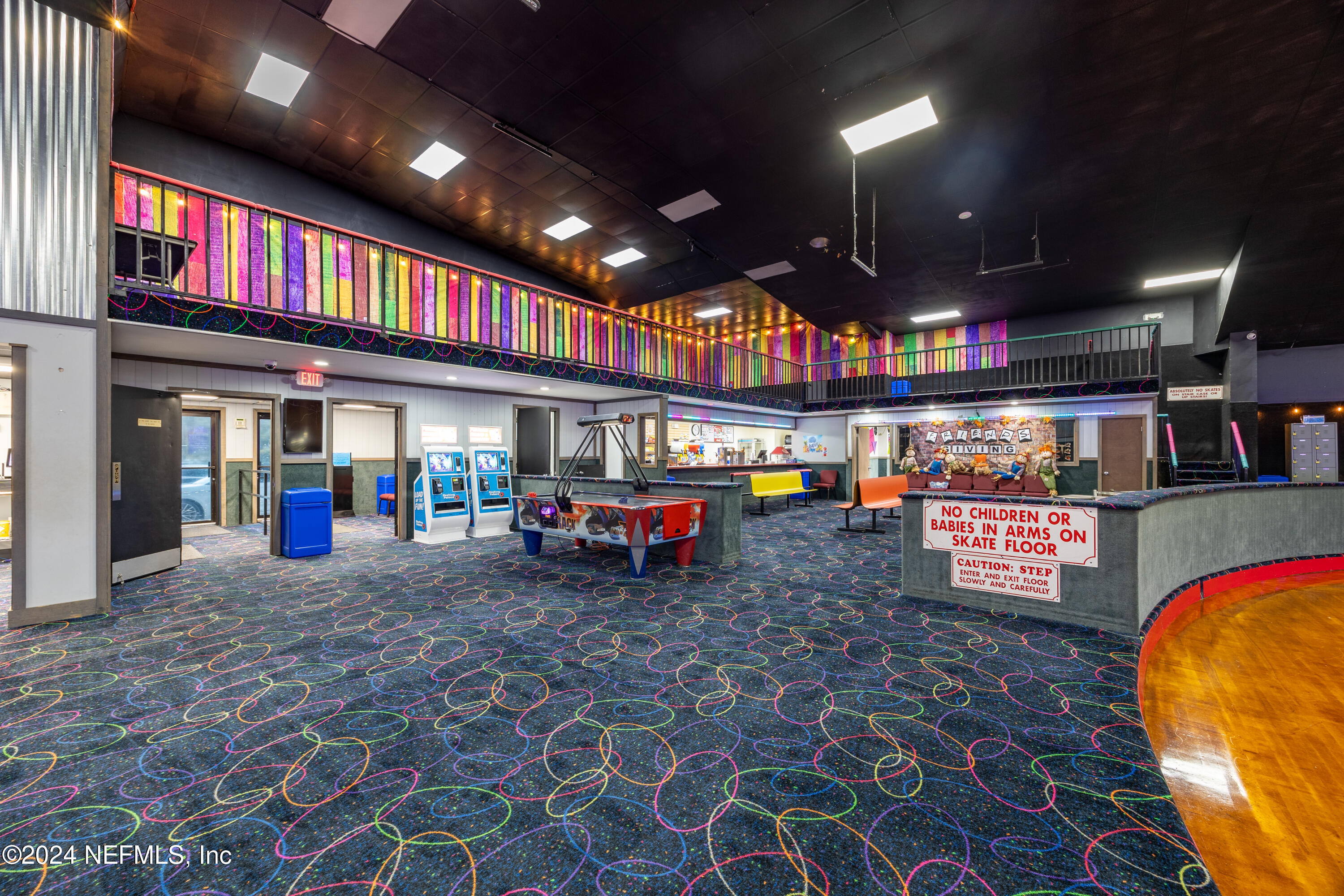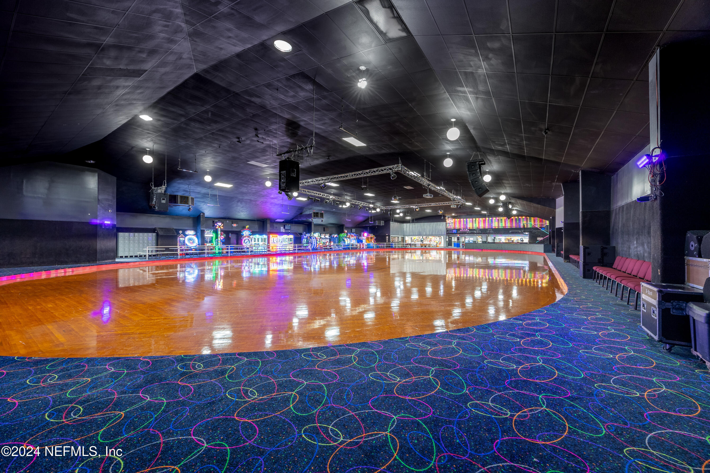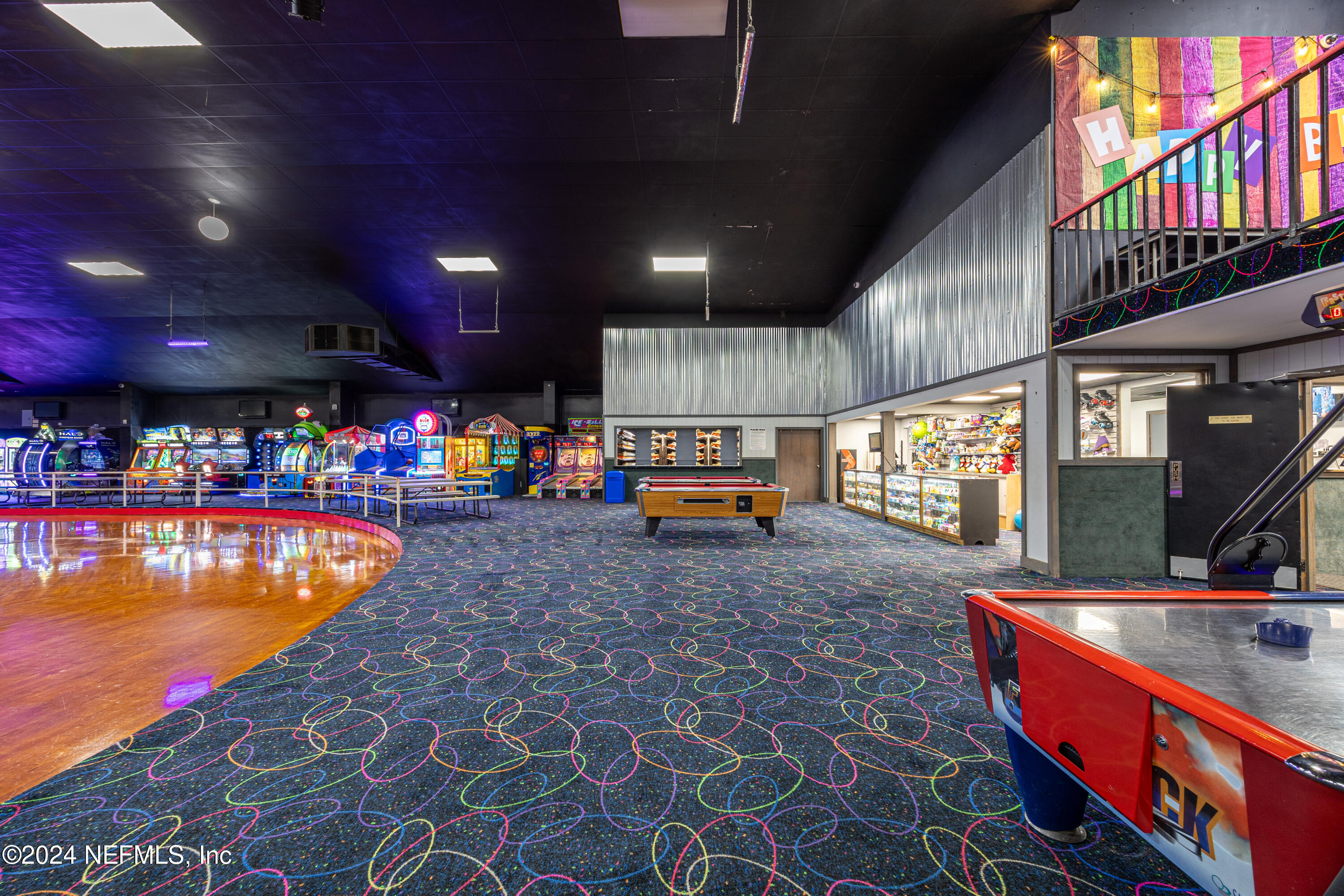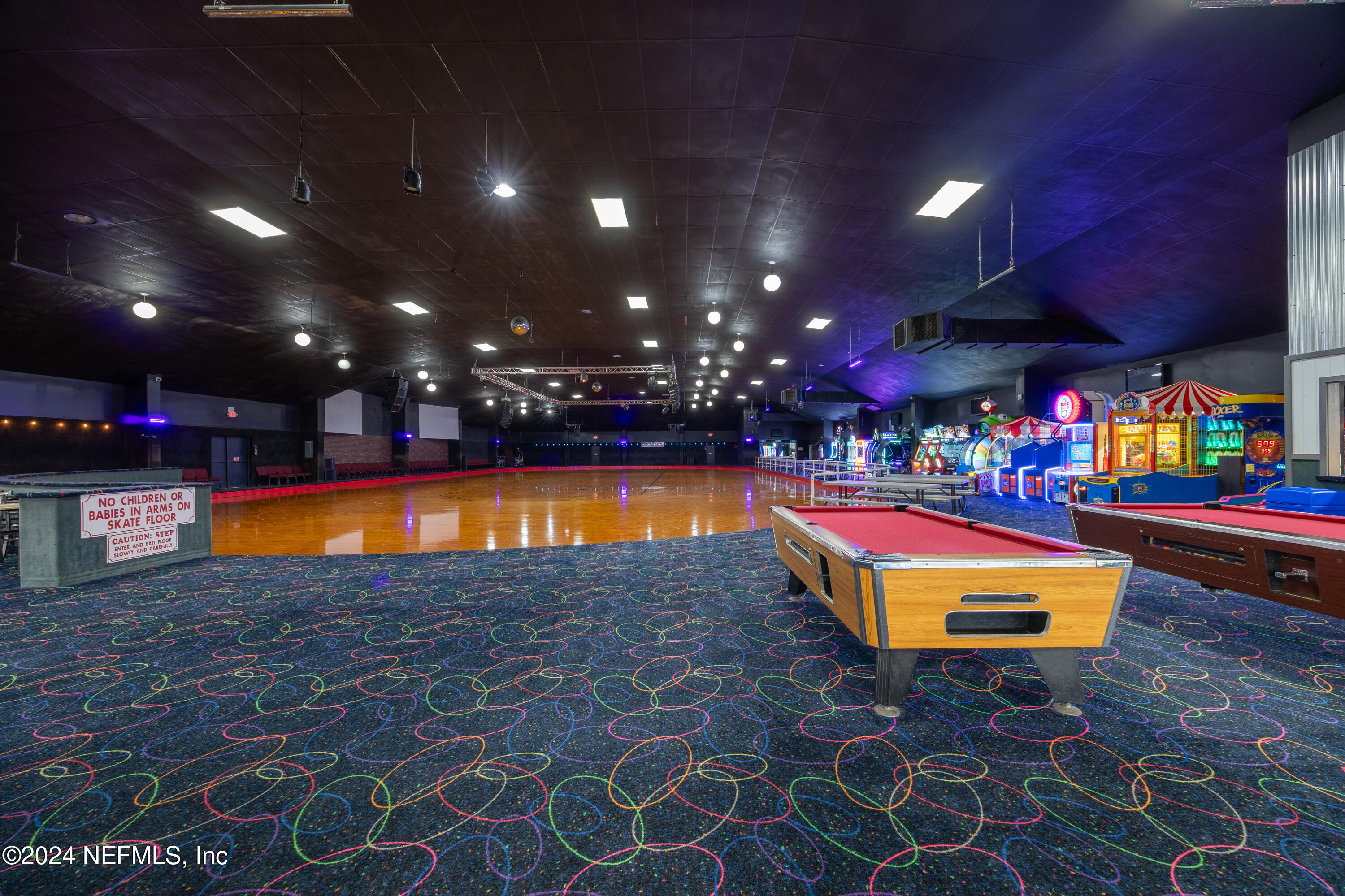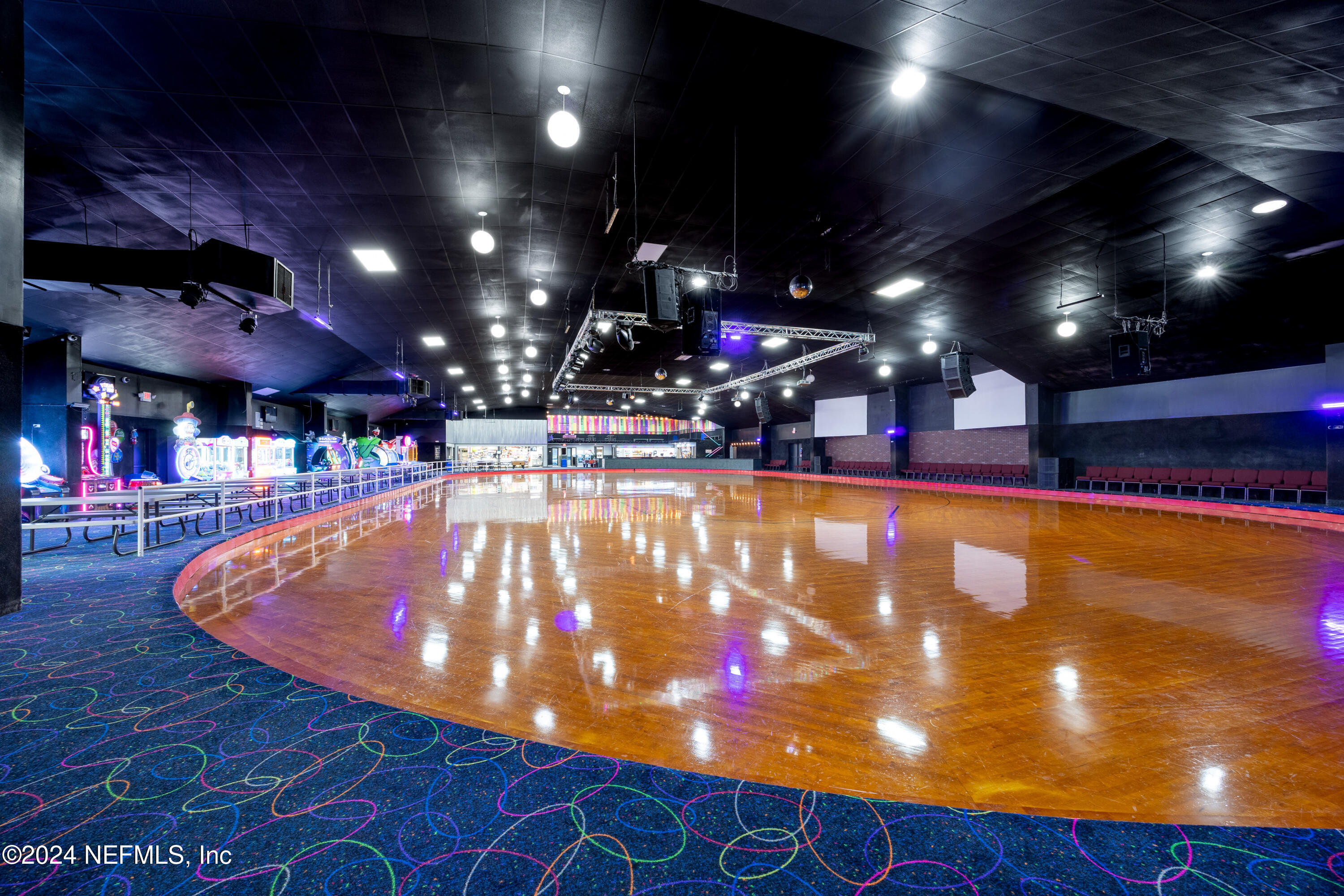 Spacious skating rink with snack bar and arcade games.