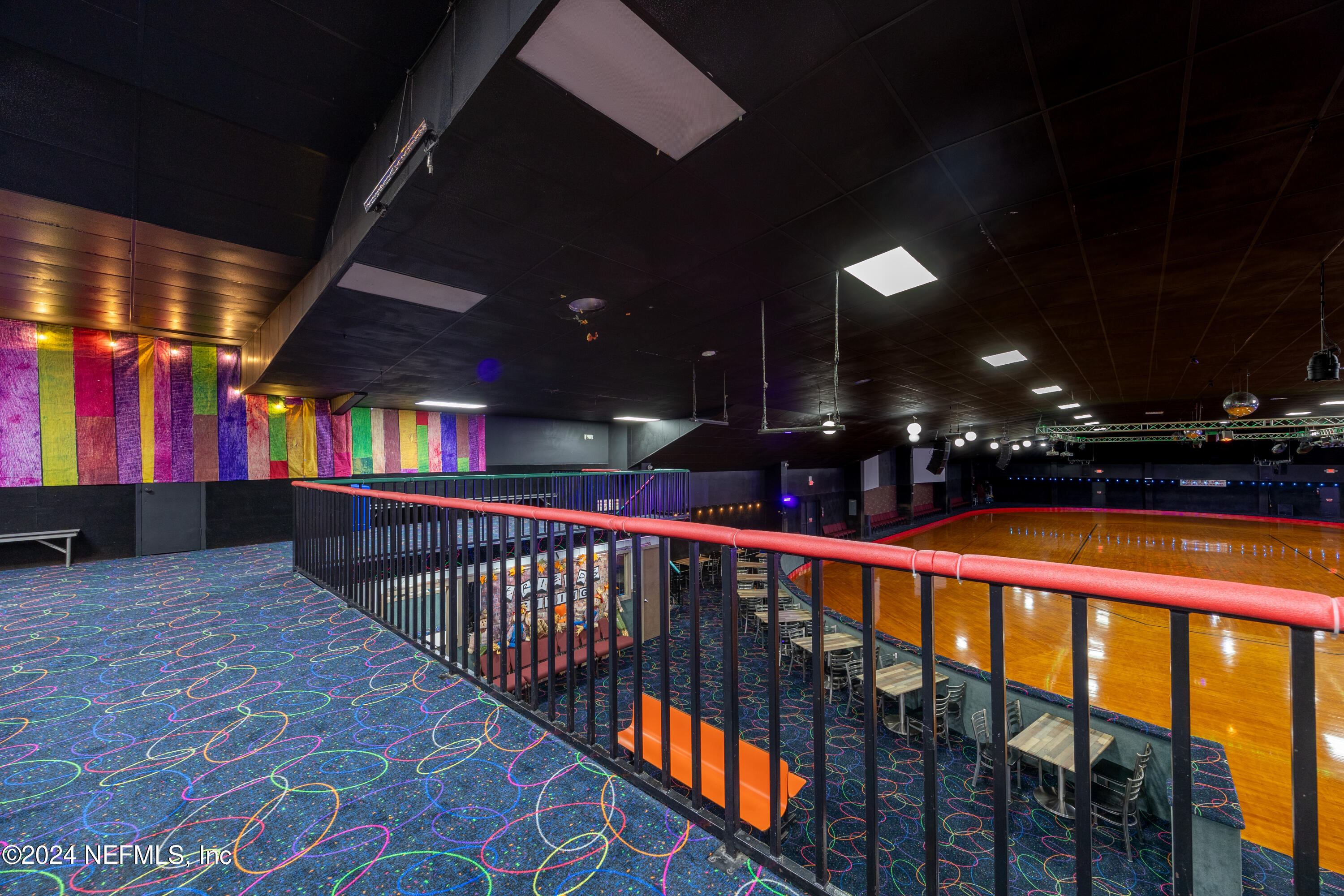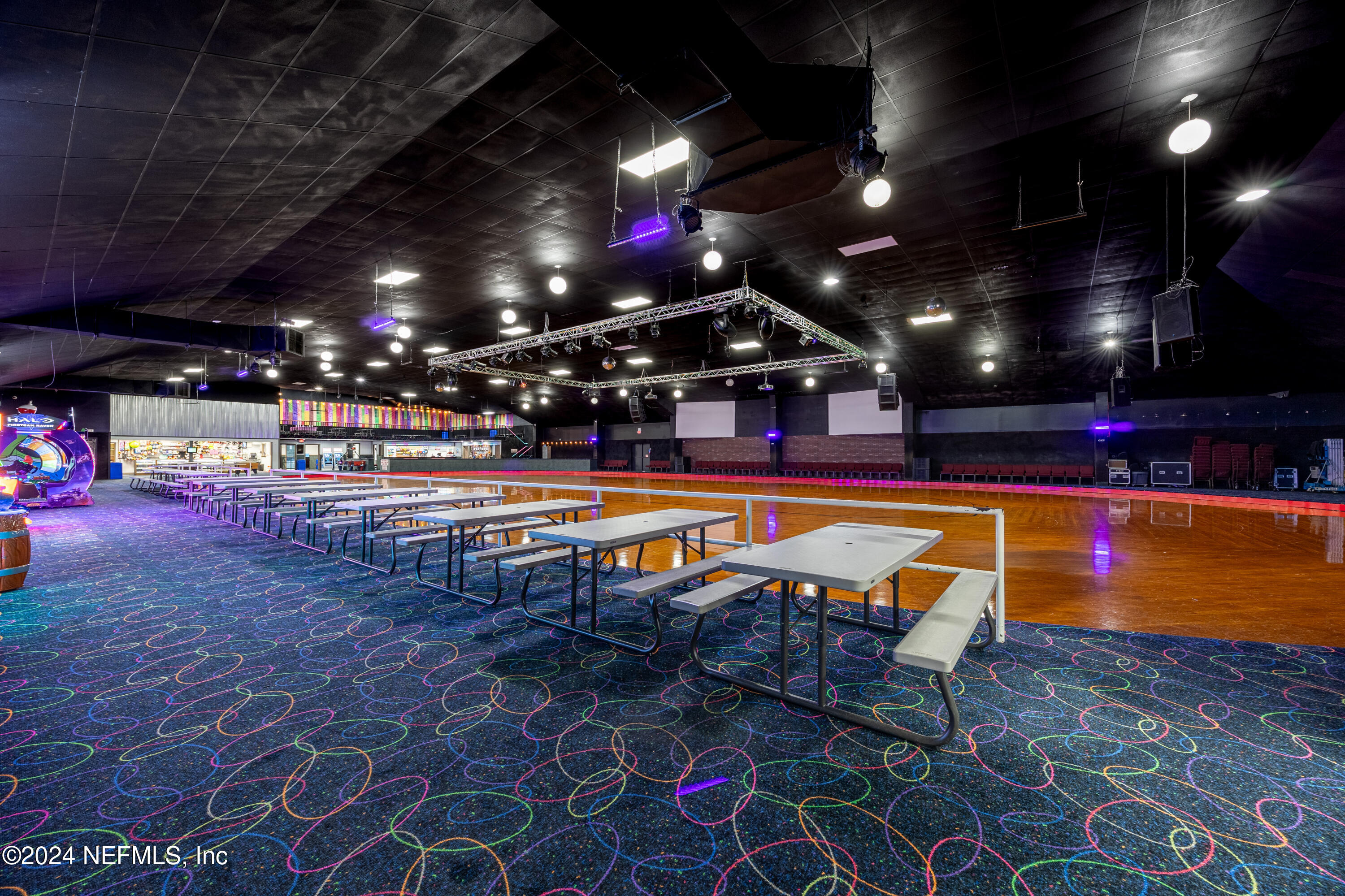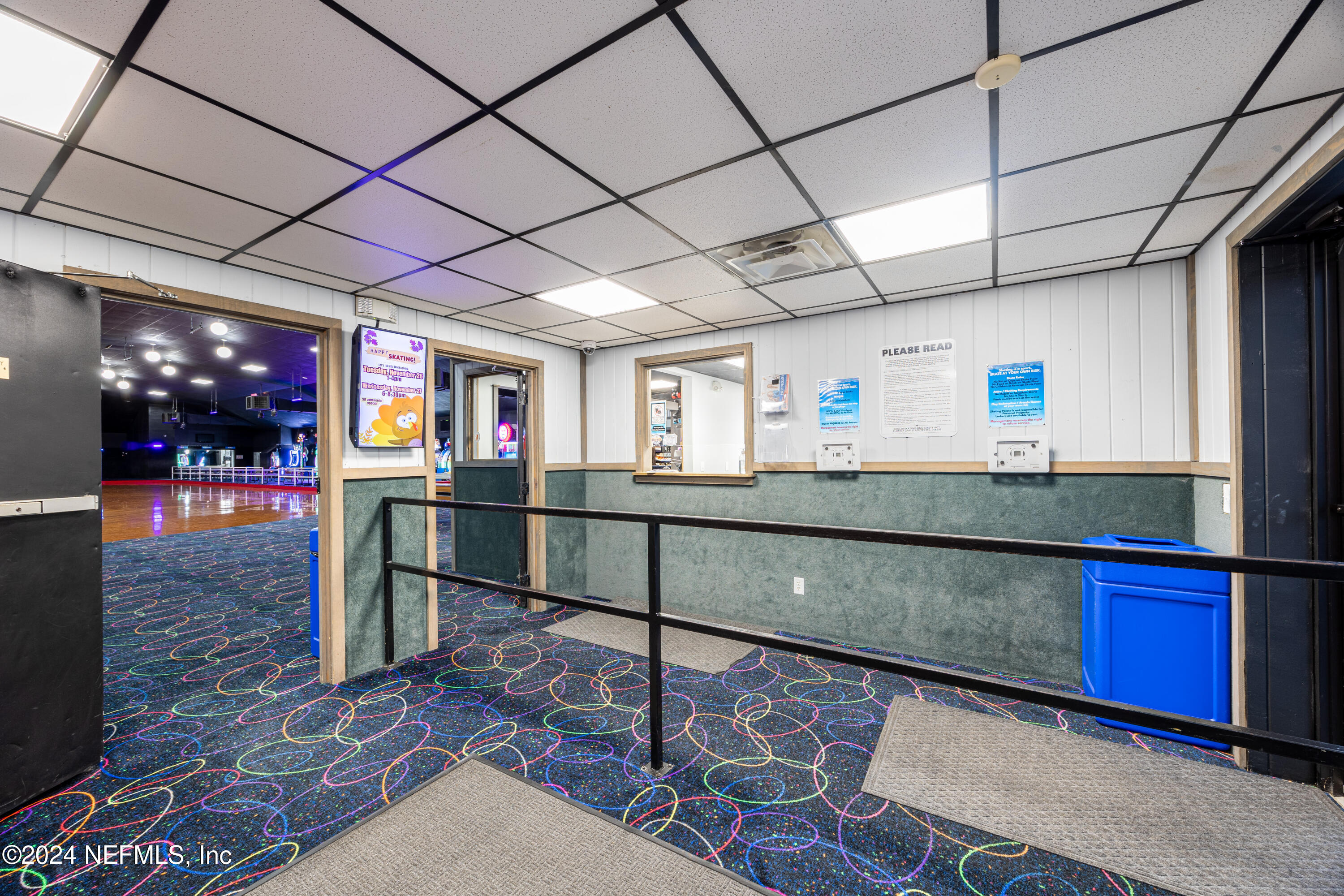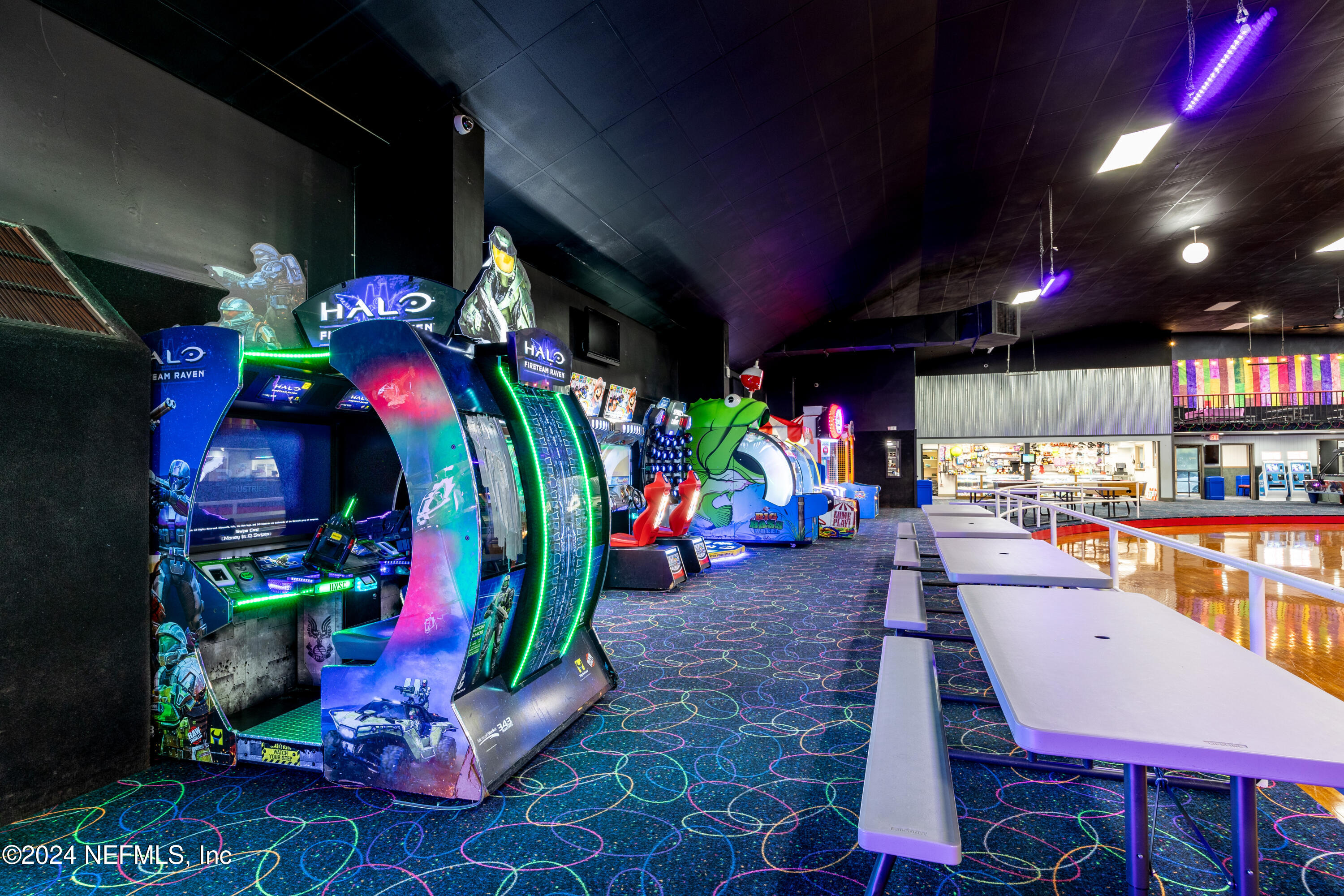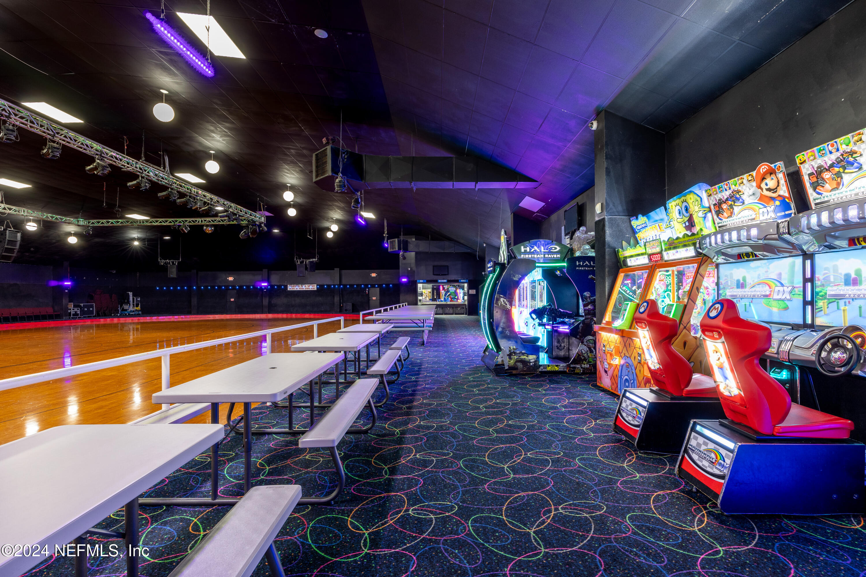 Spacious skating rink with snack bar and arcade games.