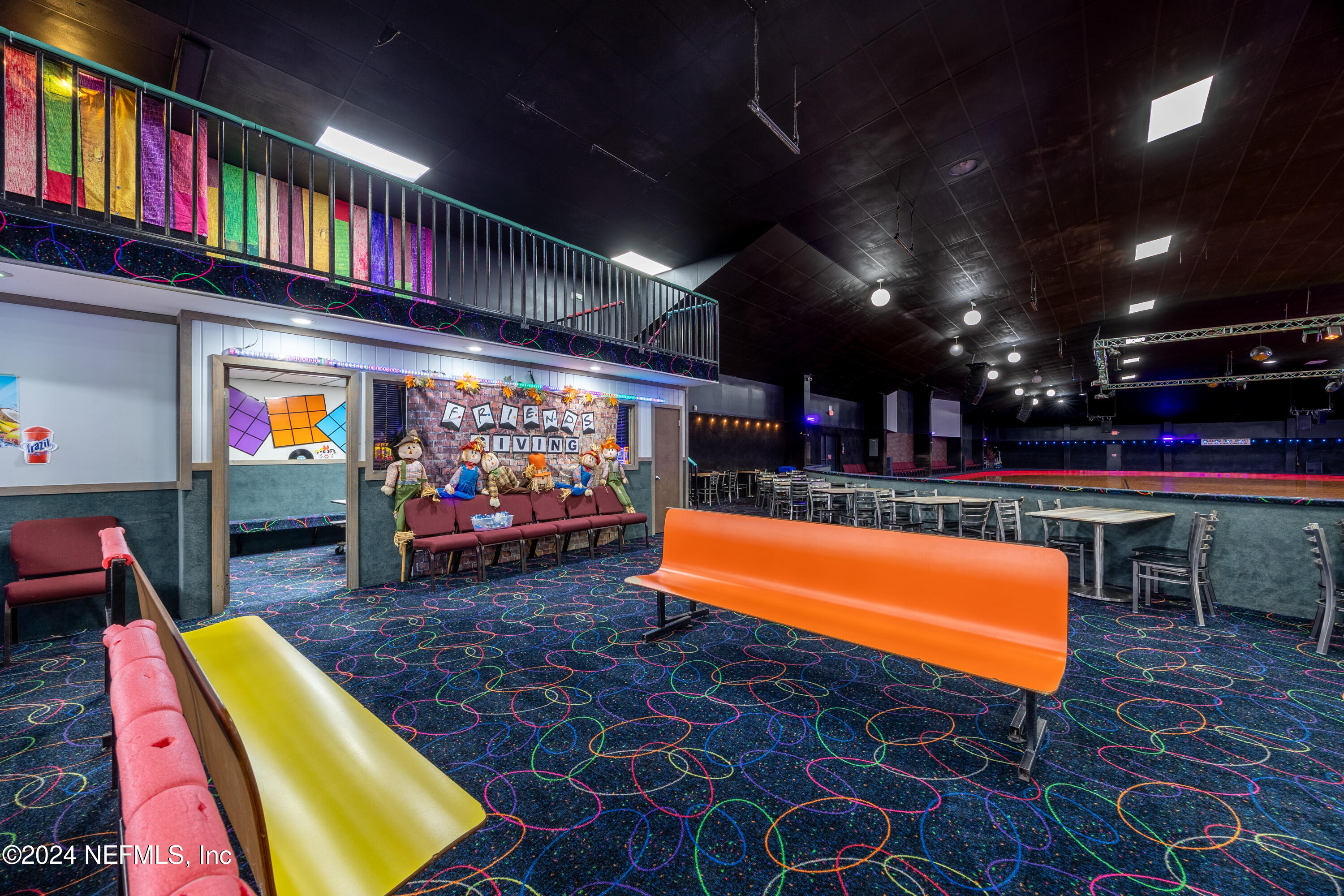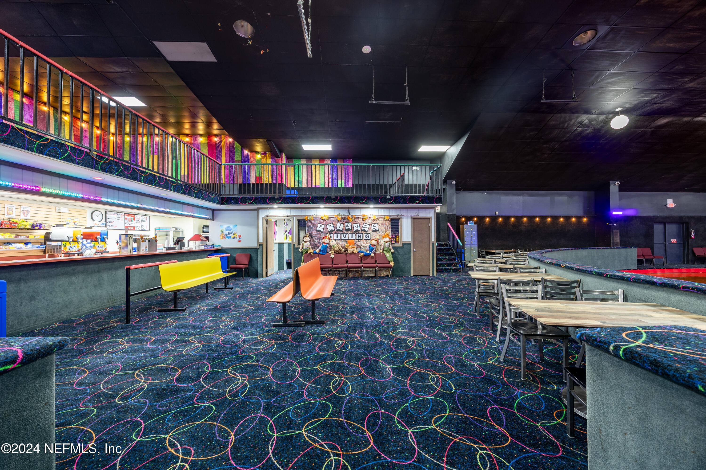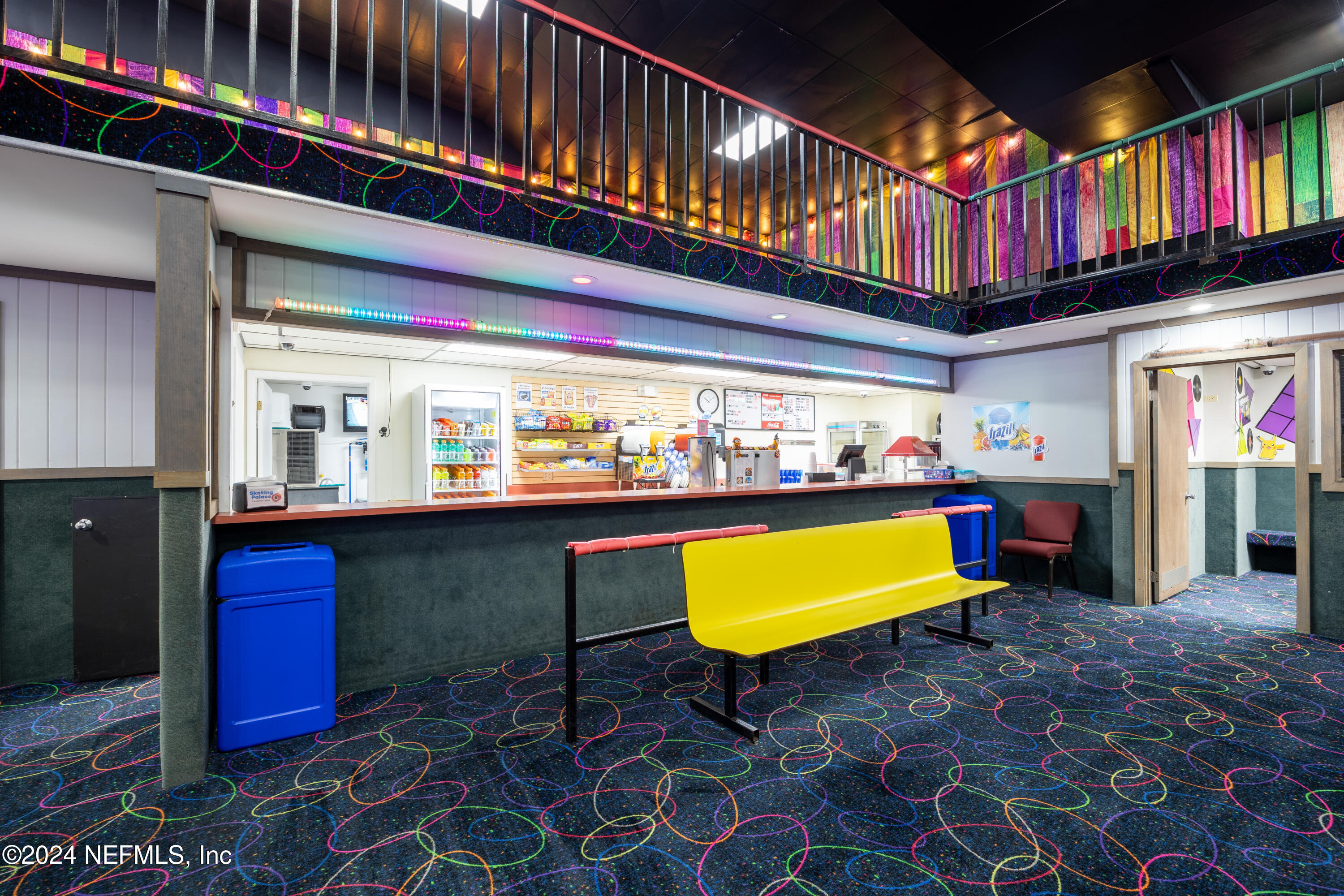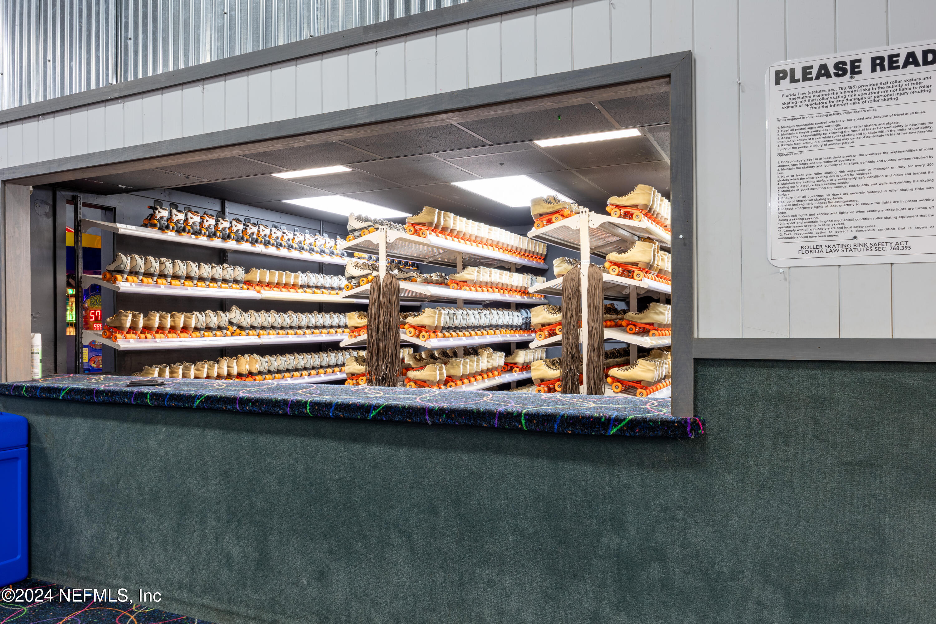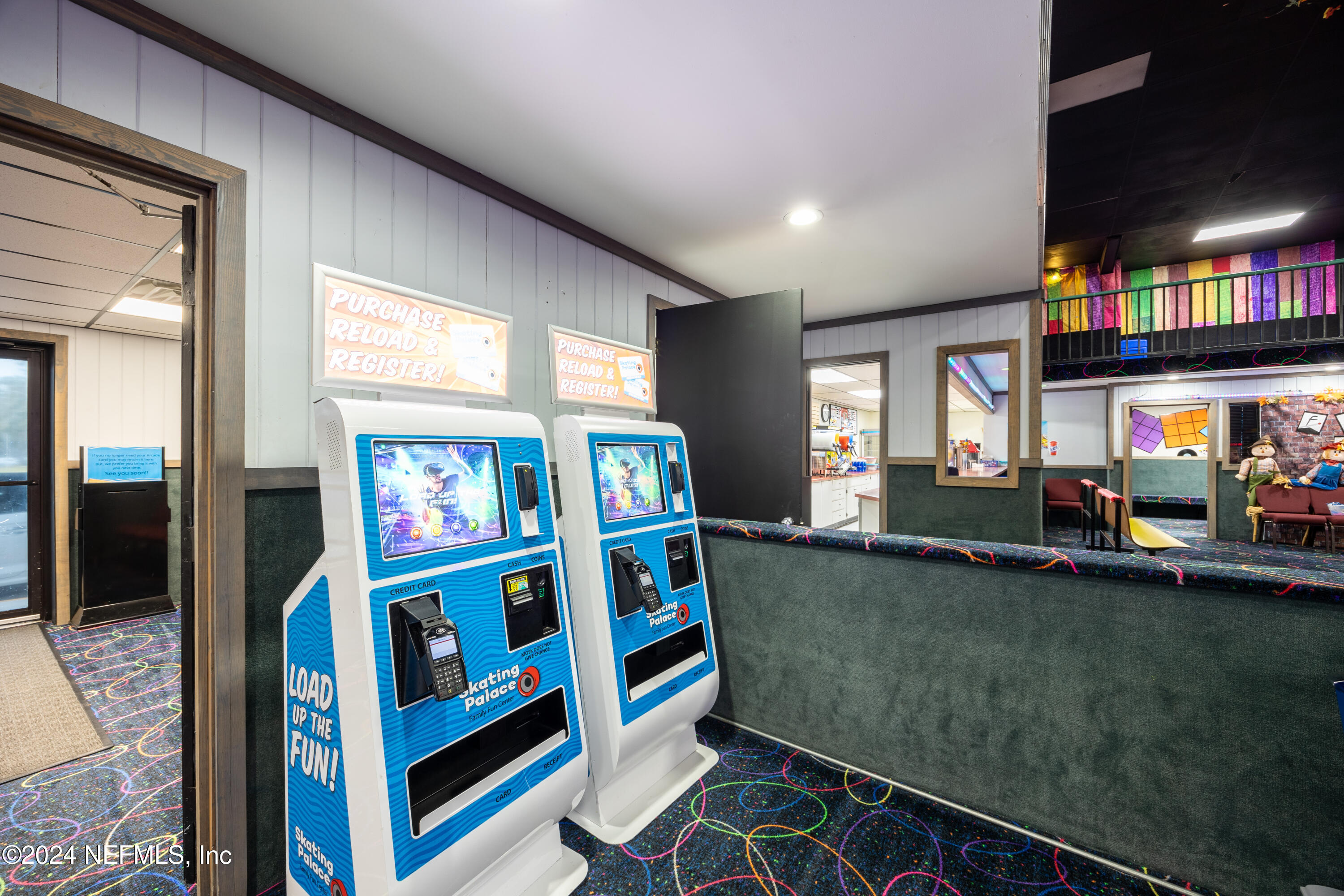 Spacious skating rink with snack bar and arcade games.