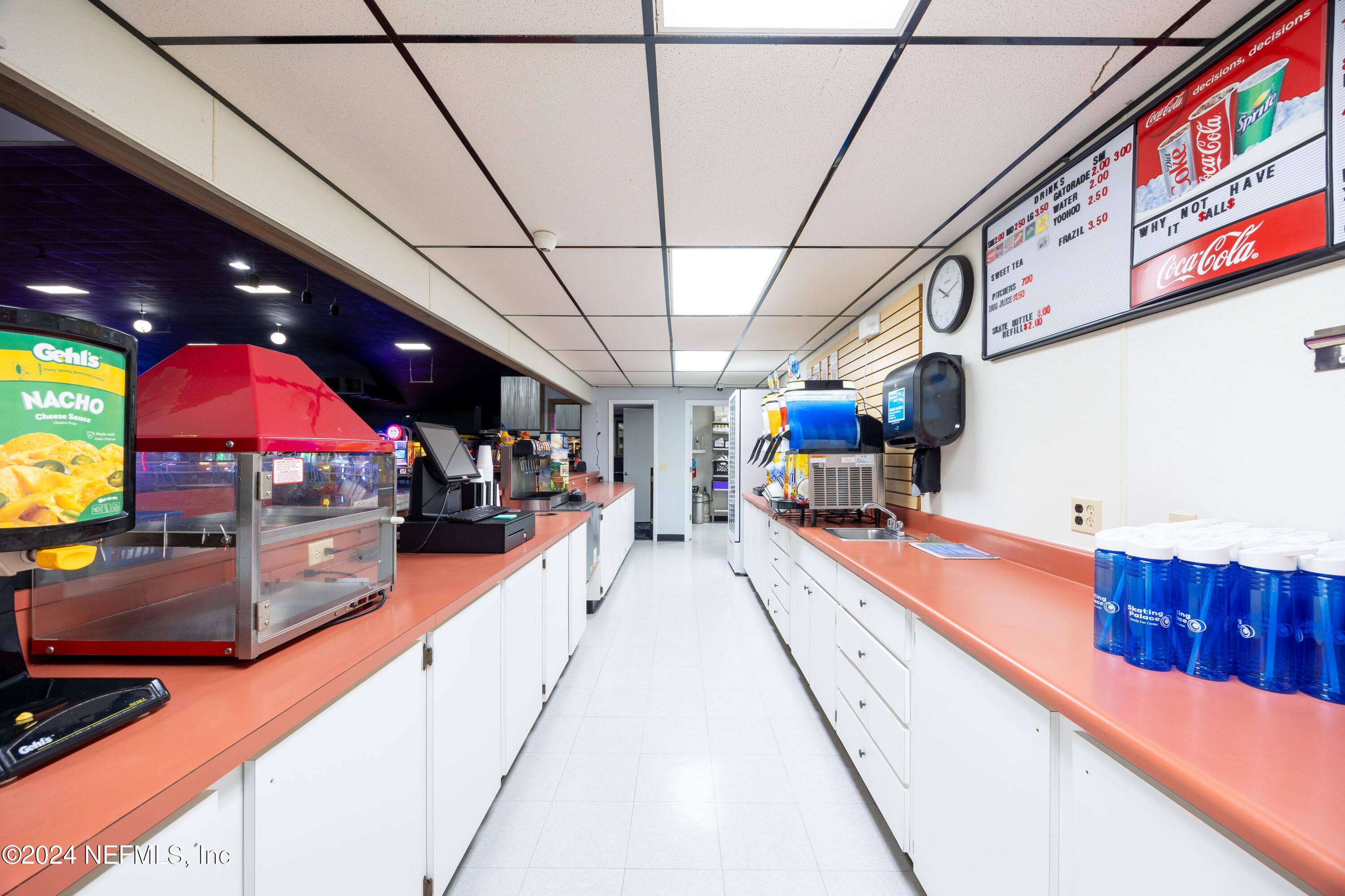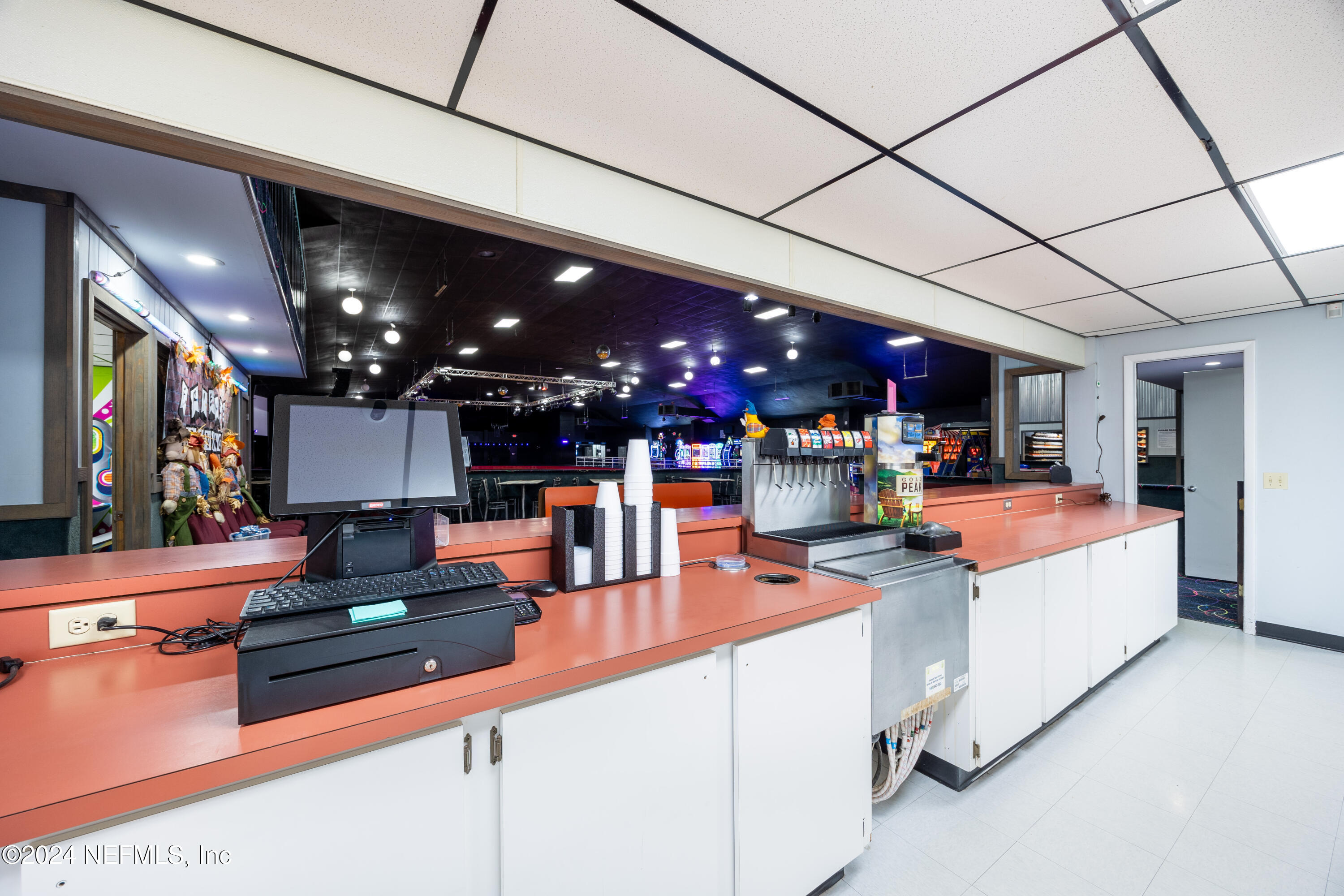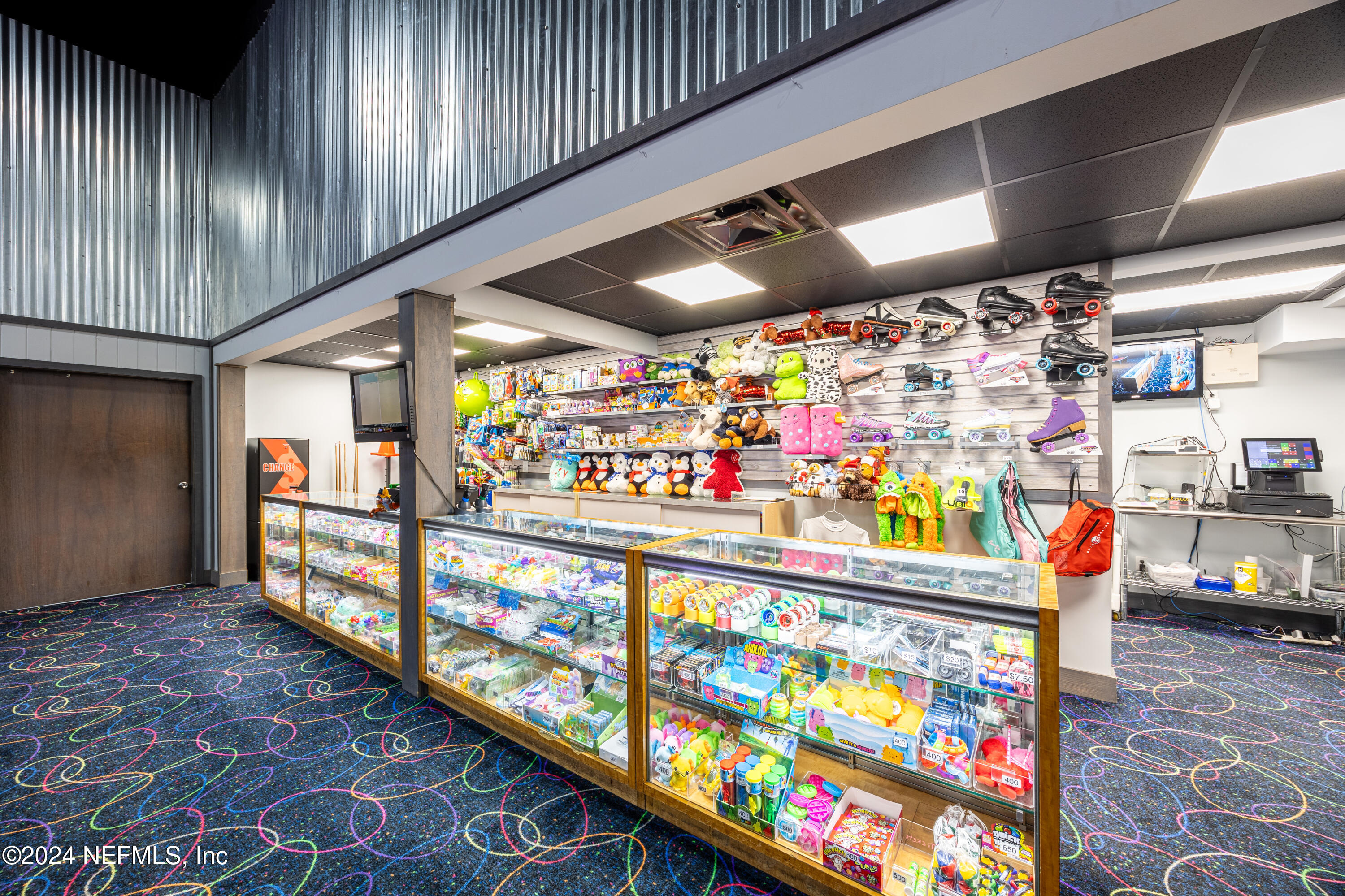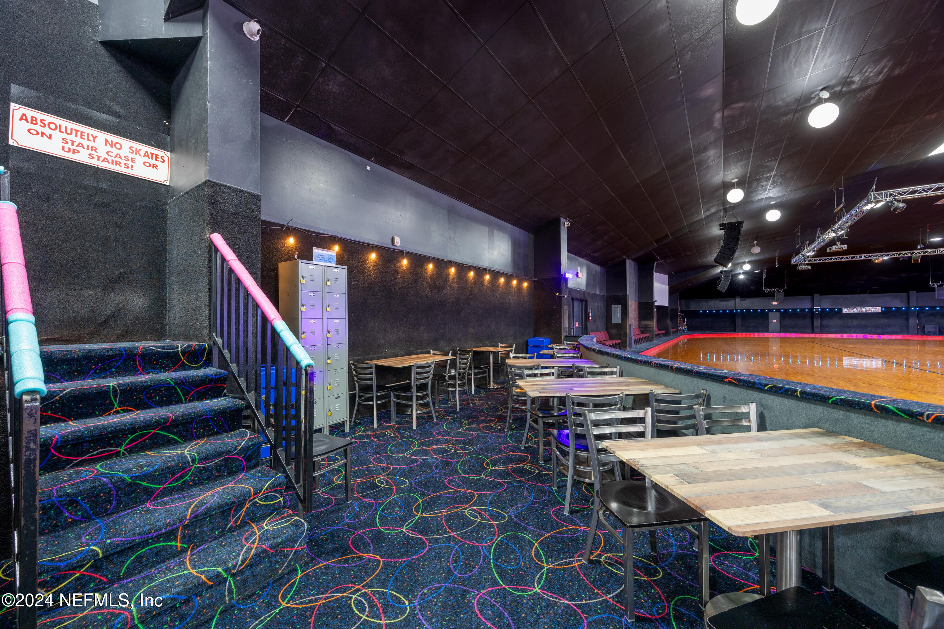 Spacious skating rink with snack bar and arcade games.