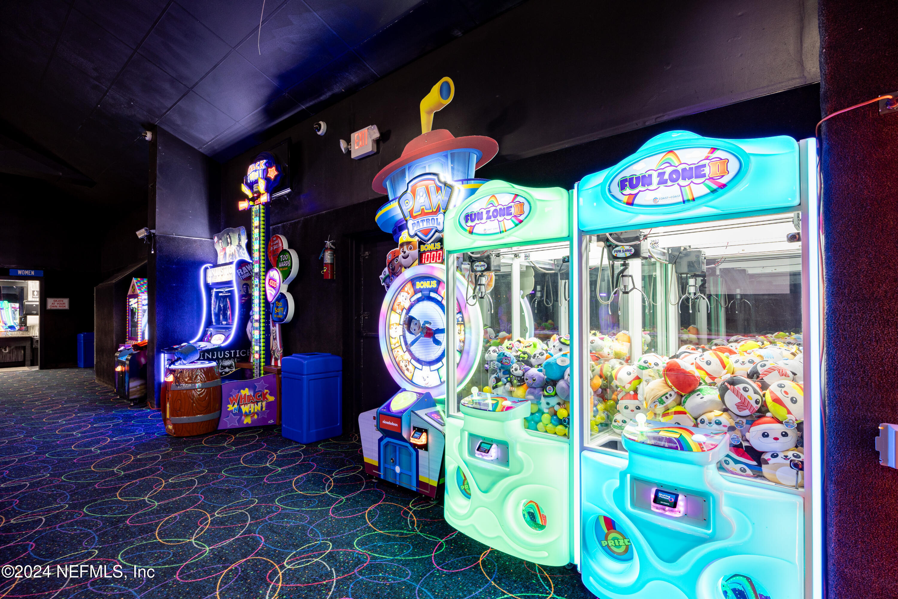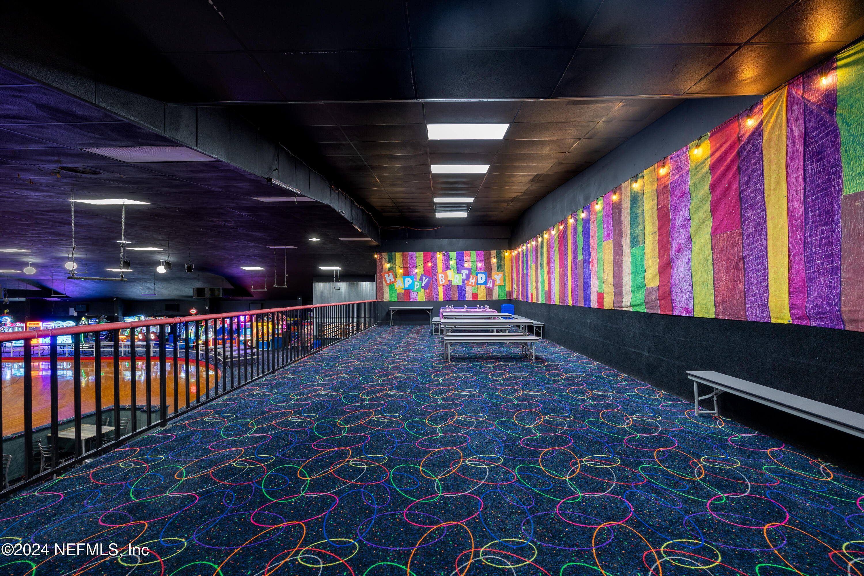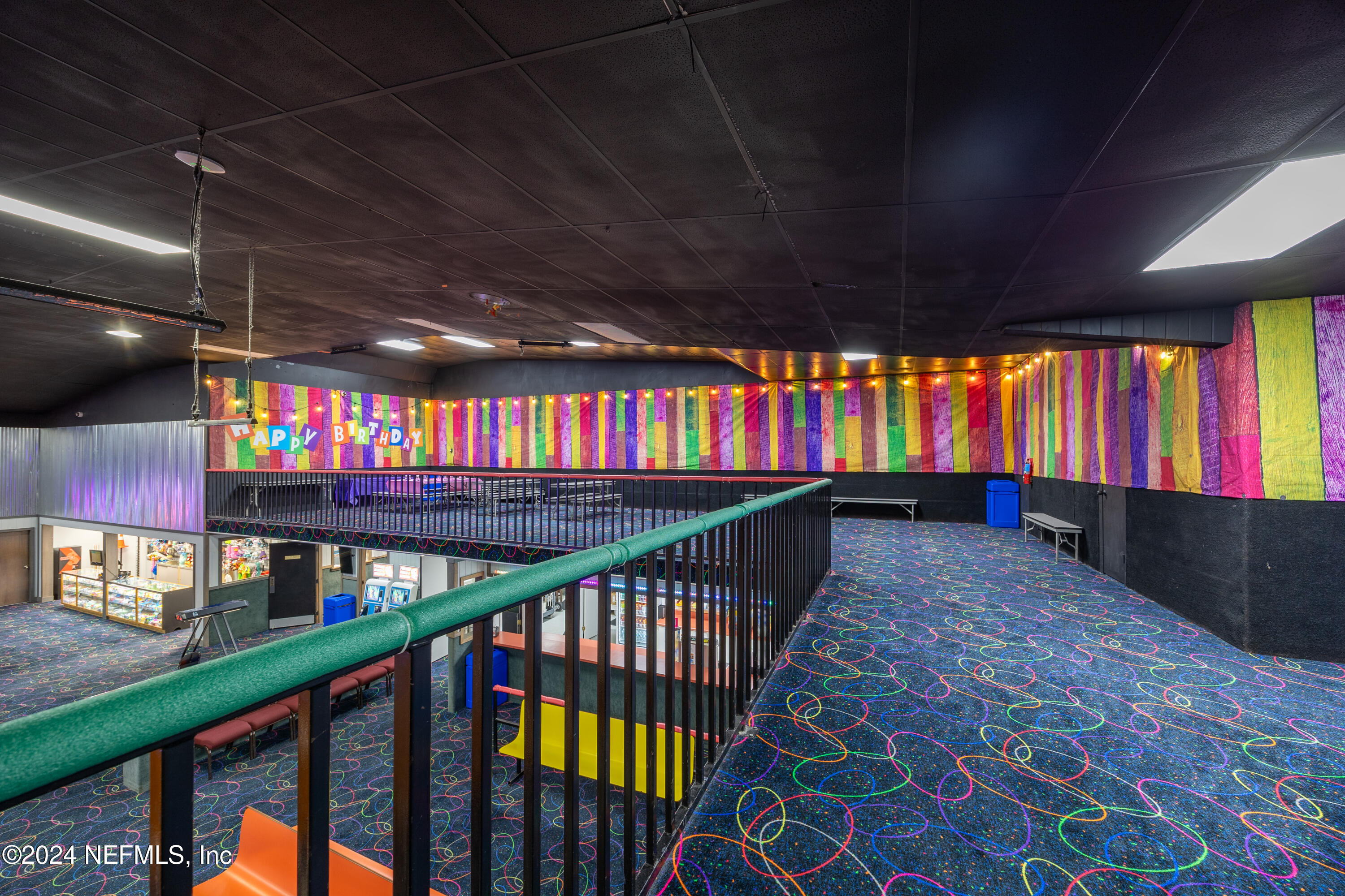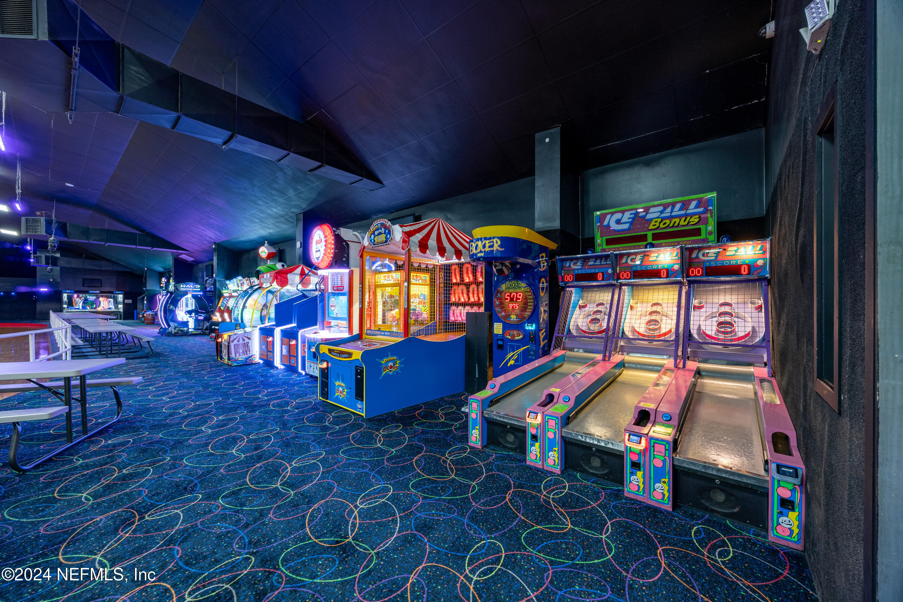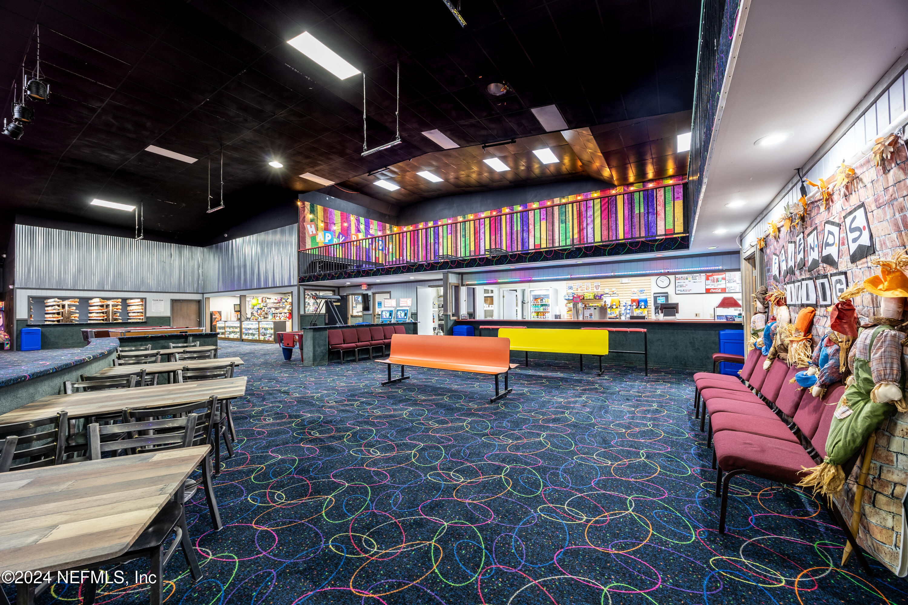 Spacious skating rink with snack bar and arcade games.