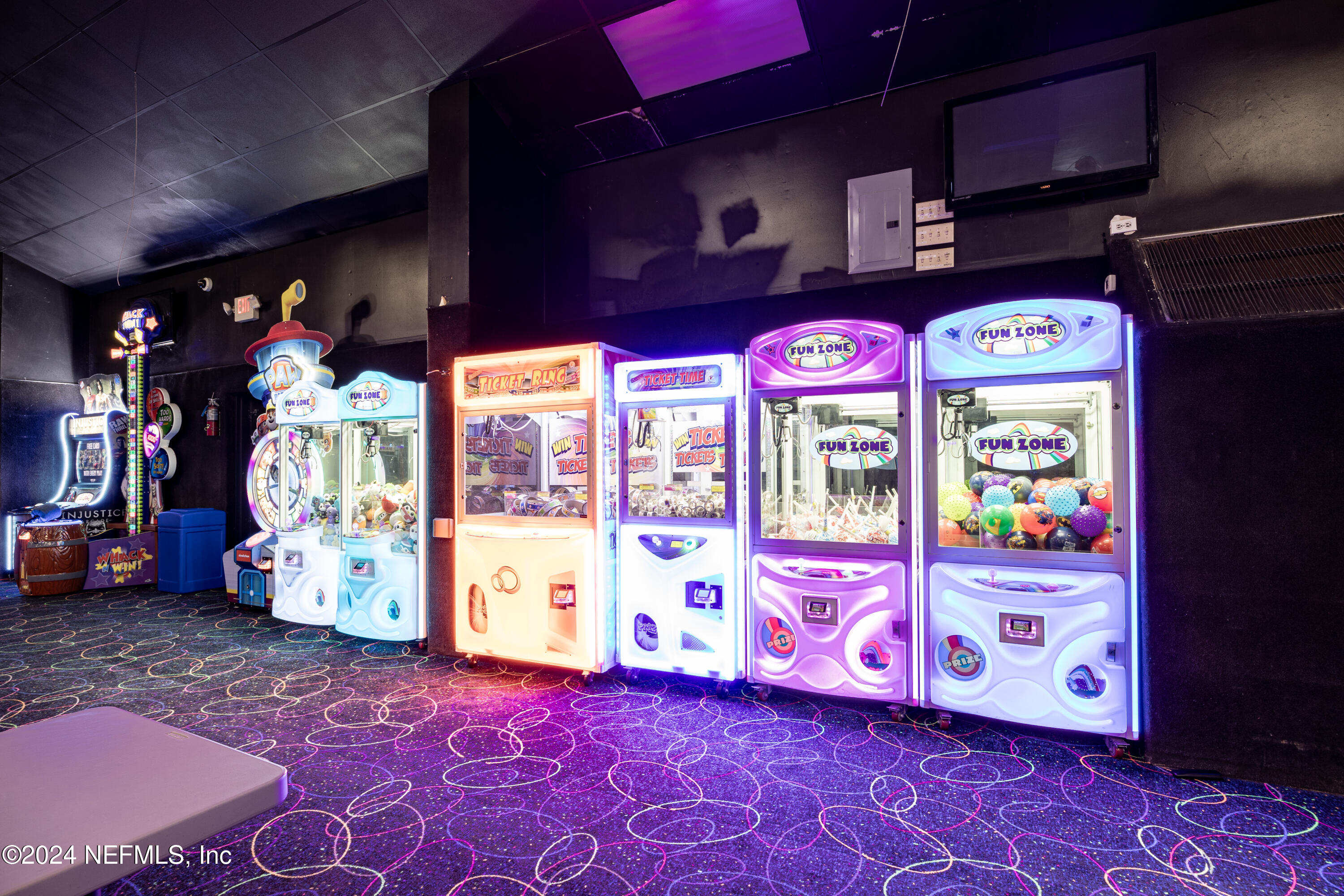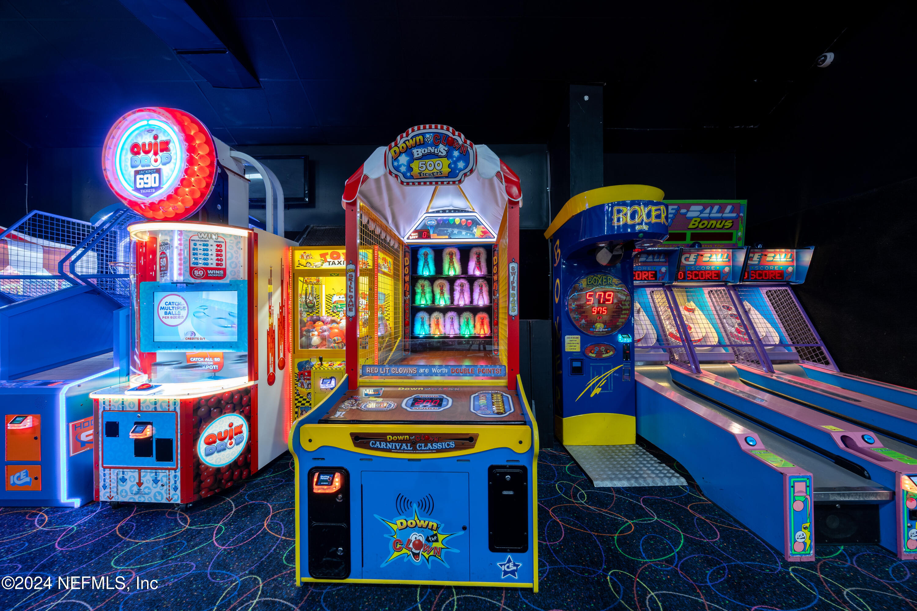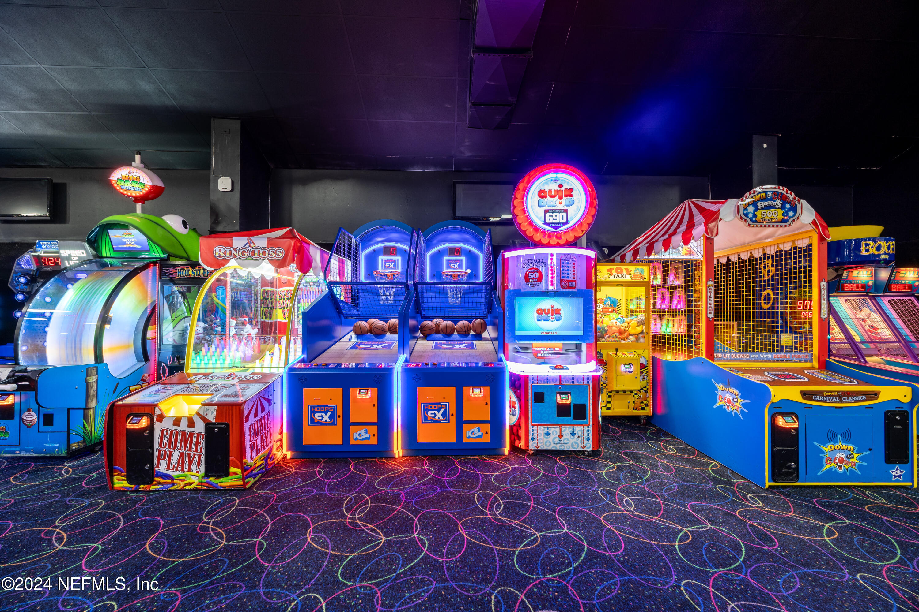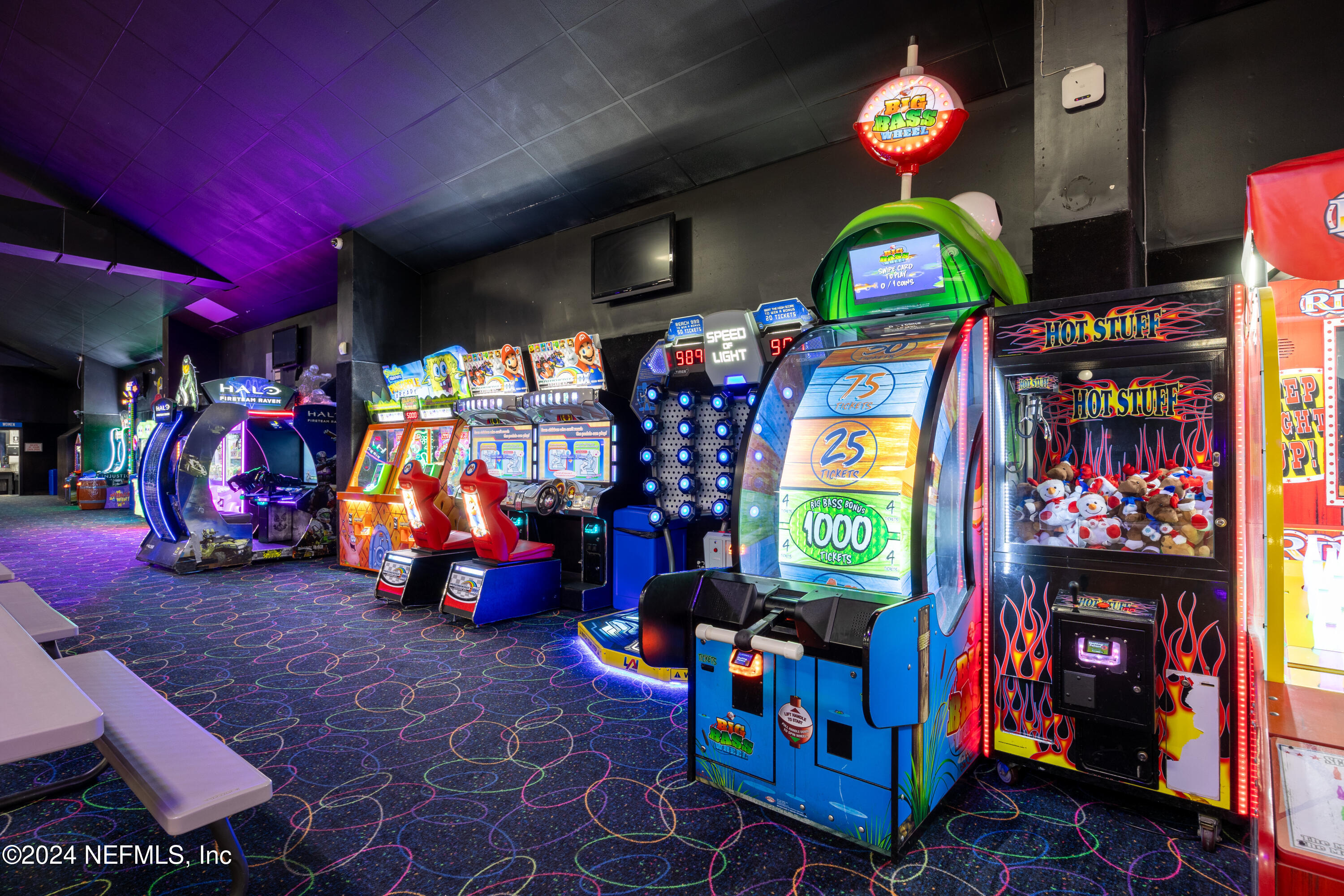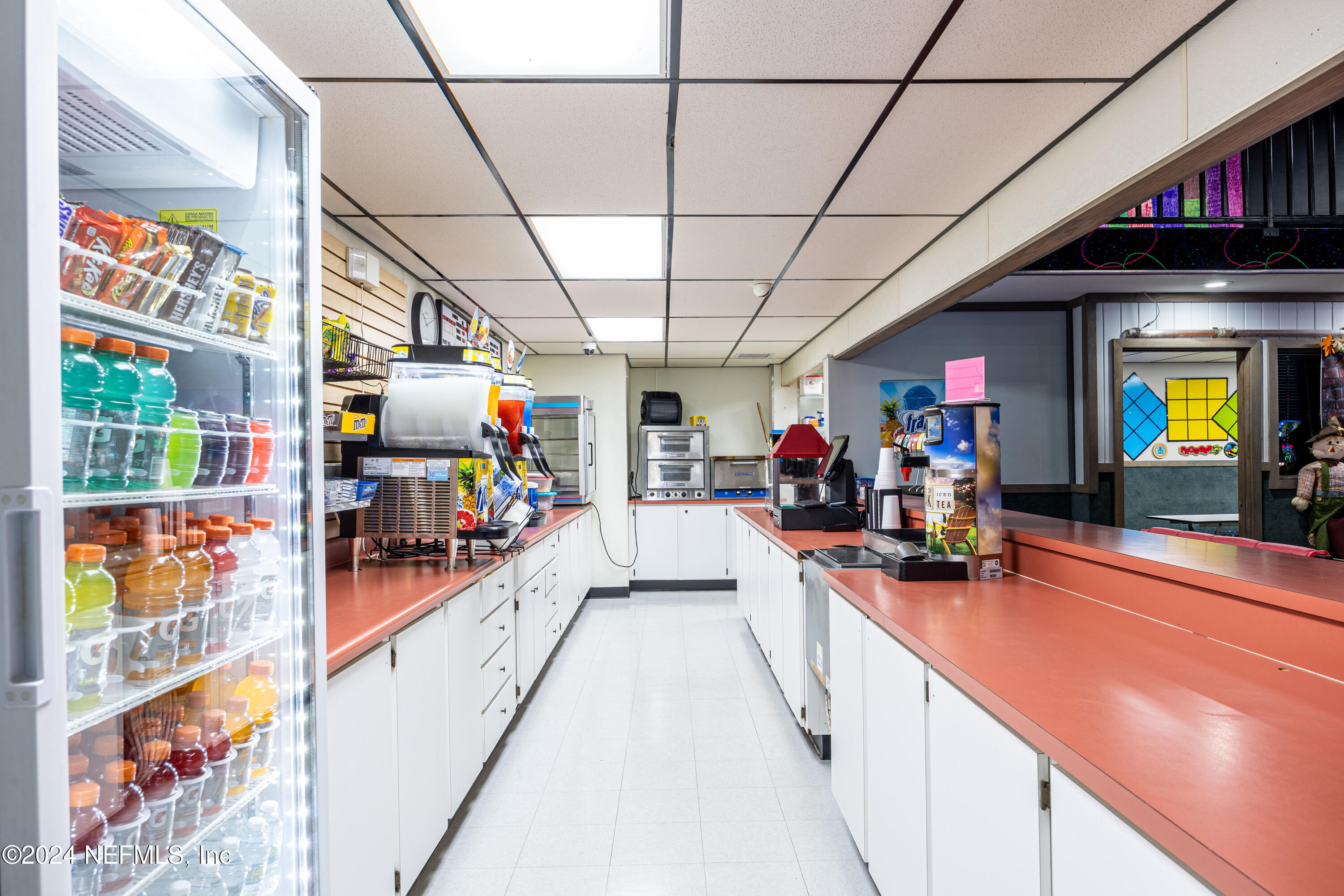 Spacious skating rink with snack bar and arcade games.
