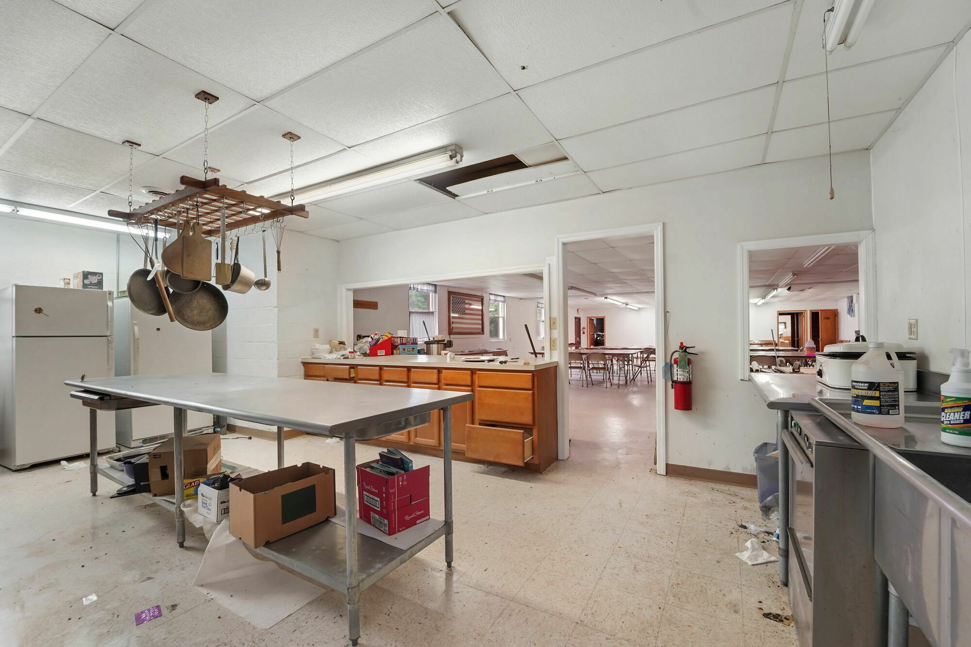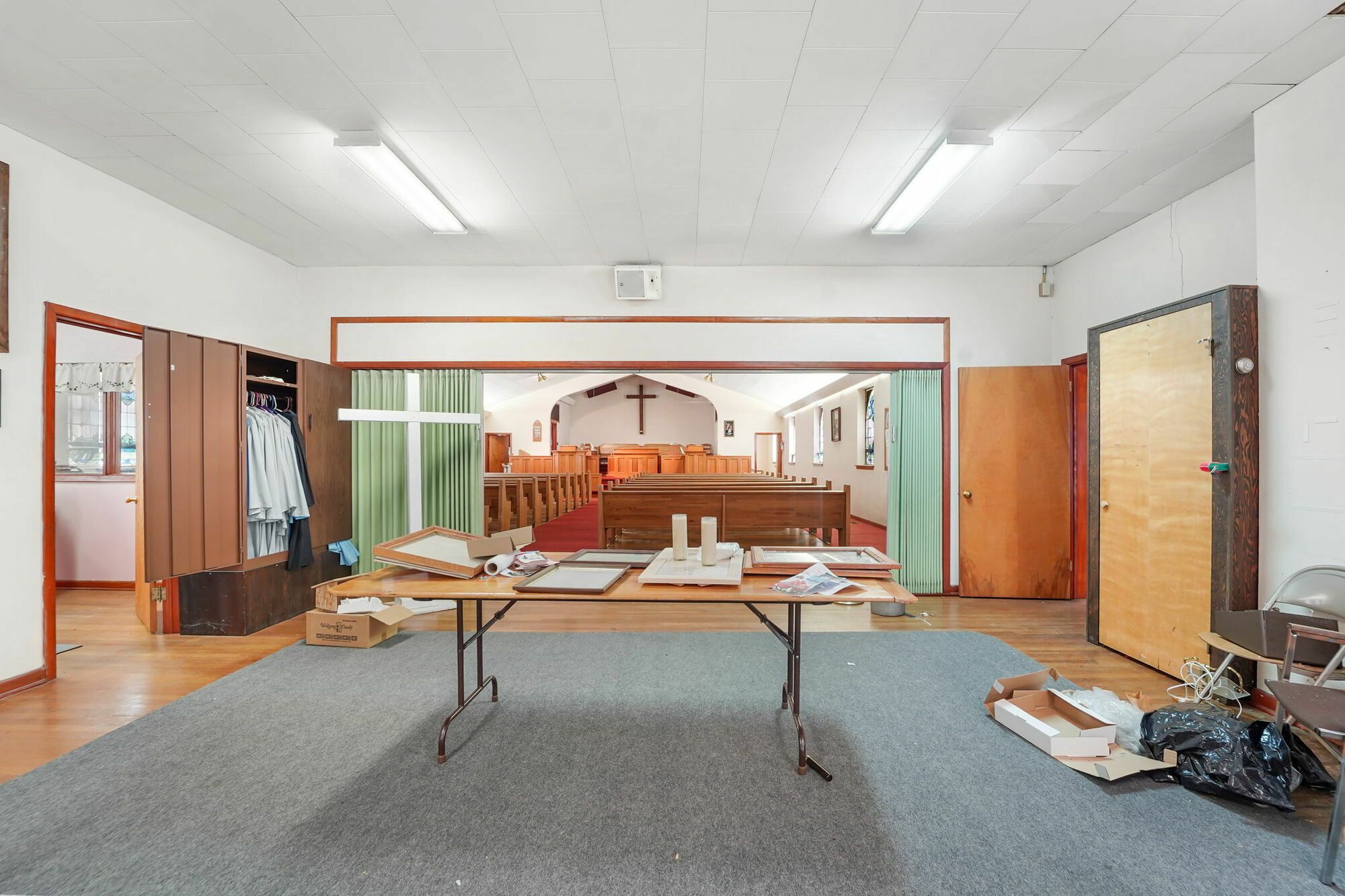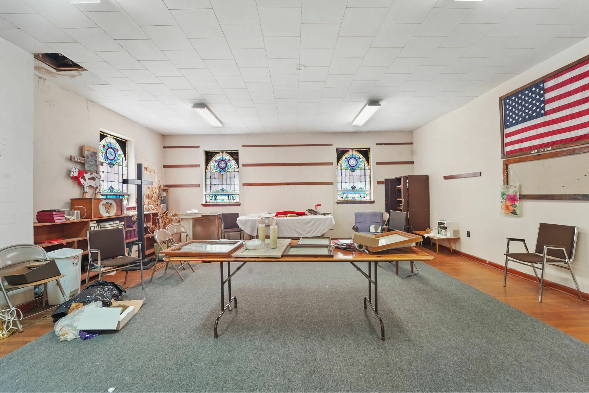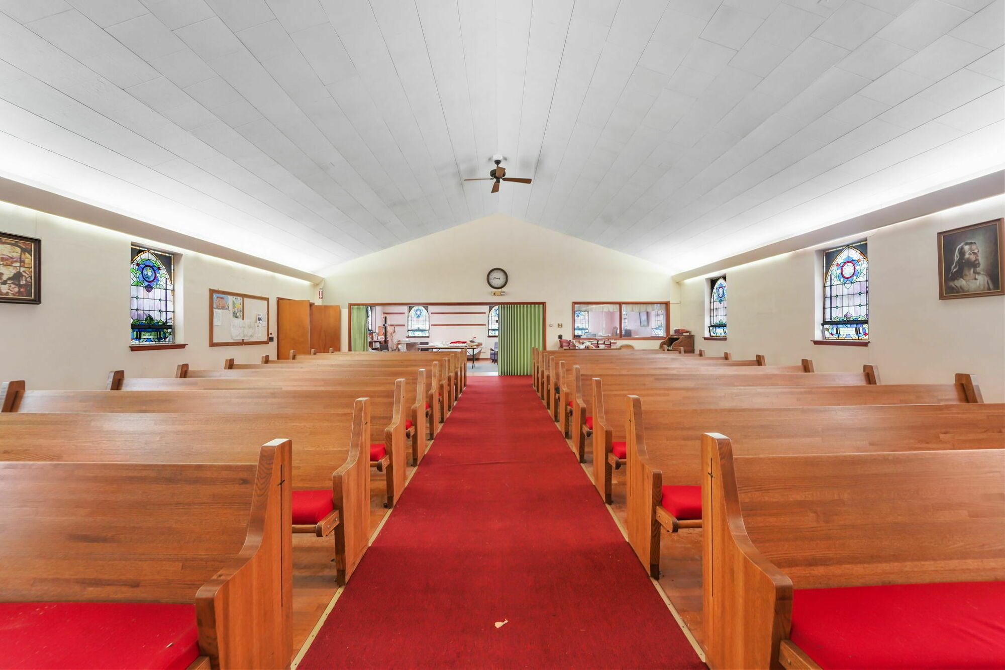 Spacious church with commercial kitchen and ample parking.