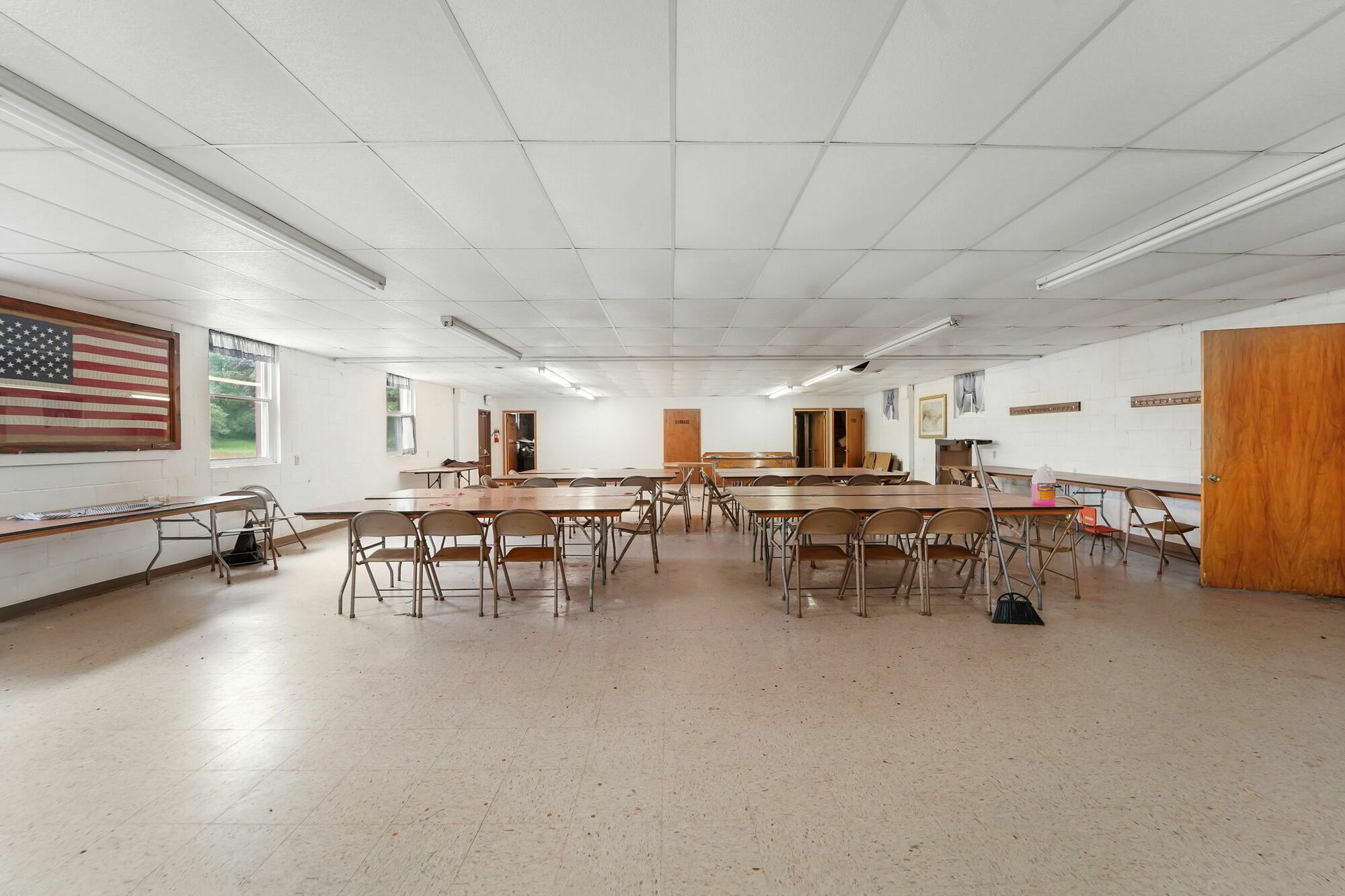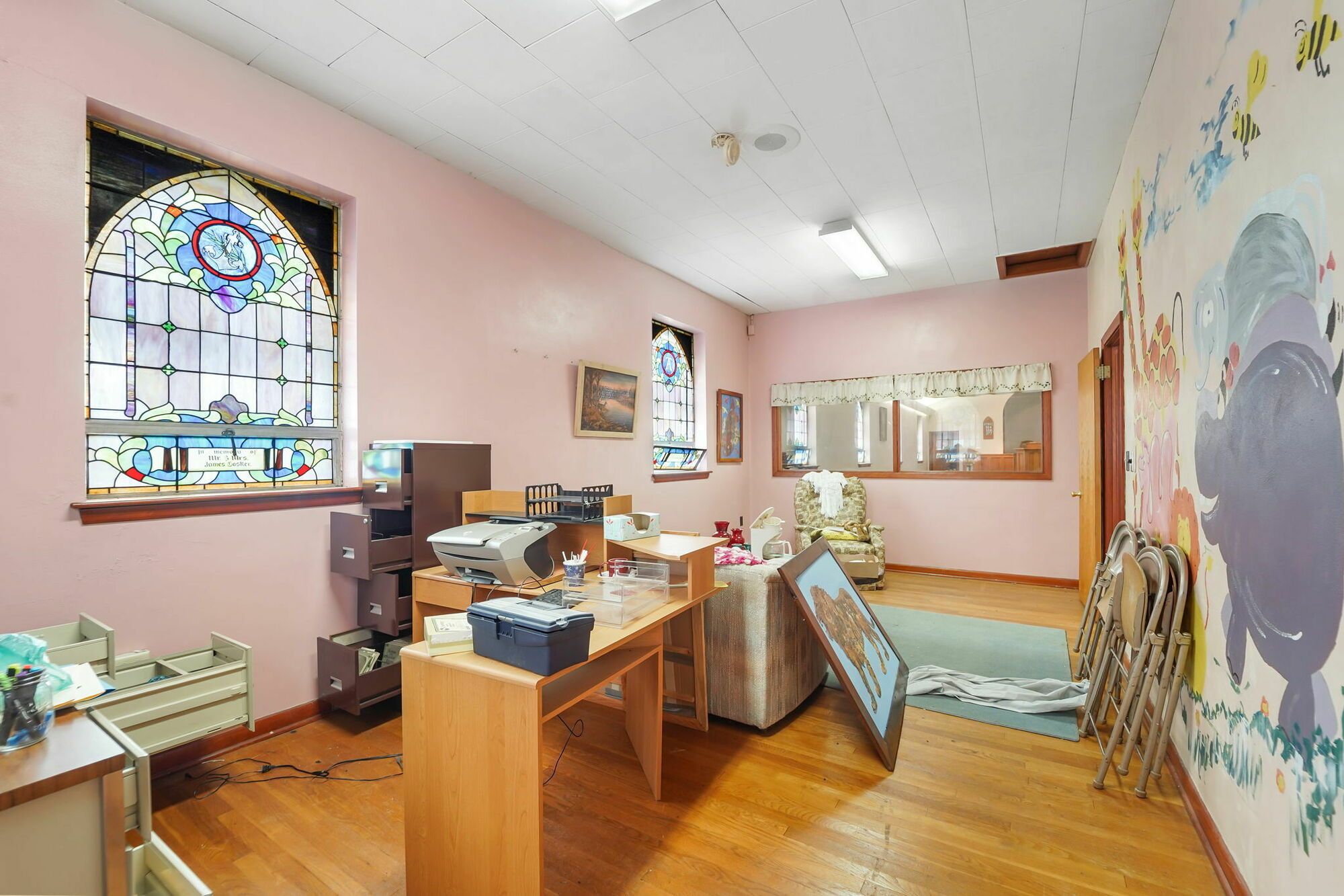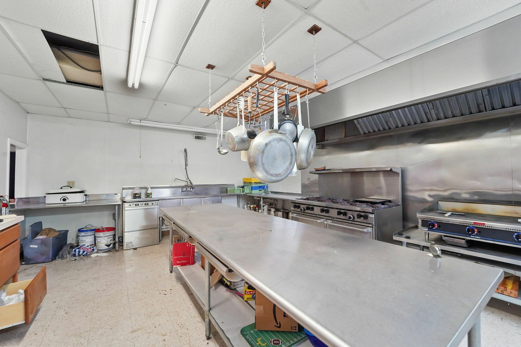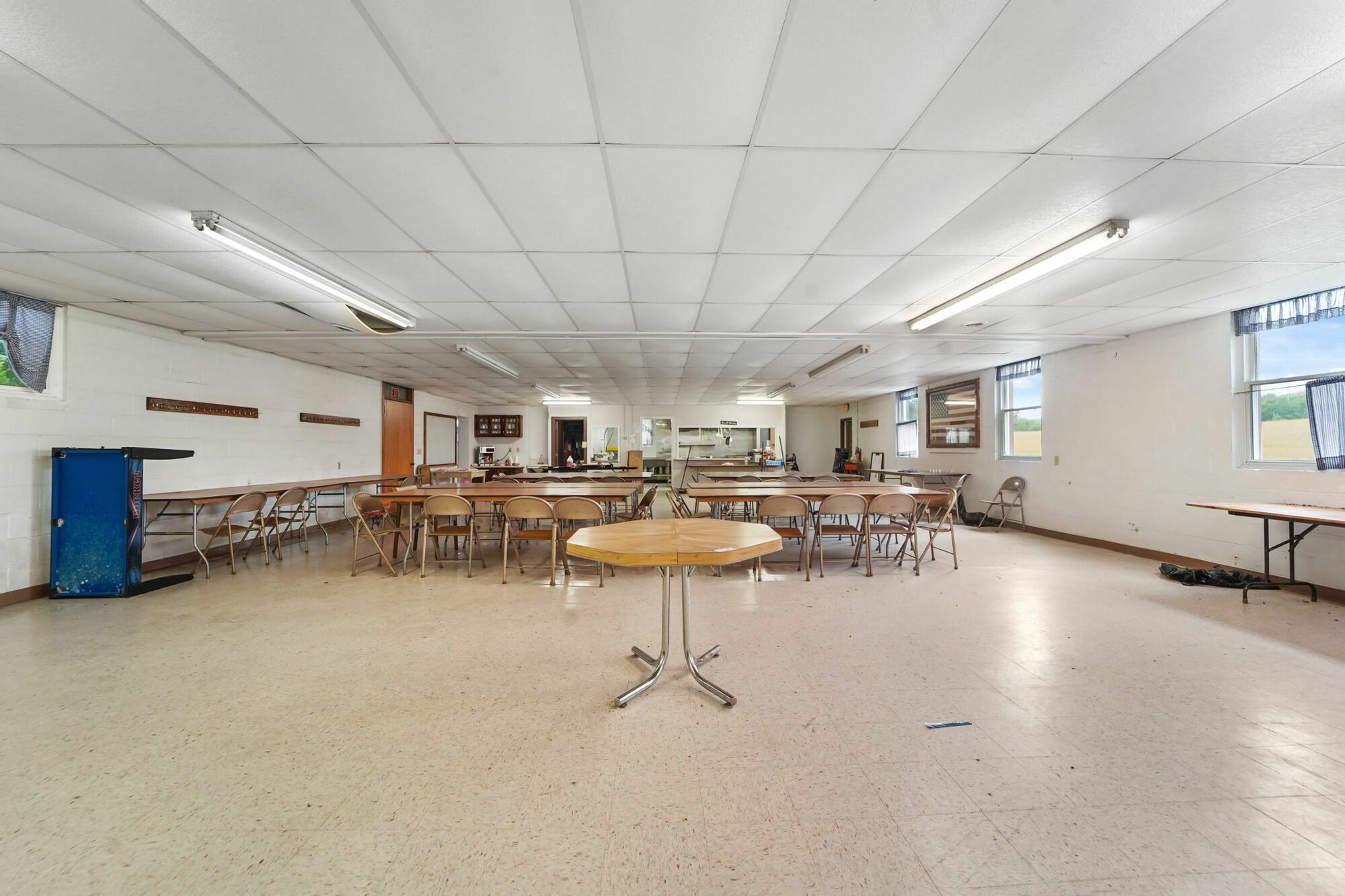 Spacious church with commercial kitchen and ample parking.