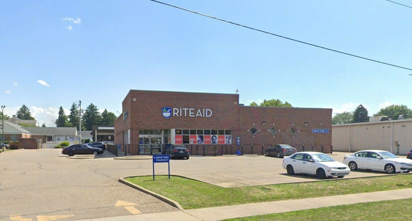 Available retail building with drive-thru and ample parking.