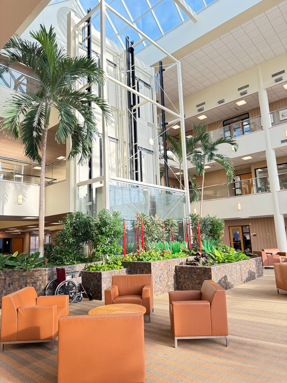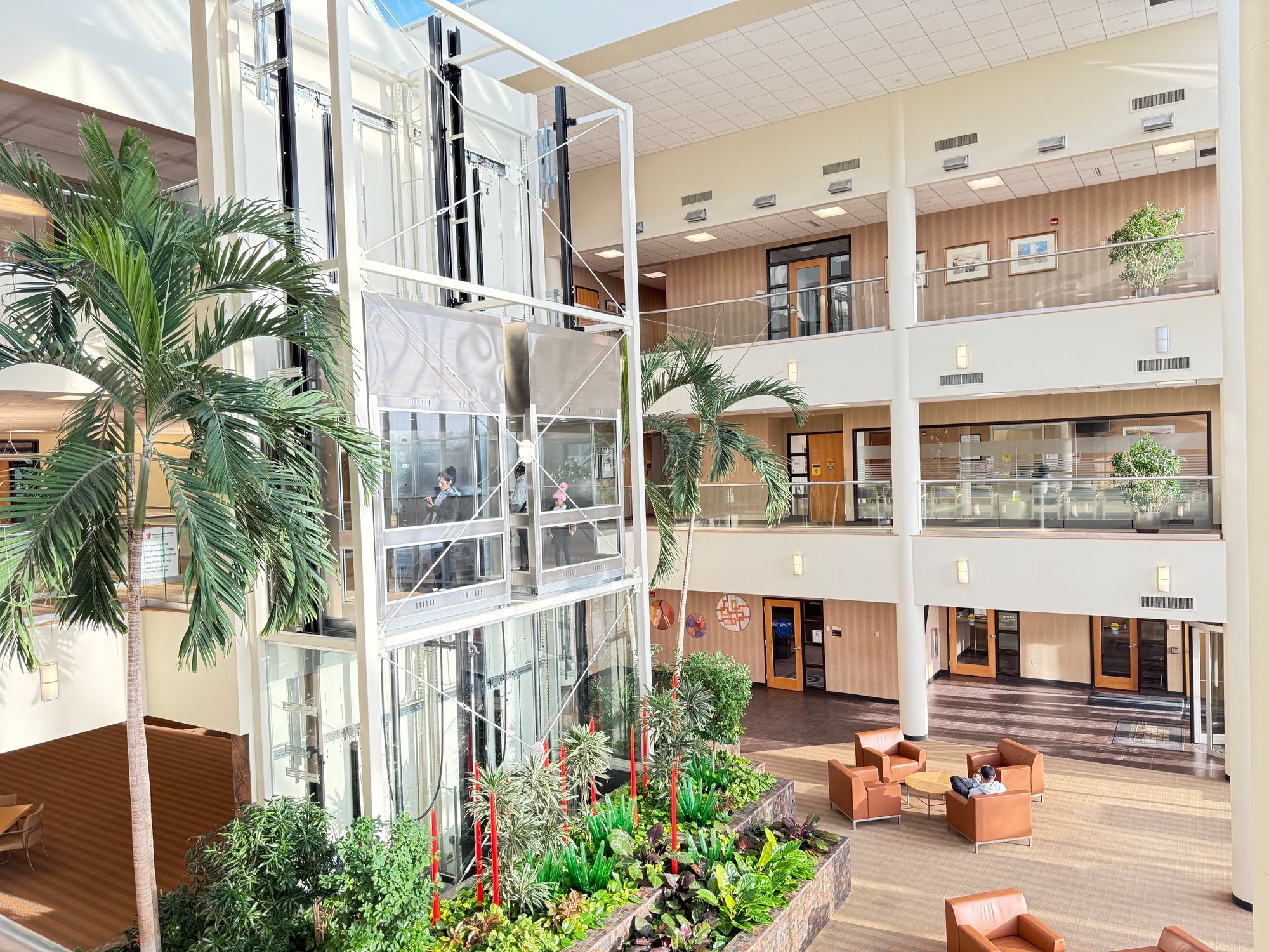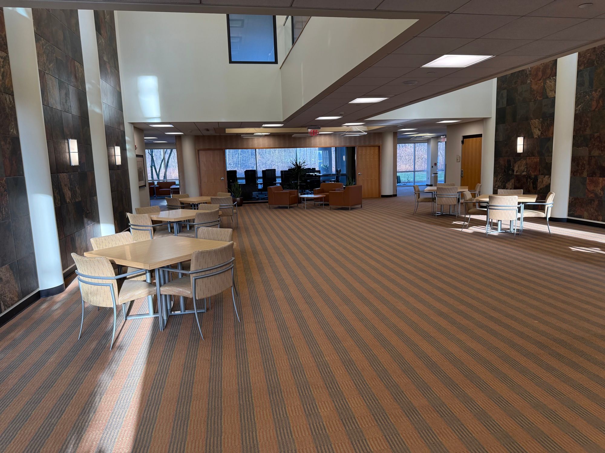 Office building with atrium, conference room, and patio.