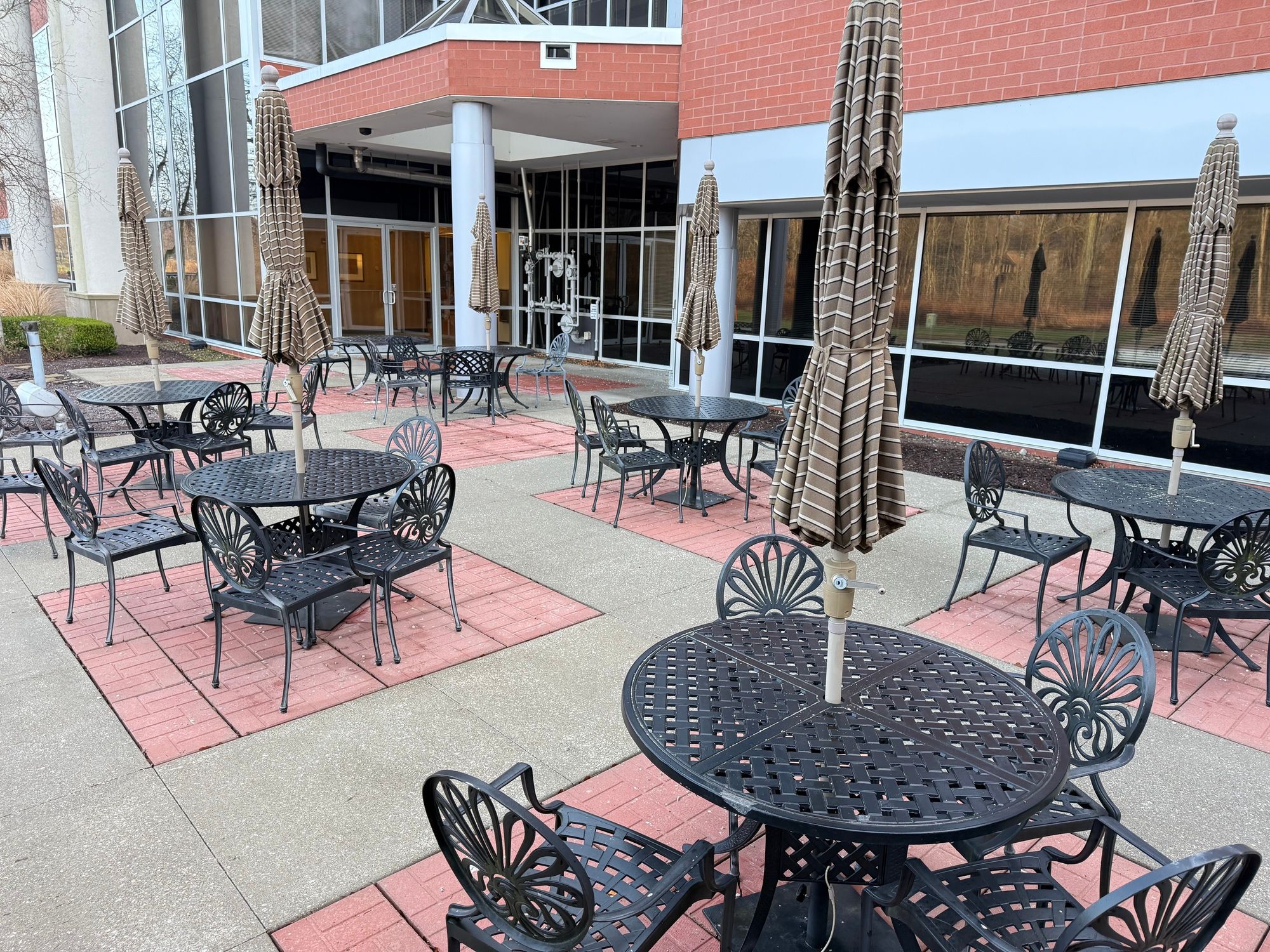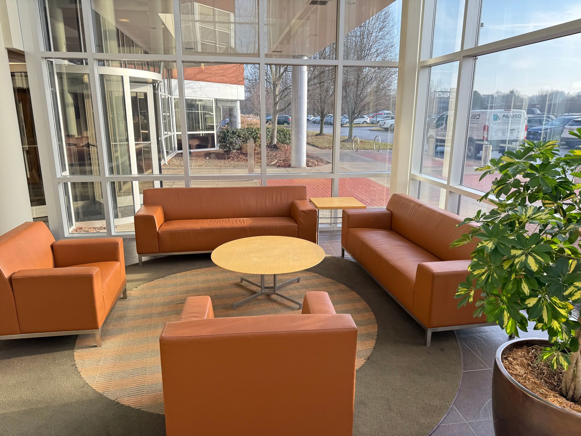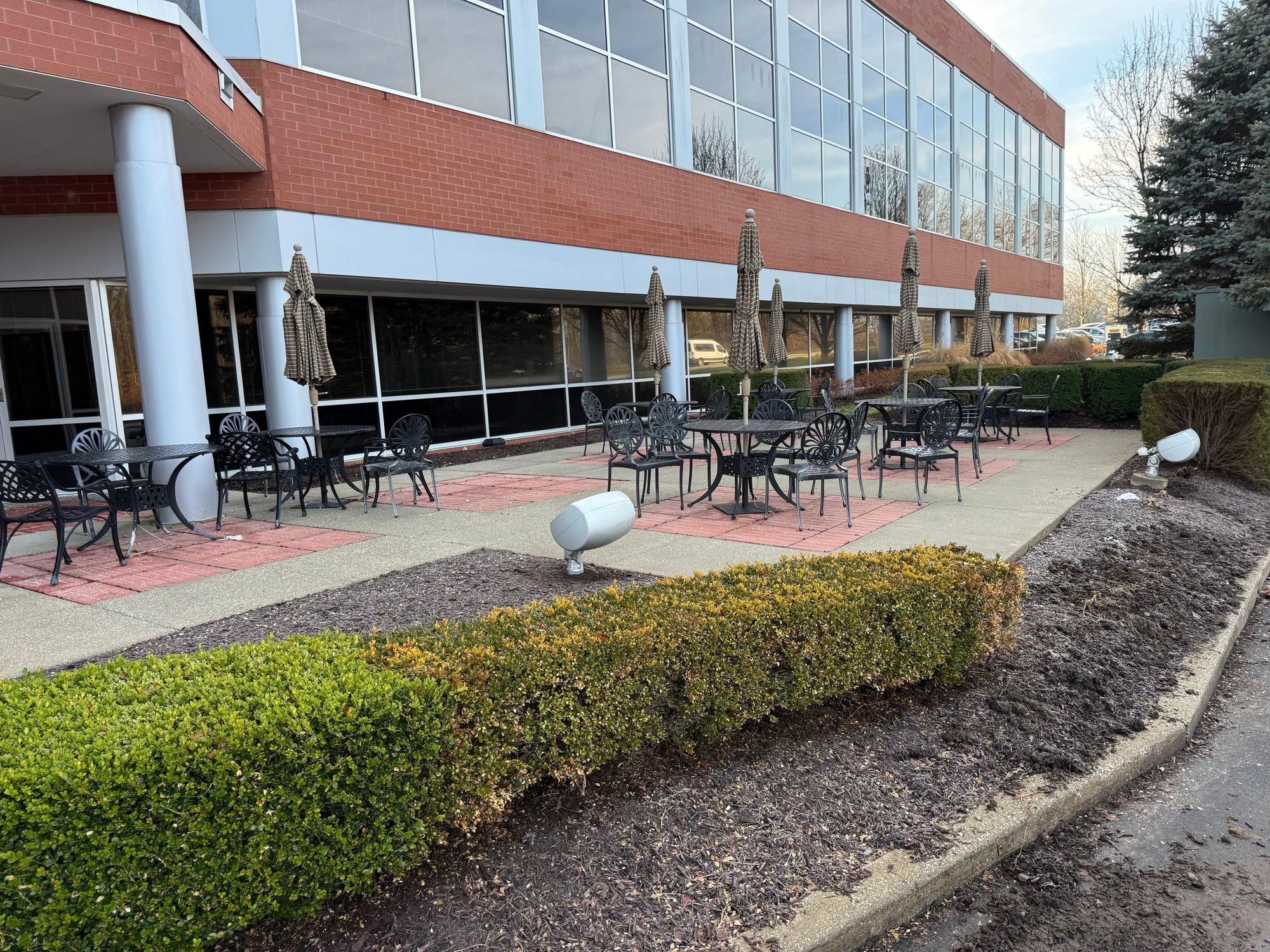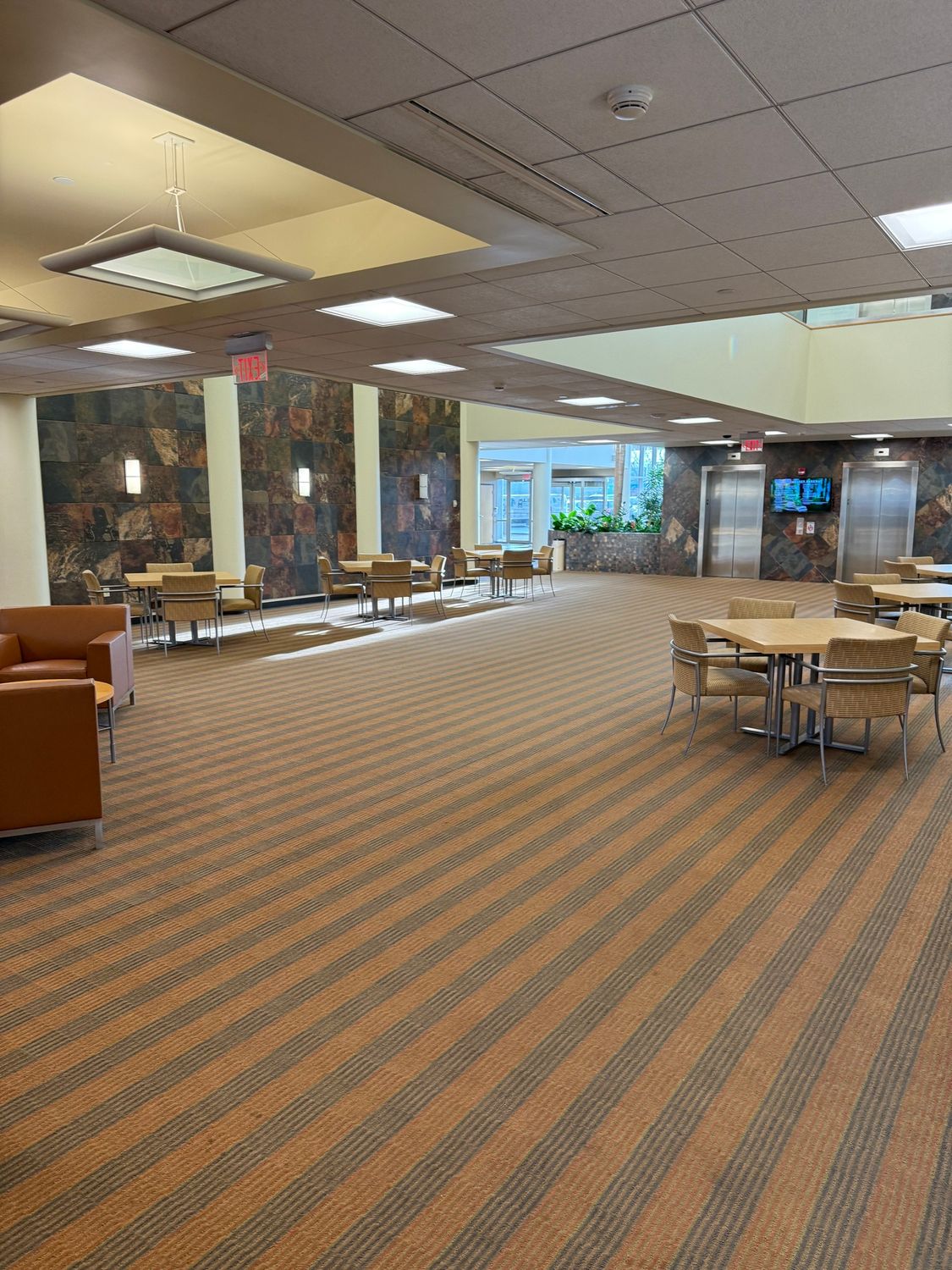 Office building with atrium, conference room, and patio.