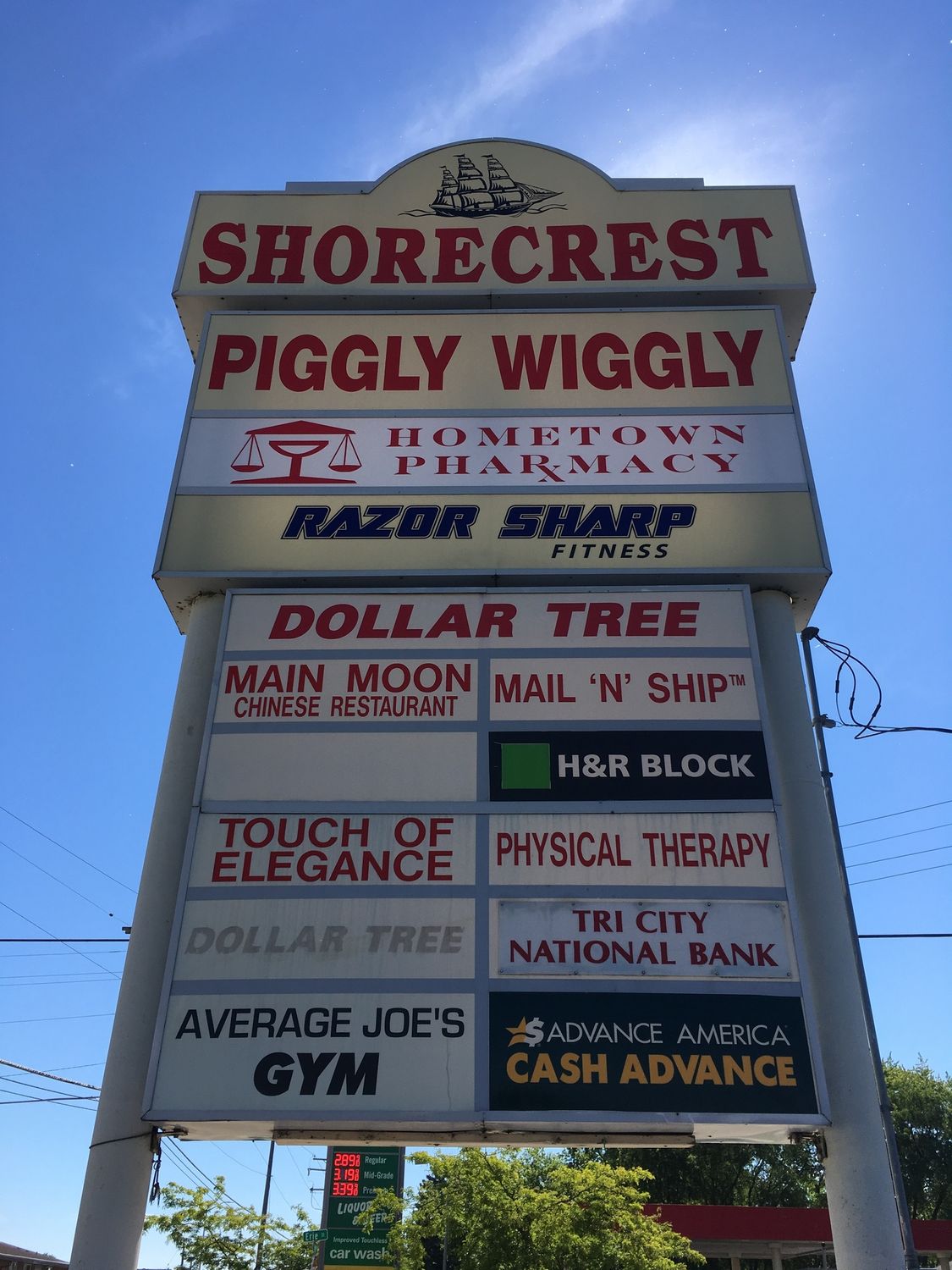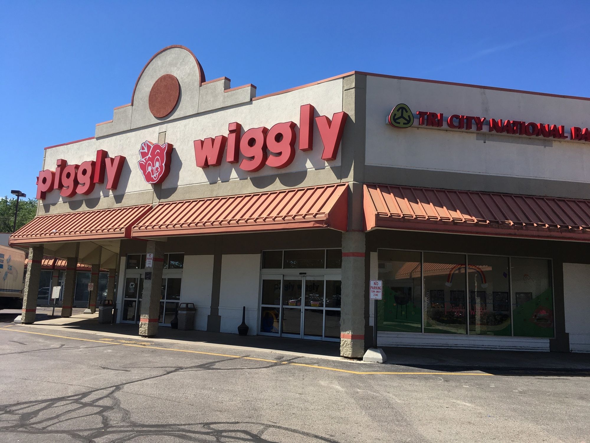 Neighborhood shopping center anchored by Piggly Wiggly with ample parking.