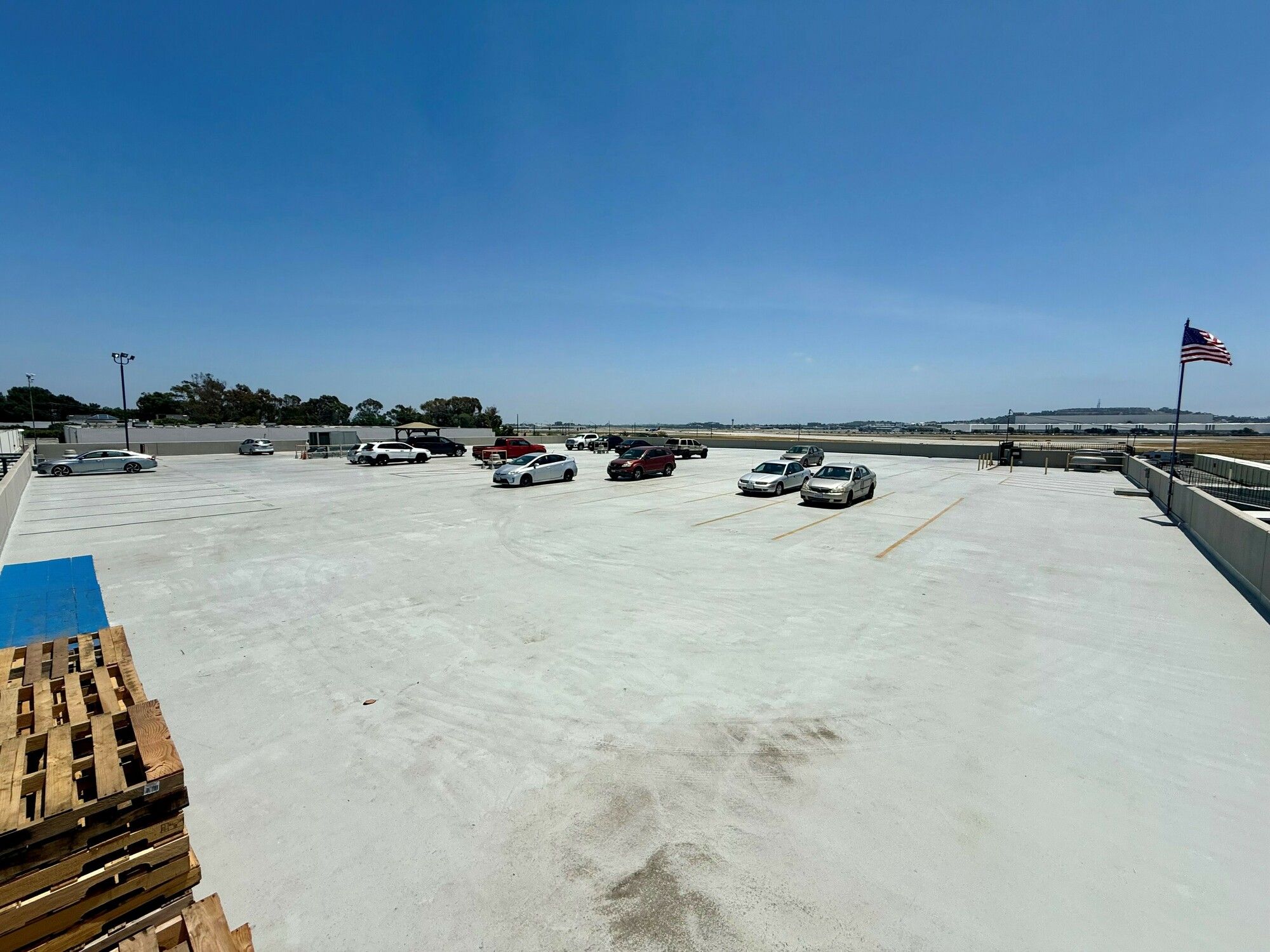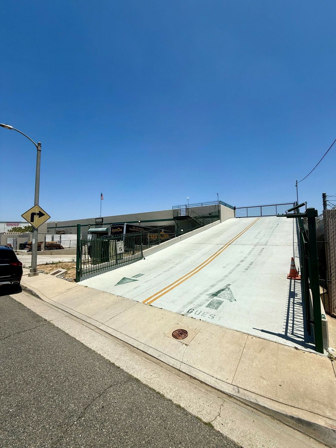 Freestanding building with loading docks and rooftop parking.