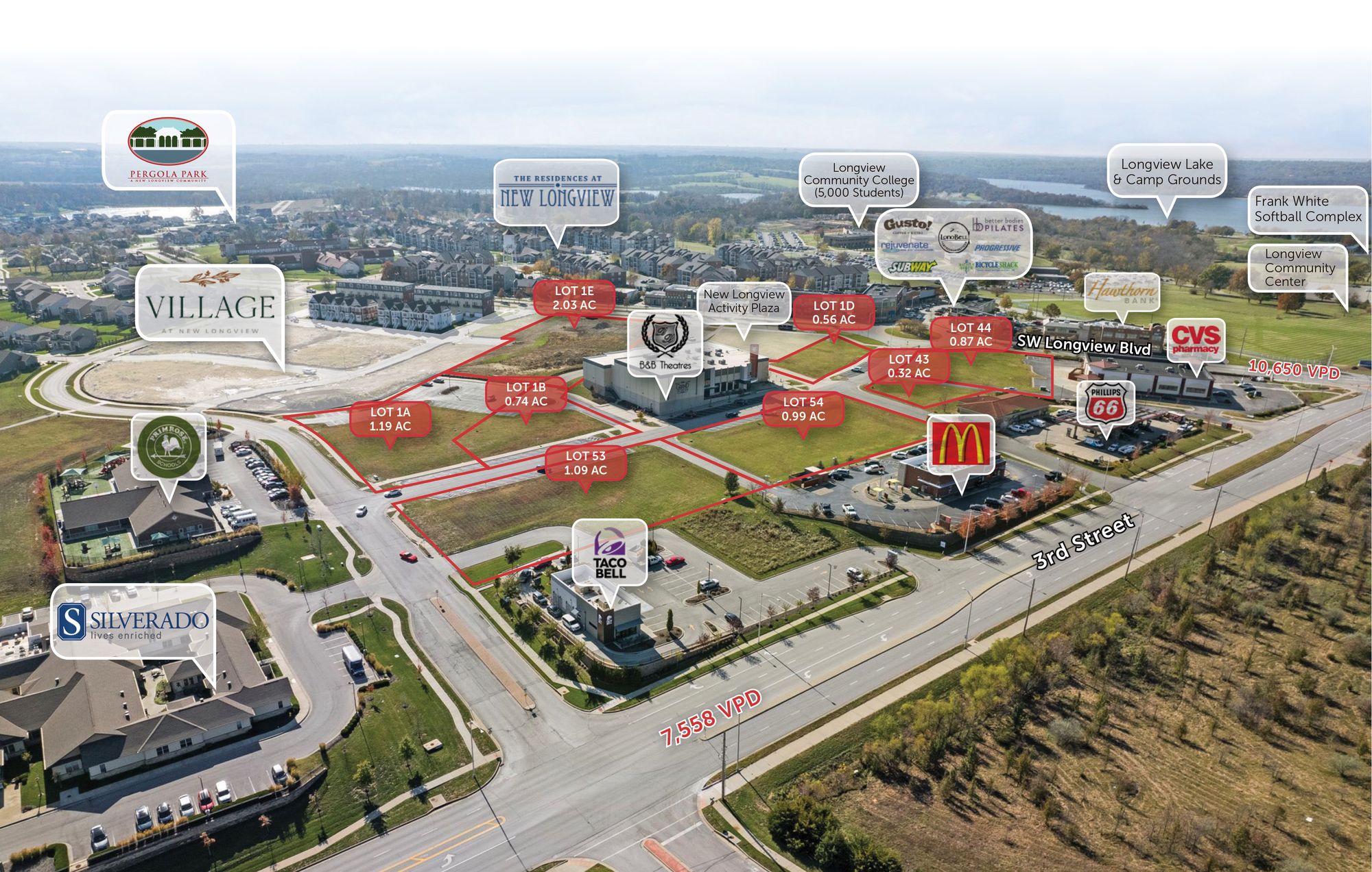Commercial lots available for retail, office, restaurant, and medical uses.