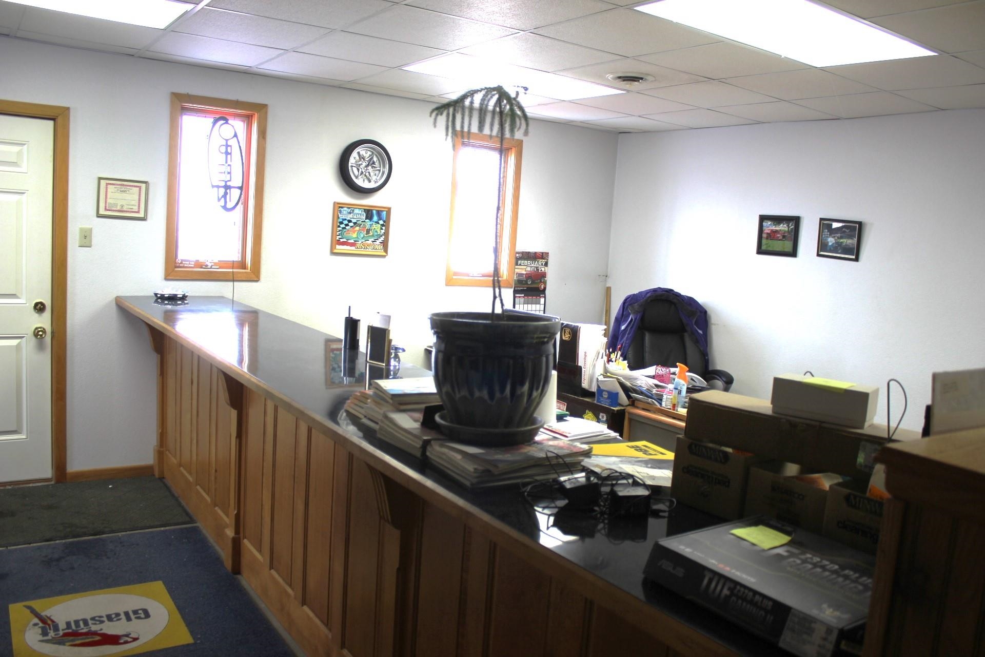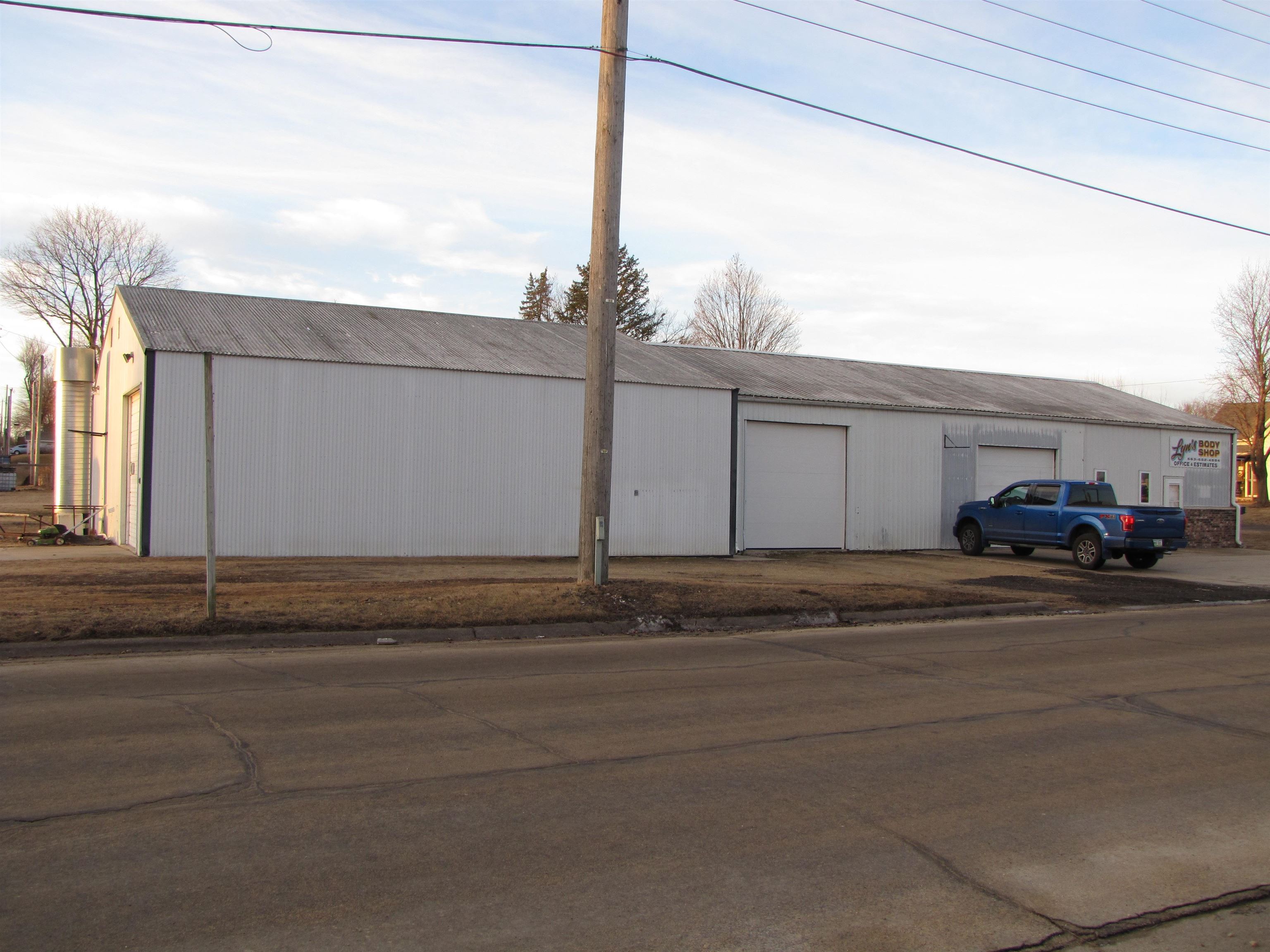 The building, situated on a corner lot, offers ample parking. It has functioned as an auto body shop for over 45 years. The structure encompasses approximately 3904 square feet. Upon entry, there is a sizable office area accompanied by two additional rooms suitable for offices or storage, as well as a half bath. The office furnace was replaced in December 2024. The shop area features a hoist and three overhead doors, one measuring 9 feet in height and two measuring 10 feet. A paint booth is equipped with bright lighting, heat, and a separate ventilation system. The paint booth can be removed to create a more open space. Additionally, the shop includes a tool/parts room. A bathroom is located in the back shop area, and storage spaces are available on both the main floor and above. Two 3-phase dual-stage air compressors are included with the property. The property offers a multitude of potential uses.