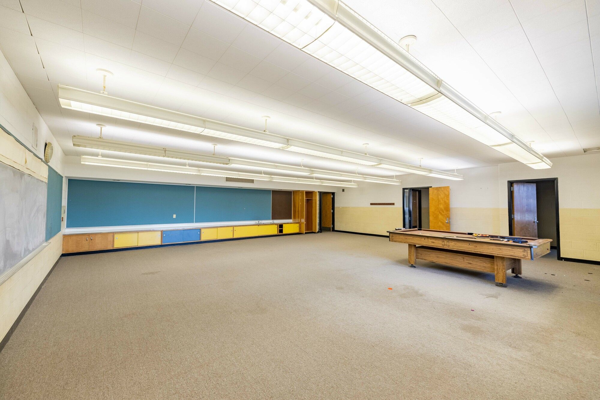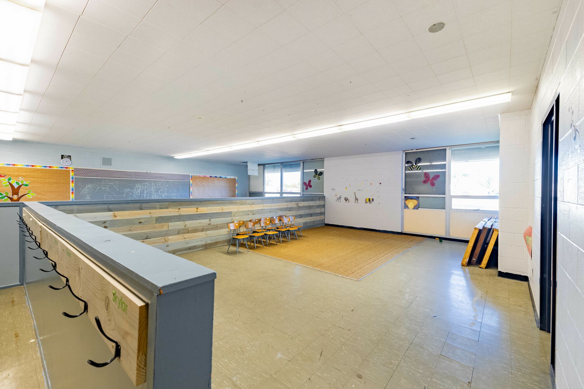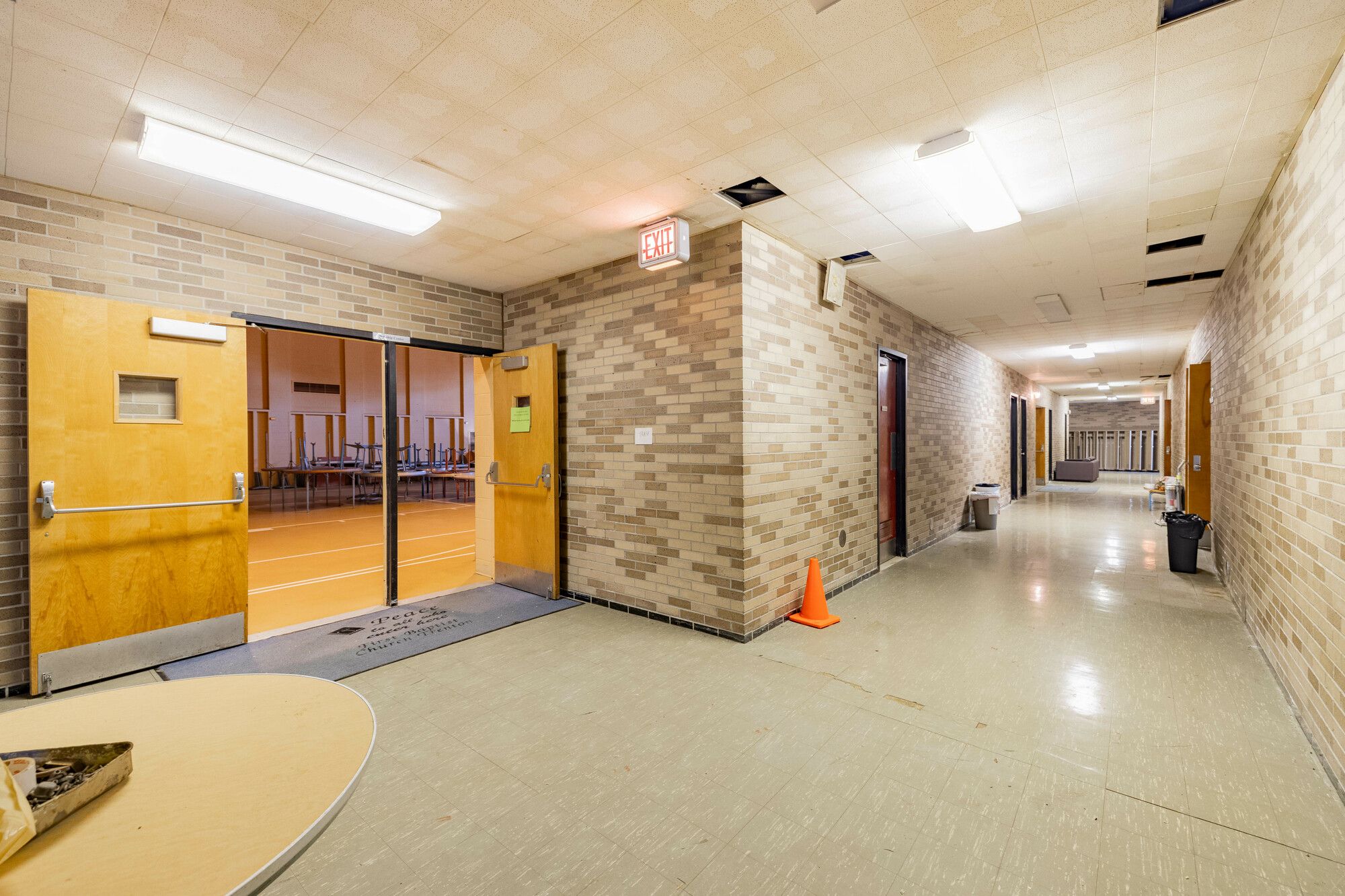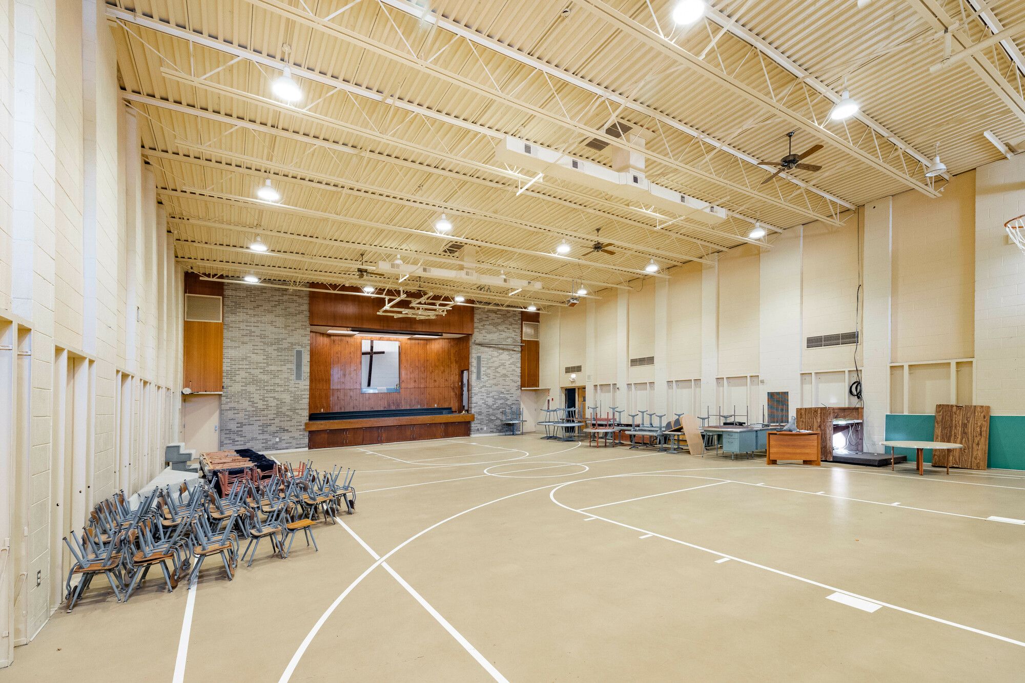 Former school building with classrooms, gymnasium, kitchen, and play yard.