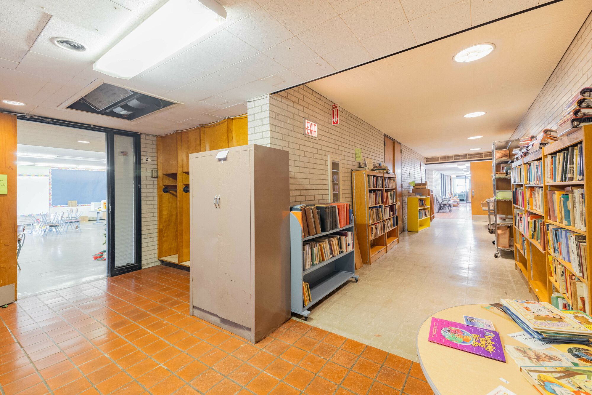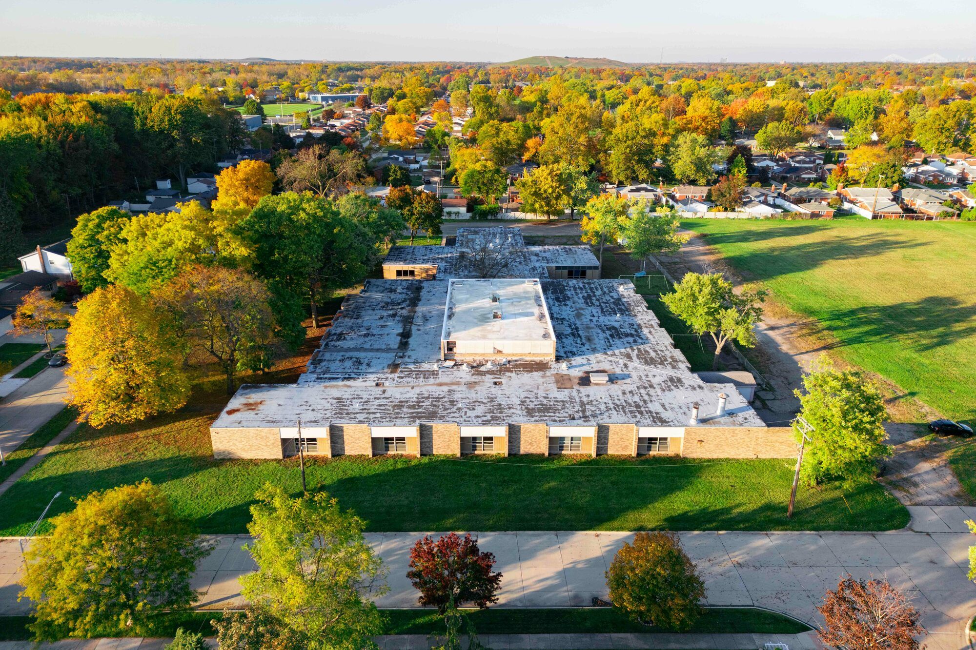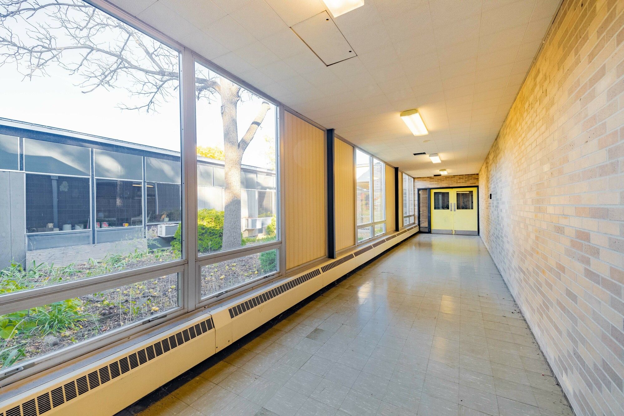 Former school building with classrooms, gymnasium, kitchen, and play yard.
