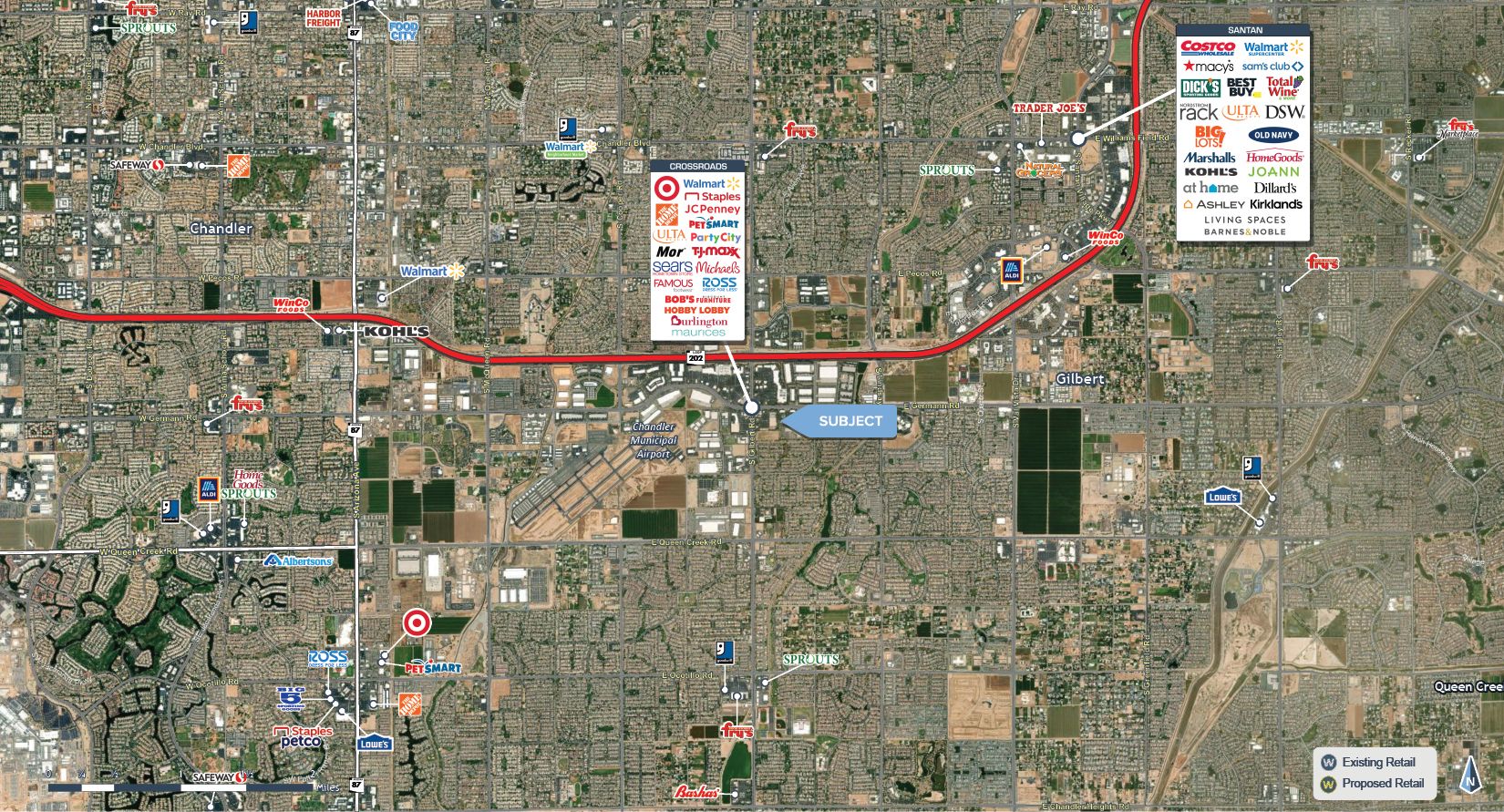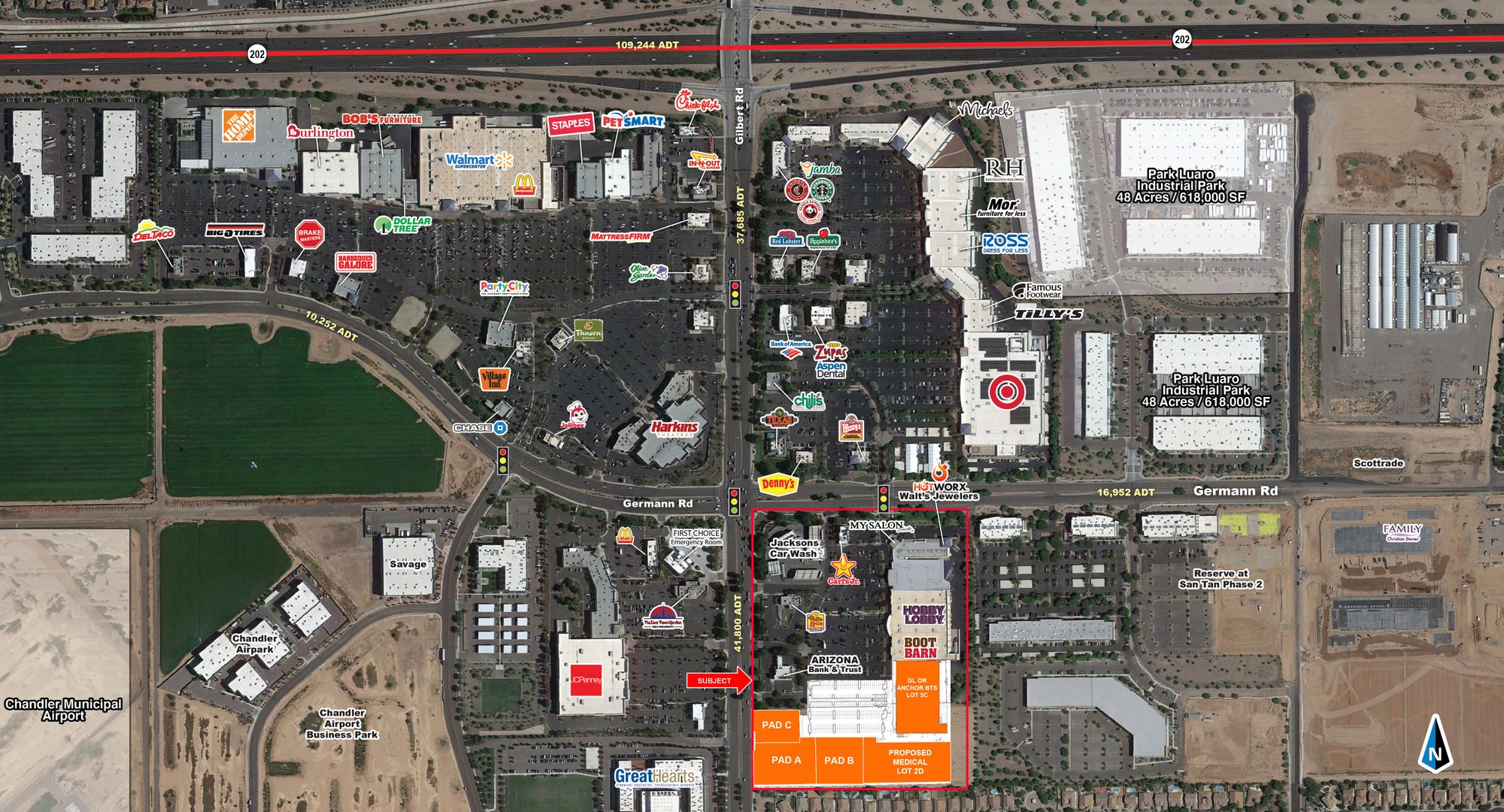 Retail spaces and pads available in Gilbert, Arizona.