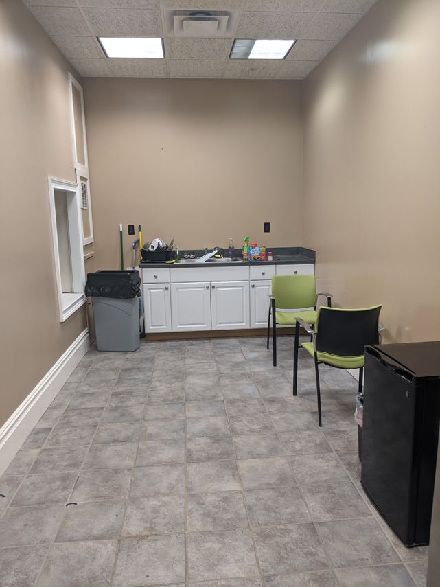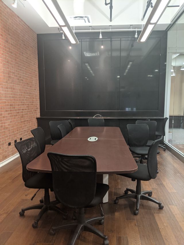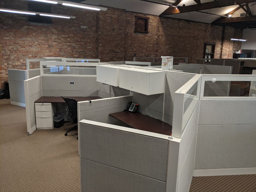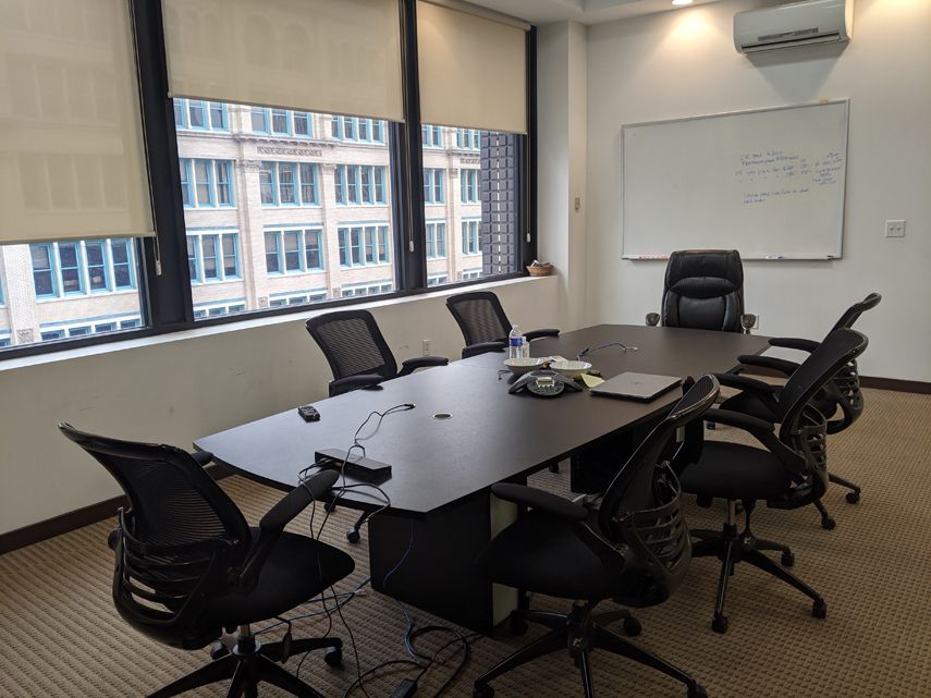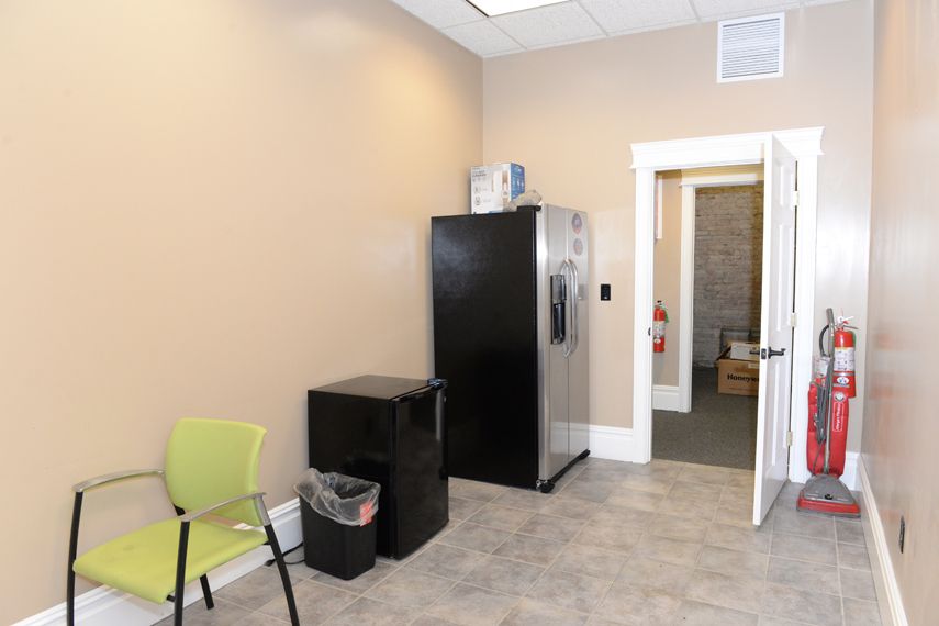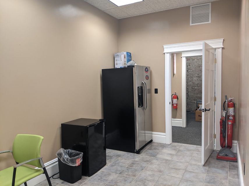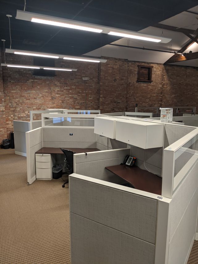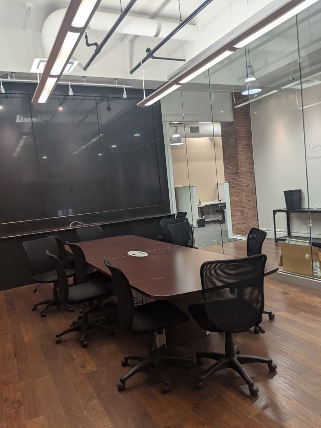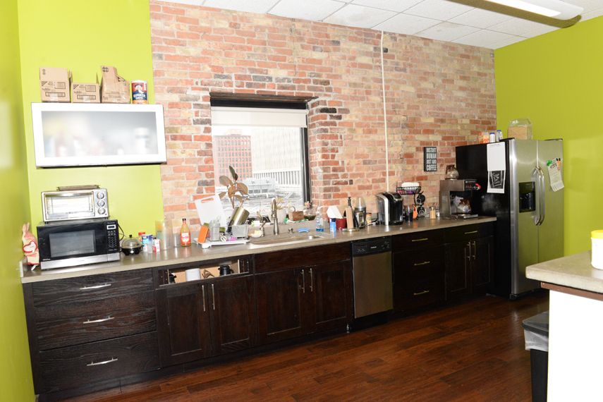 Loft-style office spaces with exposed brick, conference room, and kitchenette.