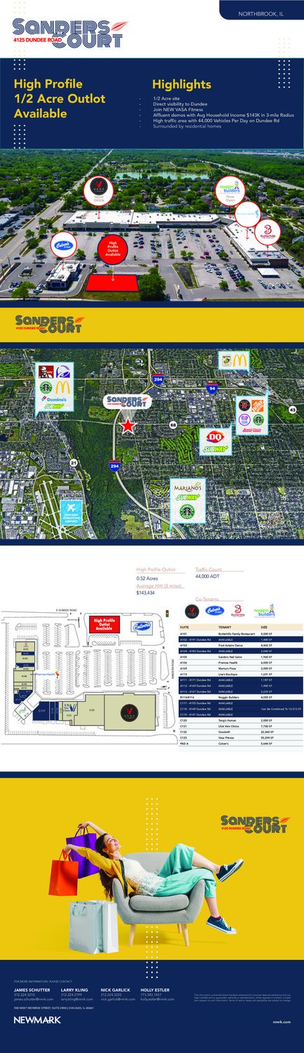 Multiple retail spaces are available for lease within the Sanders Center, situated at the stoplit corner of Dundee and Sanders in Northbrook, Illinois. The location benefits from high visibility and ample customer parking. The Sanders Center is positioned in a largely residential area and its co-tenants include Bank of America, USA Vein Clinics, Weight Watchers, Goodwill, and State Farm Insurance. Northbrook, located in the northern suburbs of Chicago, is suitable for both residents and businesses. Dundee Road is a busy thoroughfare in Northbrook, providing access across I-294 and the Potawatomi Woods in Wheeling. The shopping center is located at the corner of Dundee and Sanders.