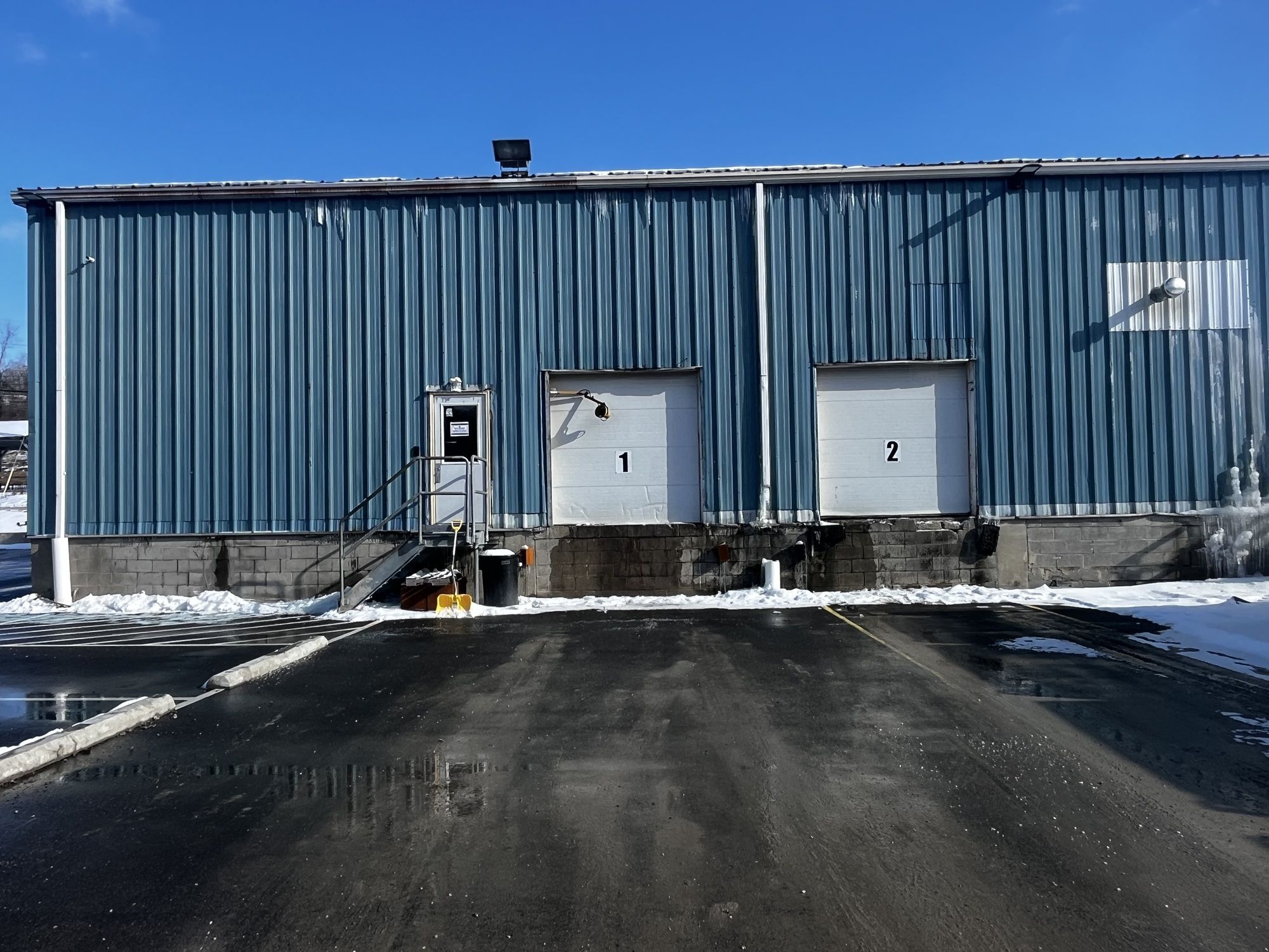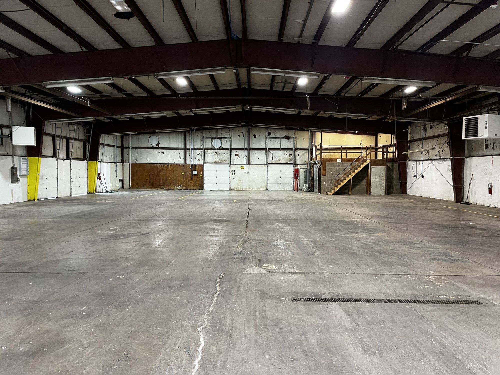 Industrial building featuring dock doors, drive-in door, and rail access.