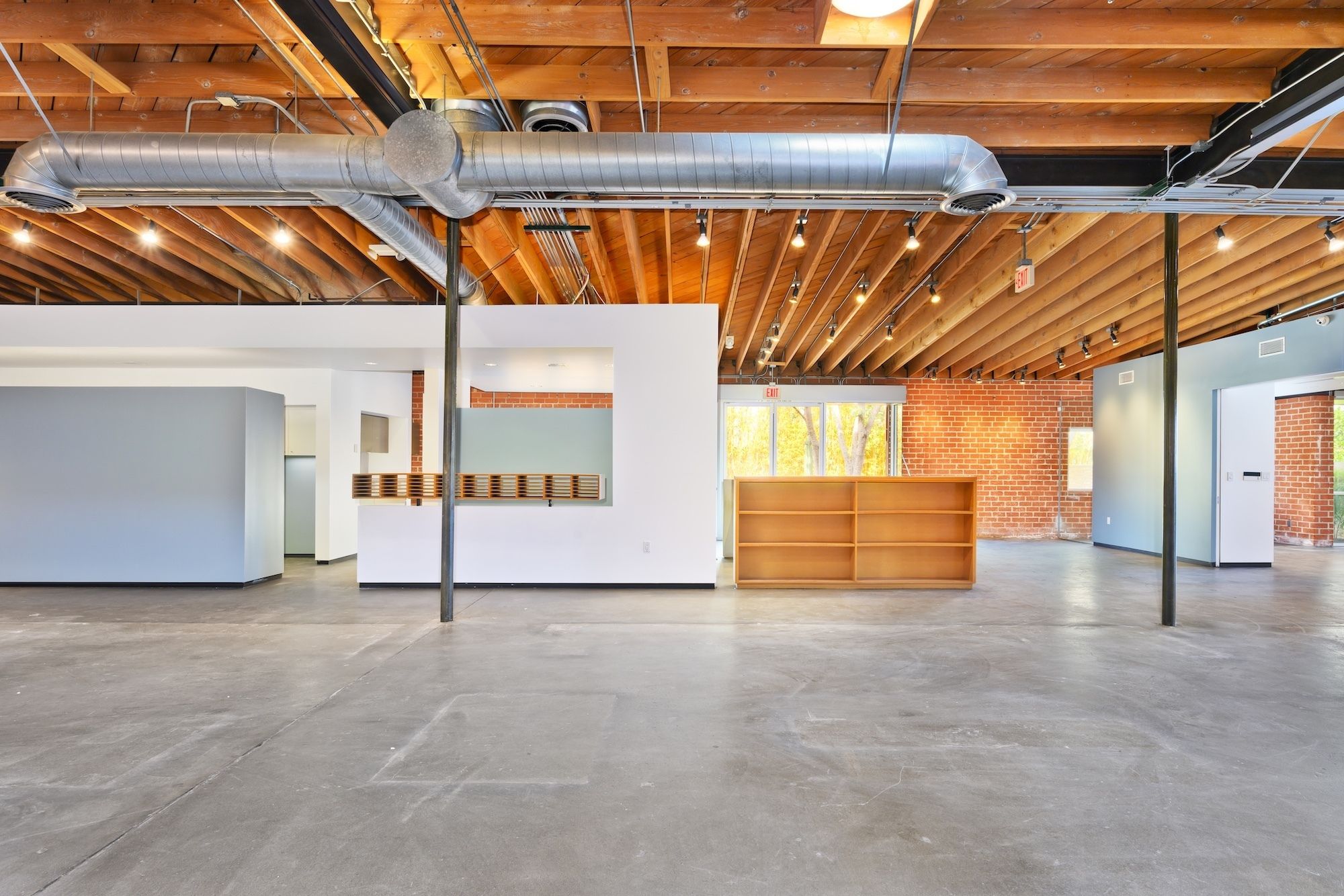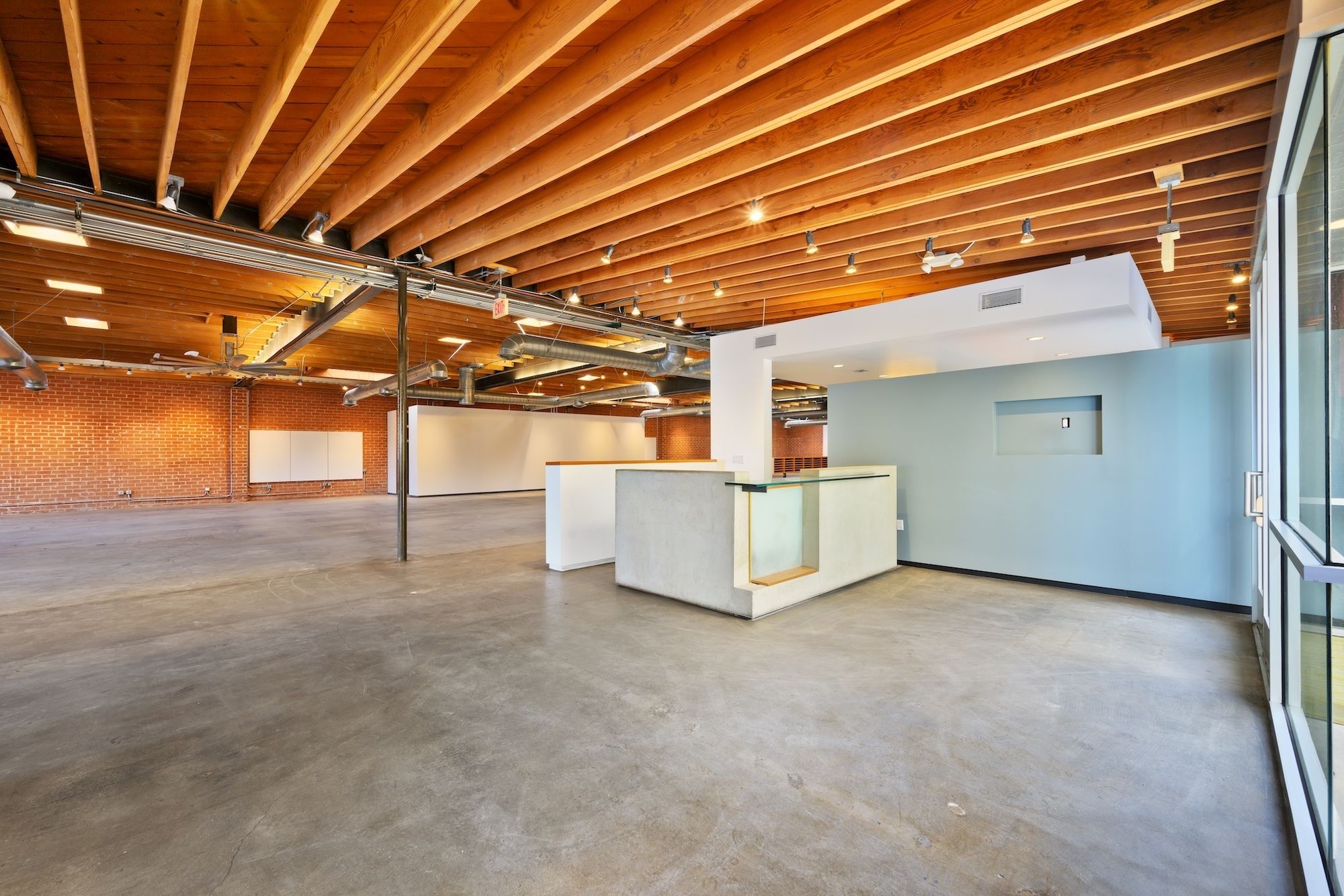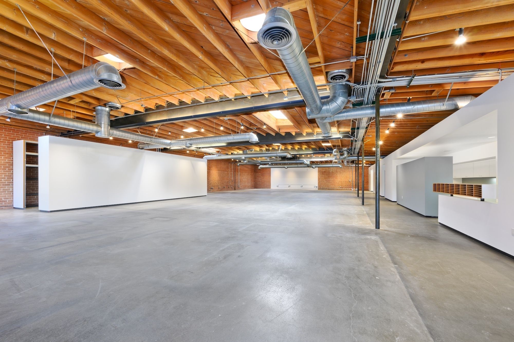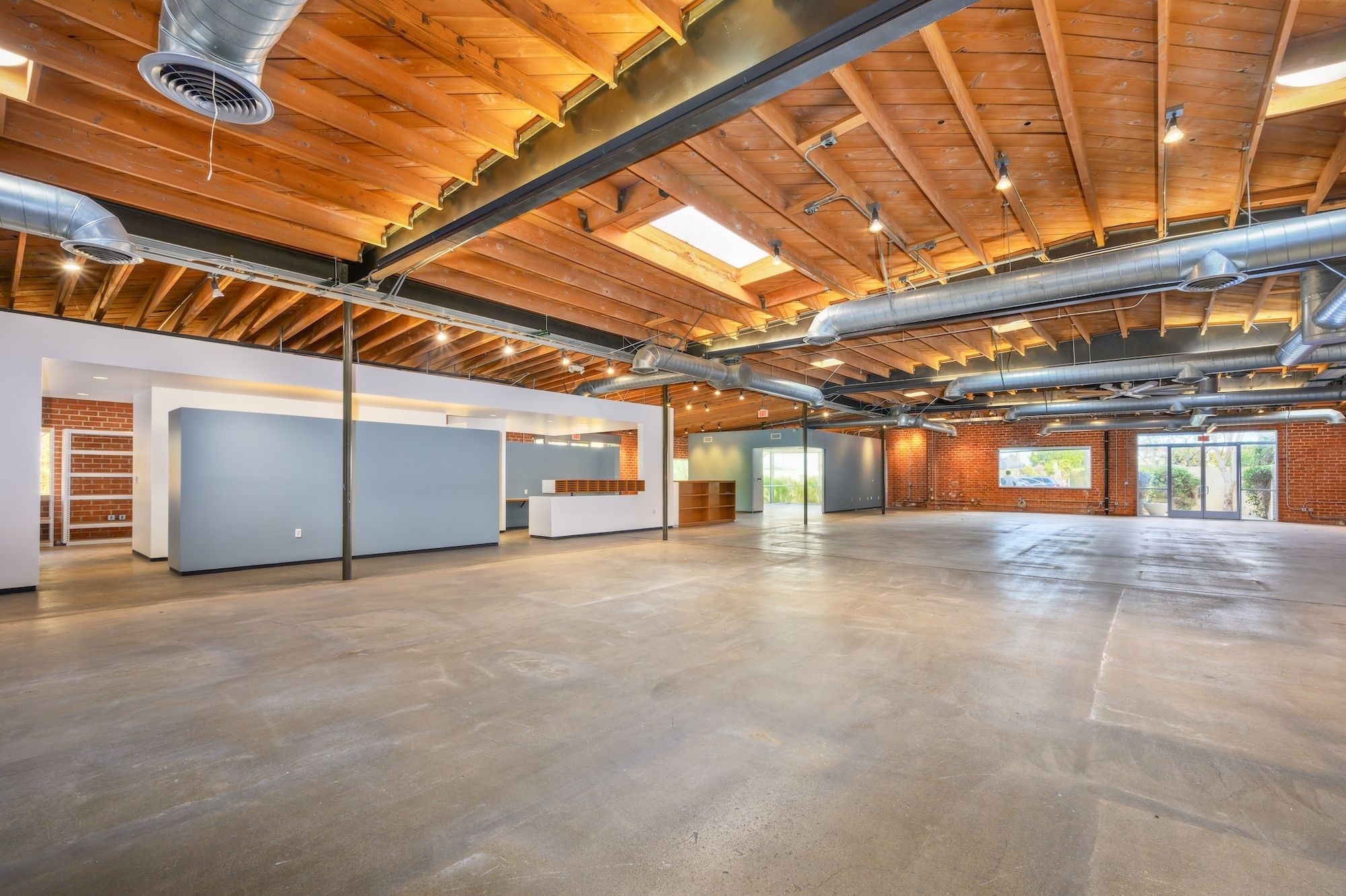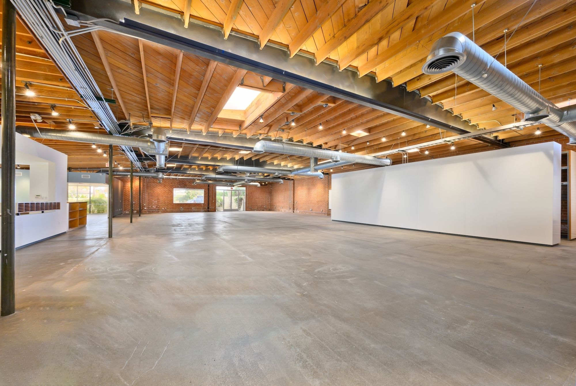 Open creative/flex space with exposed ceilings and skylights for rent.