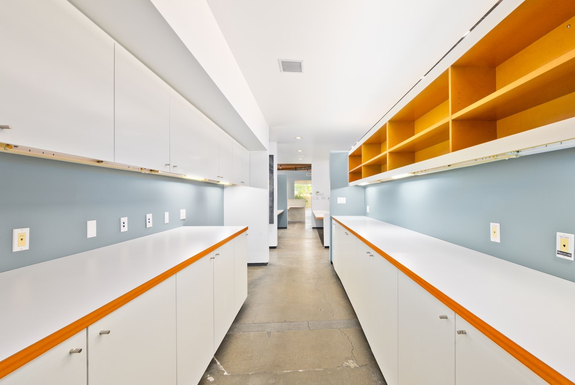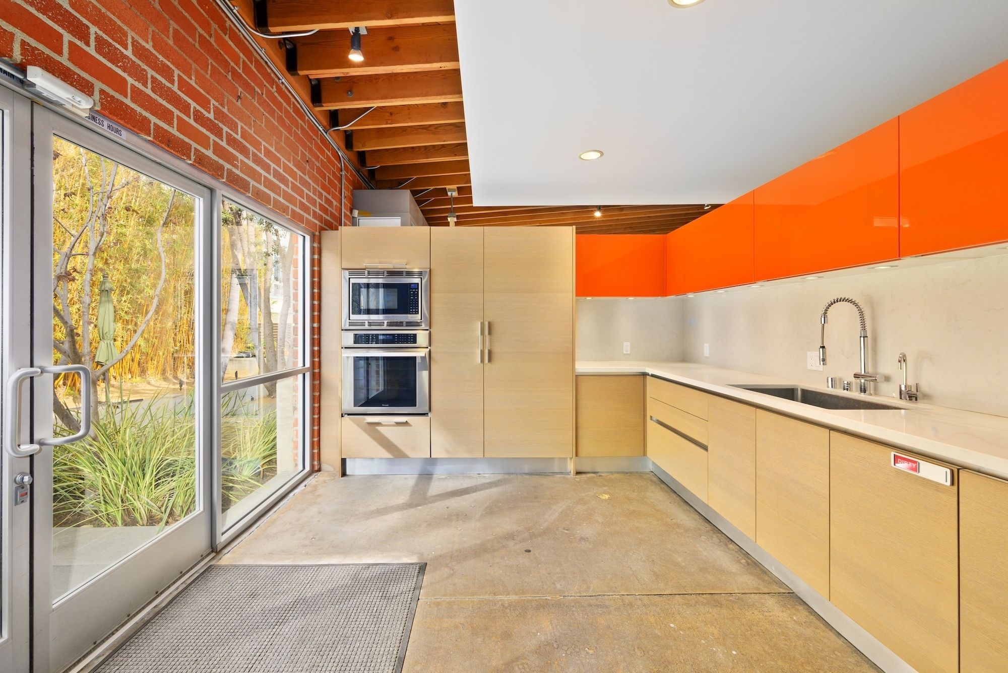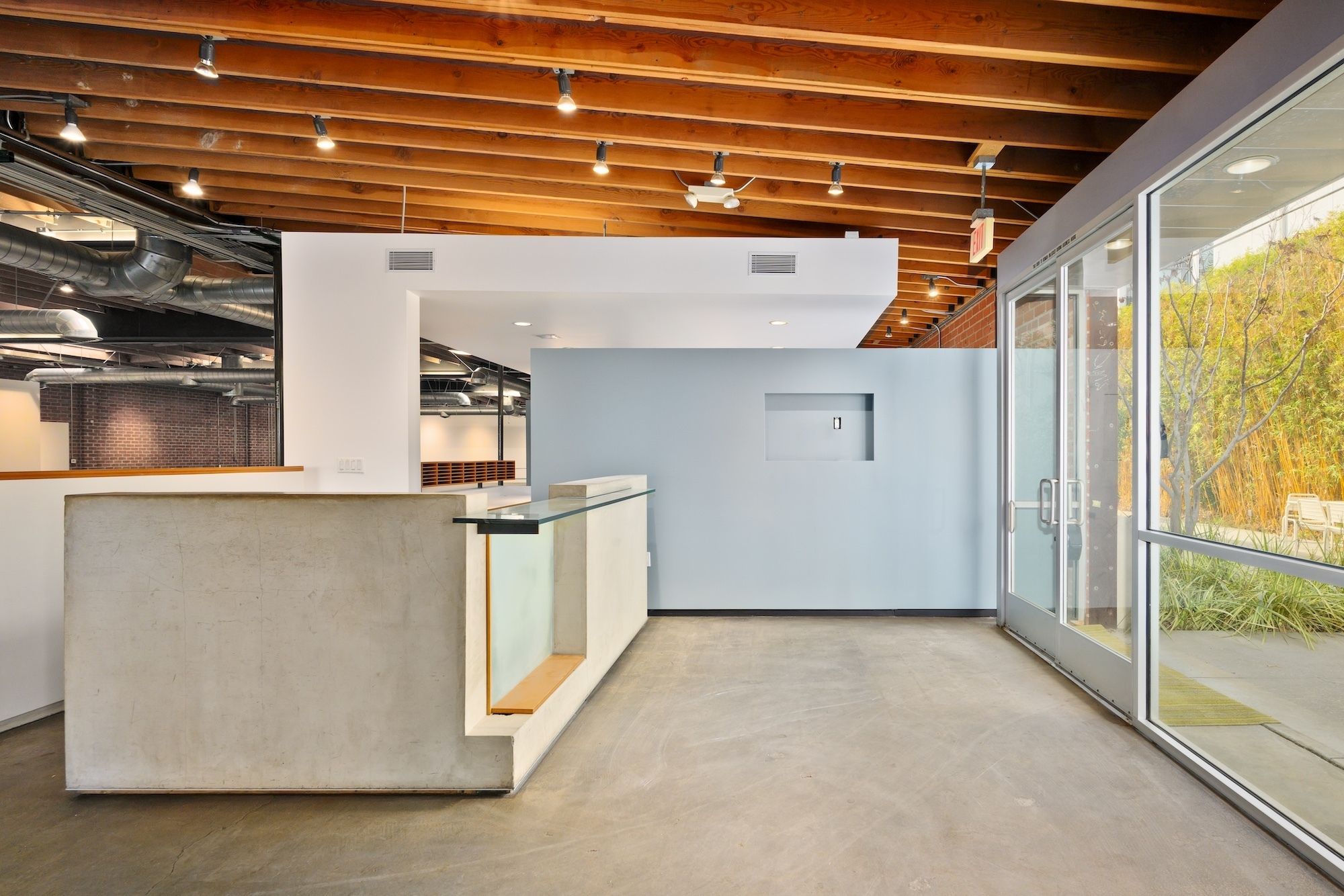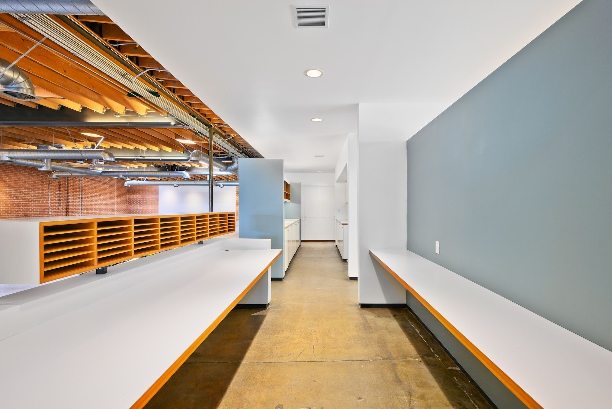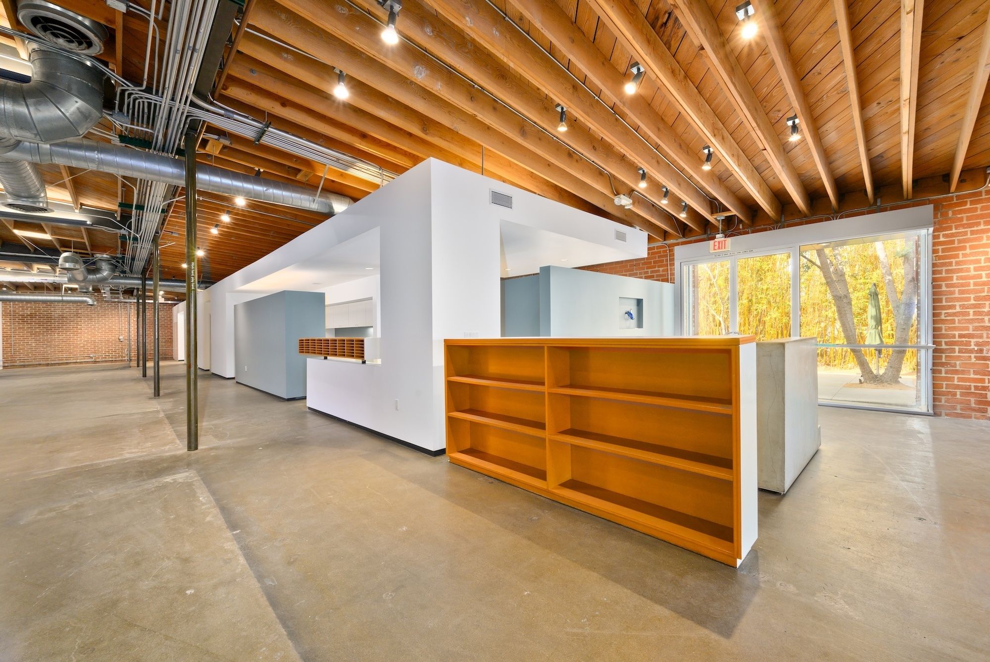 Open creative/flex space with exposed ceilings and skylights for rent.