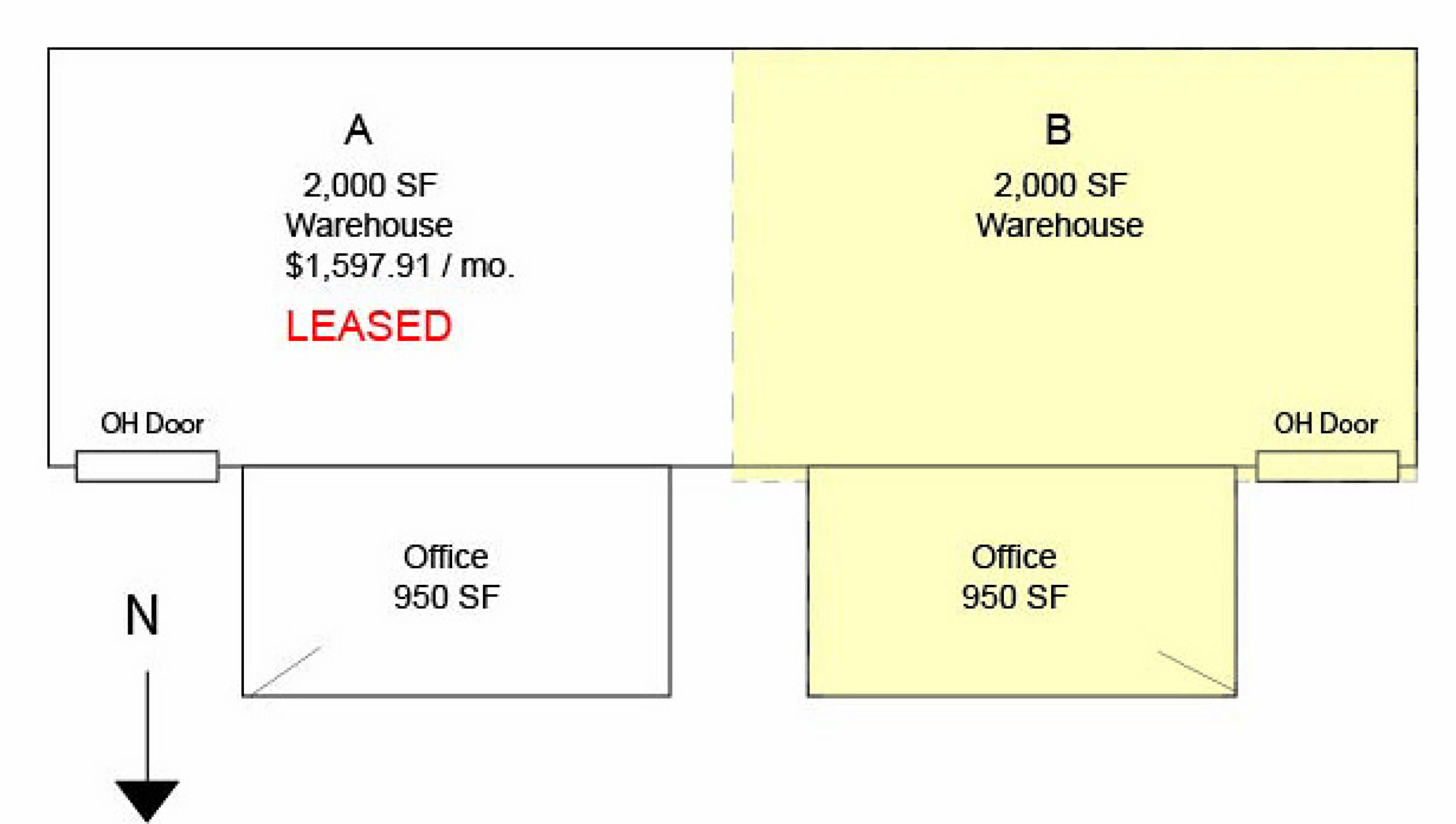 Industrial duplex with office/showroom and warehouse space for rent.