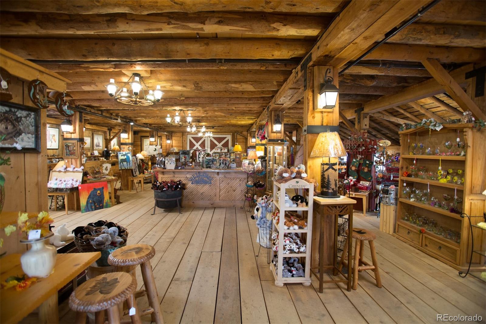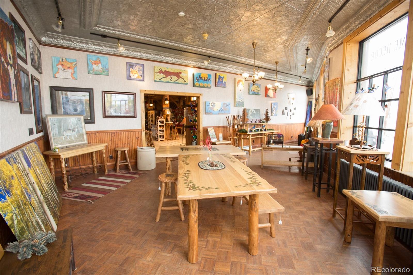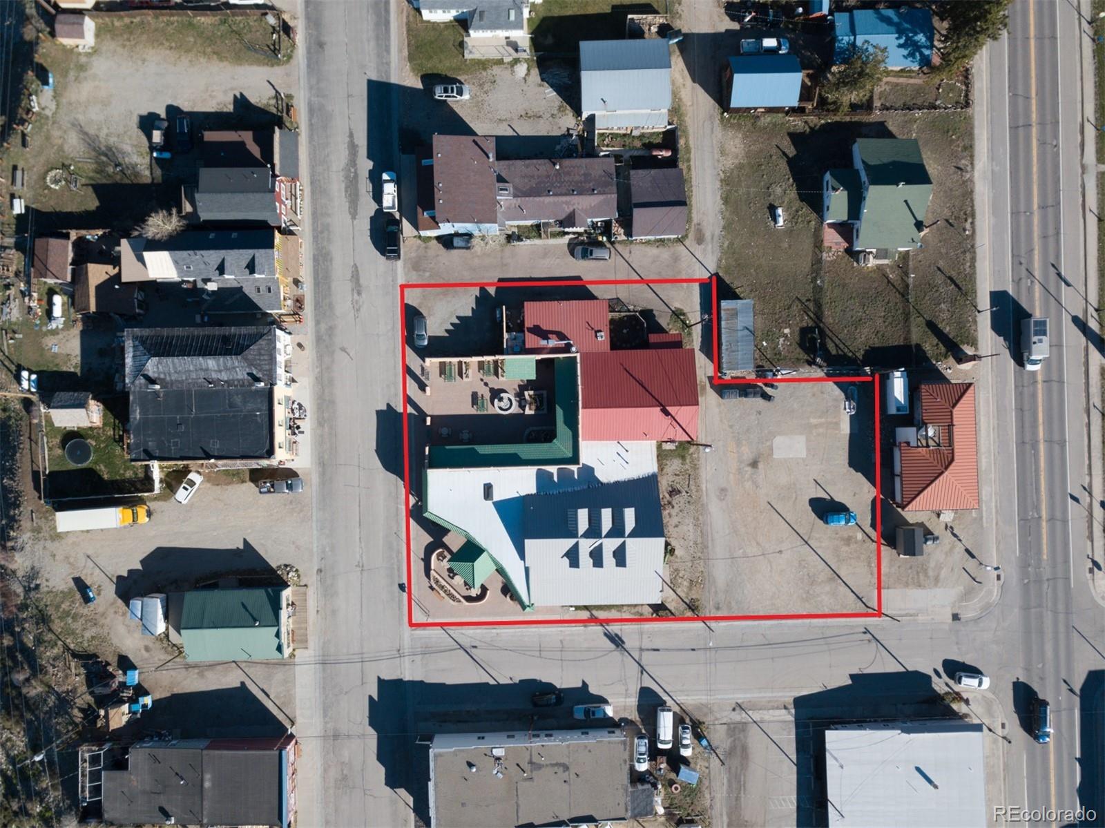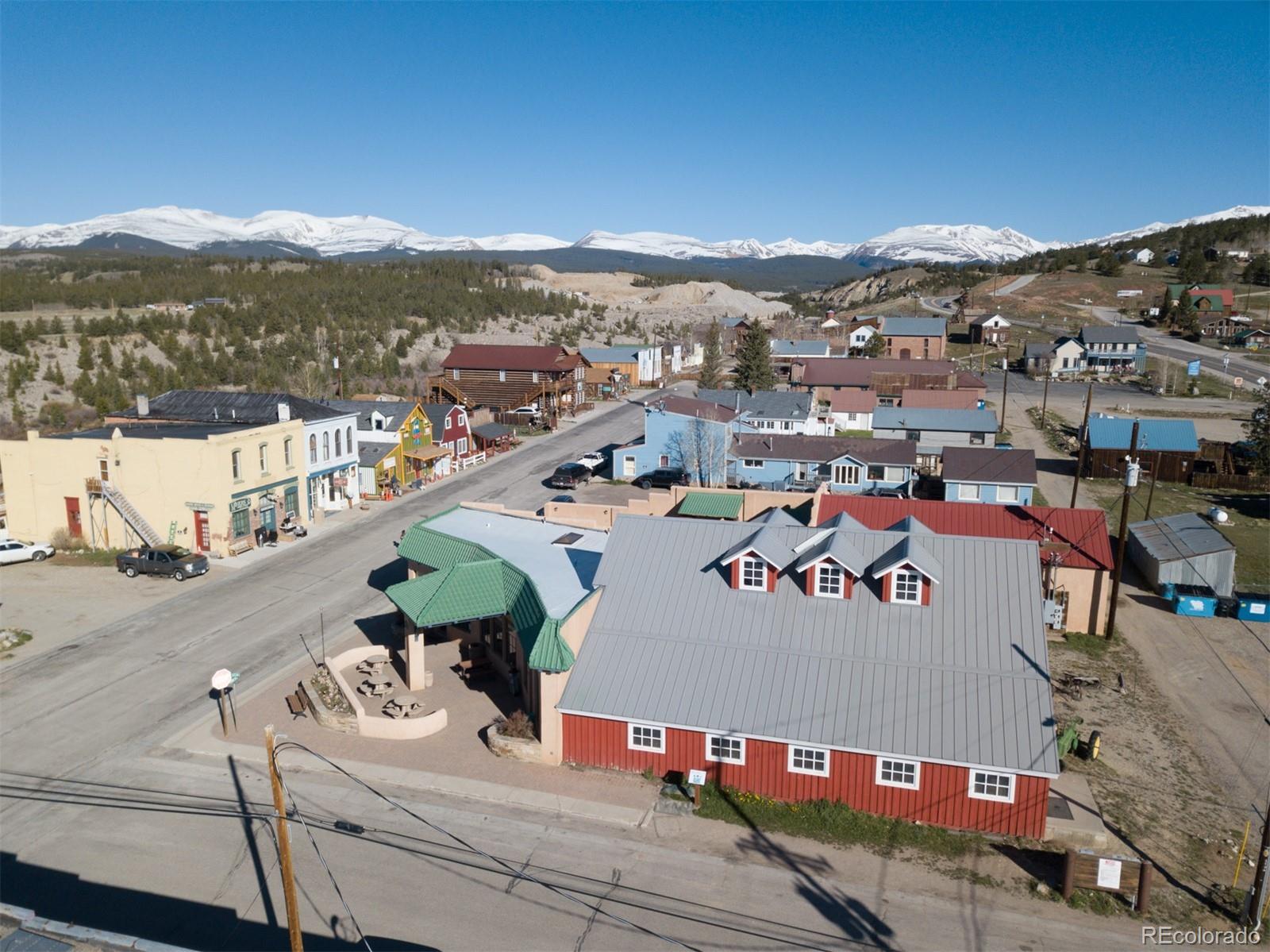 Located at the corner of historic Front Street and 5th Street in Fairplay, Colorado, this property features a century-old livery barn that has been reimagined, along with two adjacent spaces. The building houses three separate businesses. The Old Red Barn, with rustic wood floors and beams, serves as a retail space for art, gifts, and furnishings, featuring two levels, two private bathrooms, a mechanical room, and storage. The Silver Scoop Creamery is a local favorite serving lunch, ice cream, and fresh baked goods, with tin-plated ceilings, crown molding, a custom-designed bar, antique decor, a full prep kitchen with dish station, ovens, and coolers, and two private bathrooms. Patio seating is available in the front, along with a courtyard with a seasonal fountain and seating for outdoor dining in front of the restaurant space, which is currently vacant. The restaurant has vaulted ceilings with beams and metal accents, a custom-built bar, two private bathrooms, a chef's kitchen including a commercial hood ventilation system, a walk-in cooler, and a full dish station. There is also a private office and a storage warehouse area with a delivery bay. The property size is 9587 square feet.