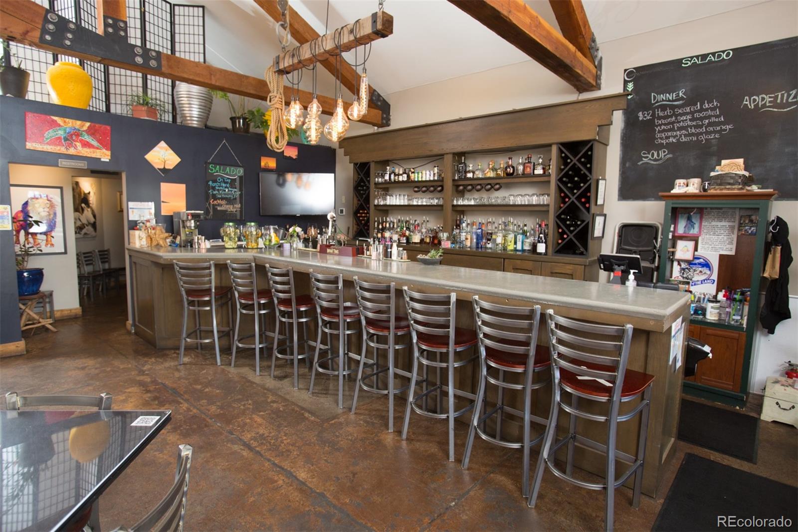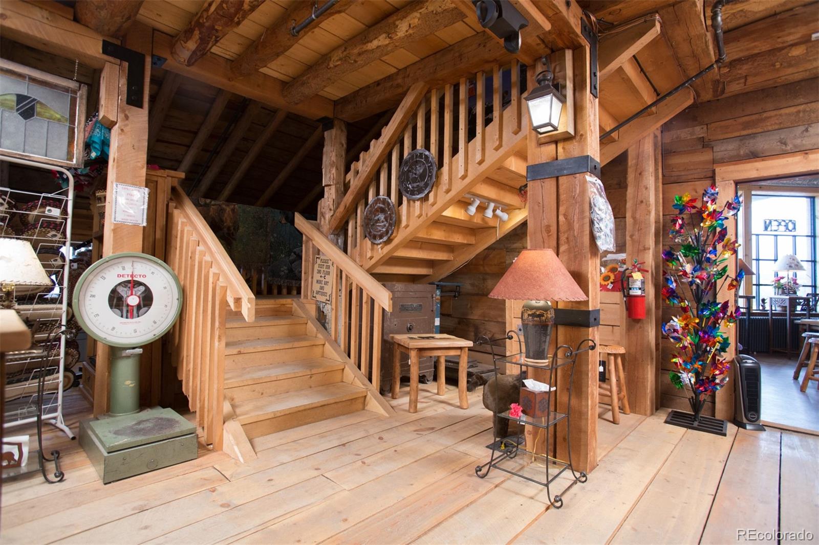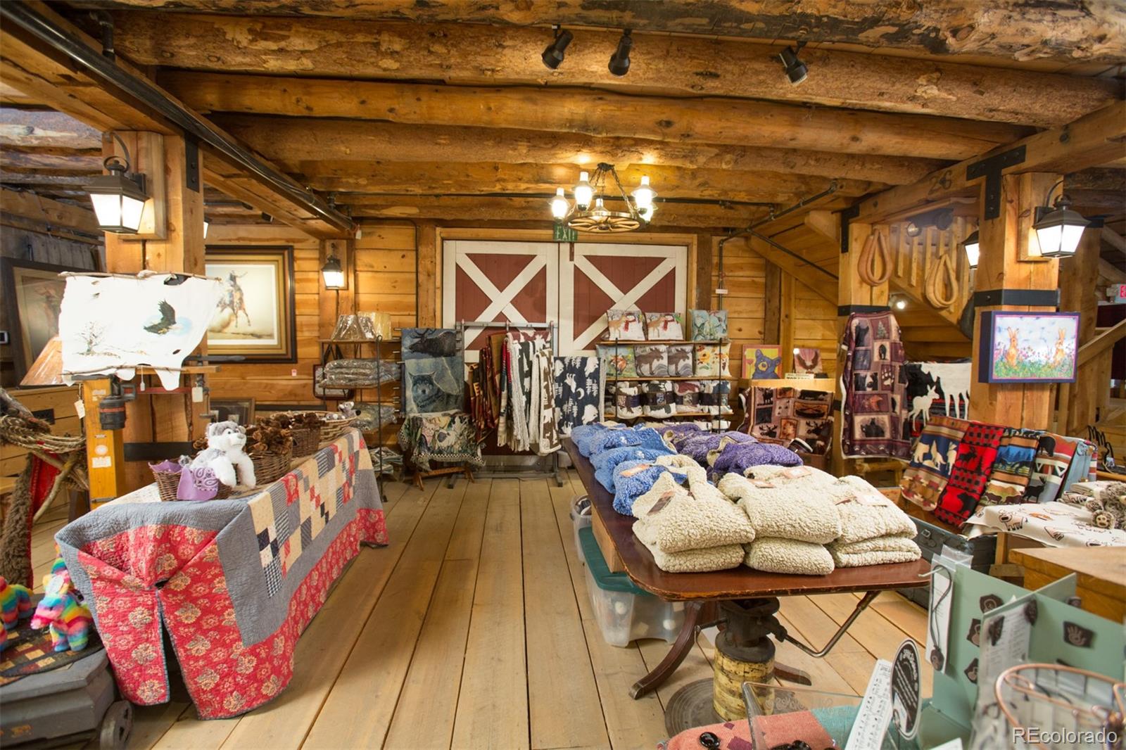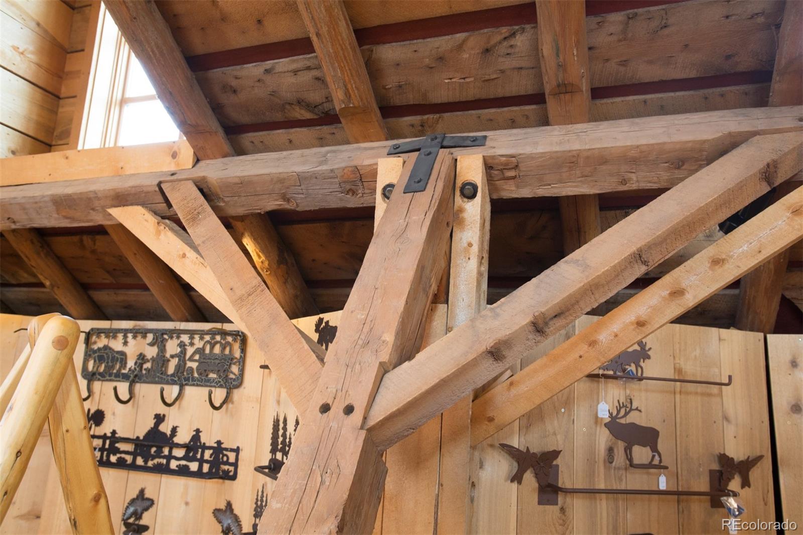 Located at the corner of historic Front Street and 5th Street in Fairplay, Colorado, this property features a century-old livery barn that has been reimagined, along with two adjacent spaces. The building houses three separate businesses. The Old Red Barn, with rustic wood floors and beams, serves as a retail space for art, gifts, and furnishings, featuring two levels, two private bathrooms, a mechanical room, and storage. The Silver Scoop Creamery is a local favorite serving lunch, ice cream, and fresh baked goods, with tin-plated ceilings, crown molding, a custom-designed bar, antique decor, a full prep kitchen with dish station, ovens, and coolers, and two private bathrooms. Patio seating is available in the front, along with a courtyard with a seasonal fountain and seating for outdoor dining in front of the restaurant space, which is currently vacant. The restaurant has vaulted ceilings with beams and metal accents, a custom-built bar, two private bathrooms, a chef's kitchen including a commercial hood ventilation system, a walk-in cooler, and a full dish station. There is also a private office and a storage warehouse area with a delivery bay. The property size is 9587 square feet.
